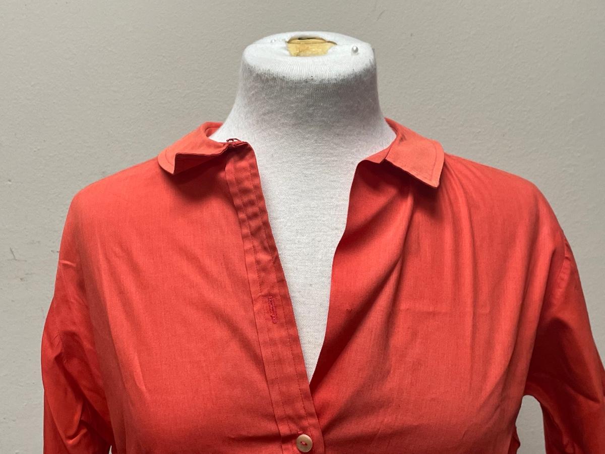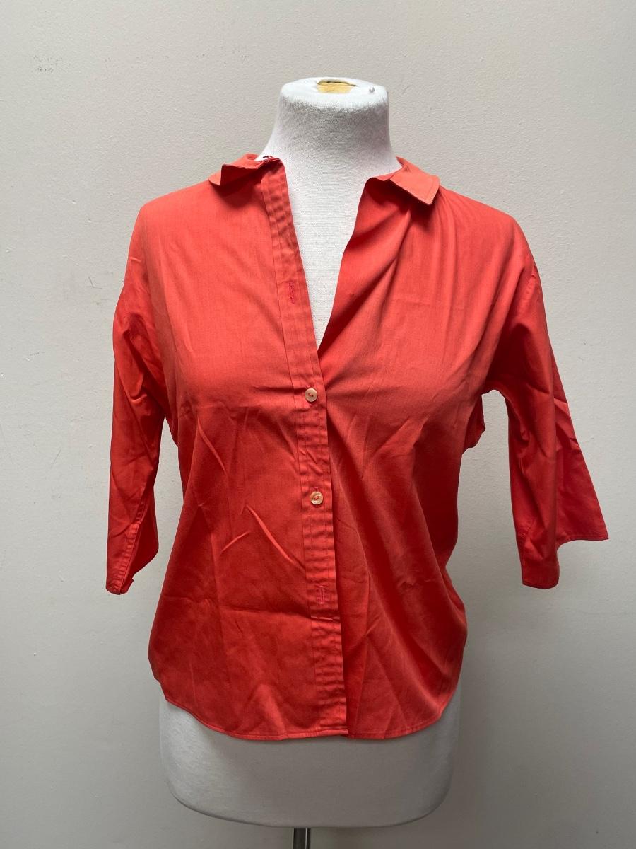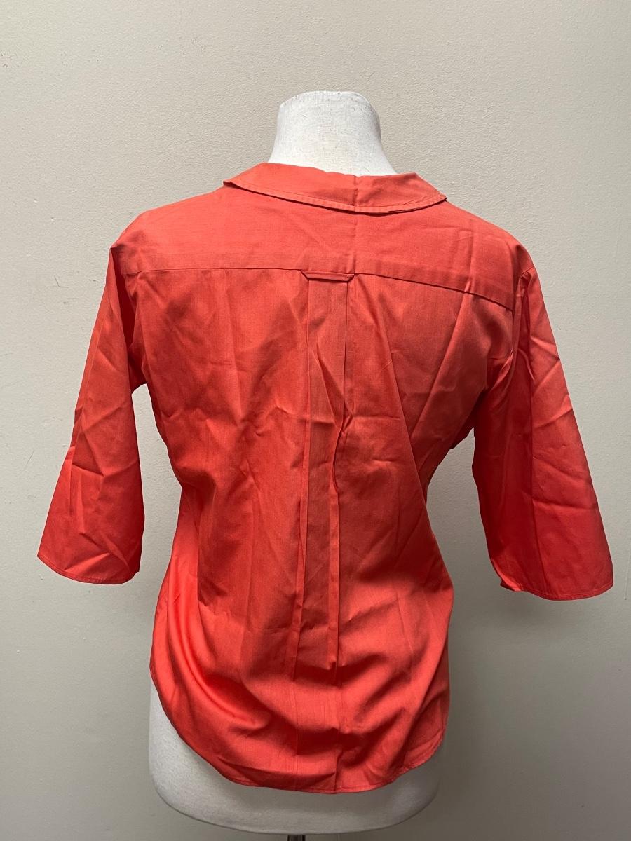 The shirt is in decent condition. It is missing two buttons: one on the very top and one on the way bottom. It is wrinkled due to being folded. There isn’t any tags on the shirt but it seems to fit a small or medium.