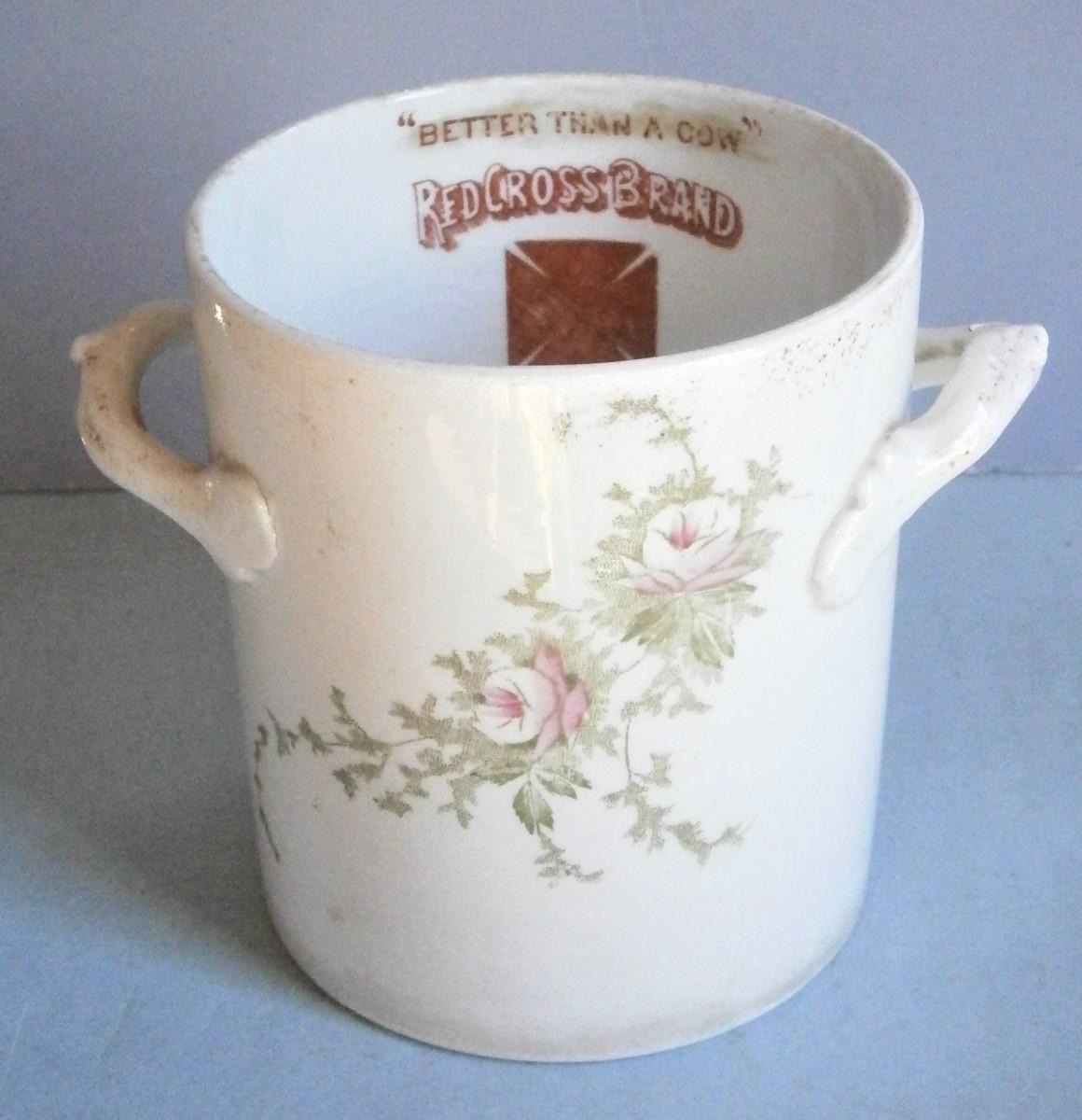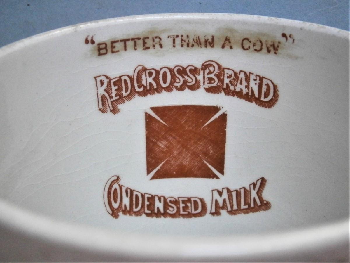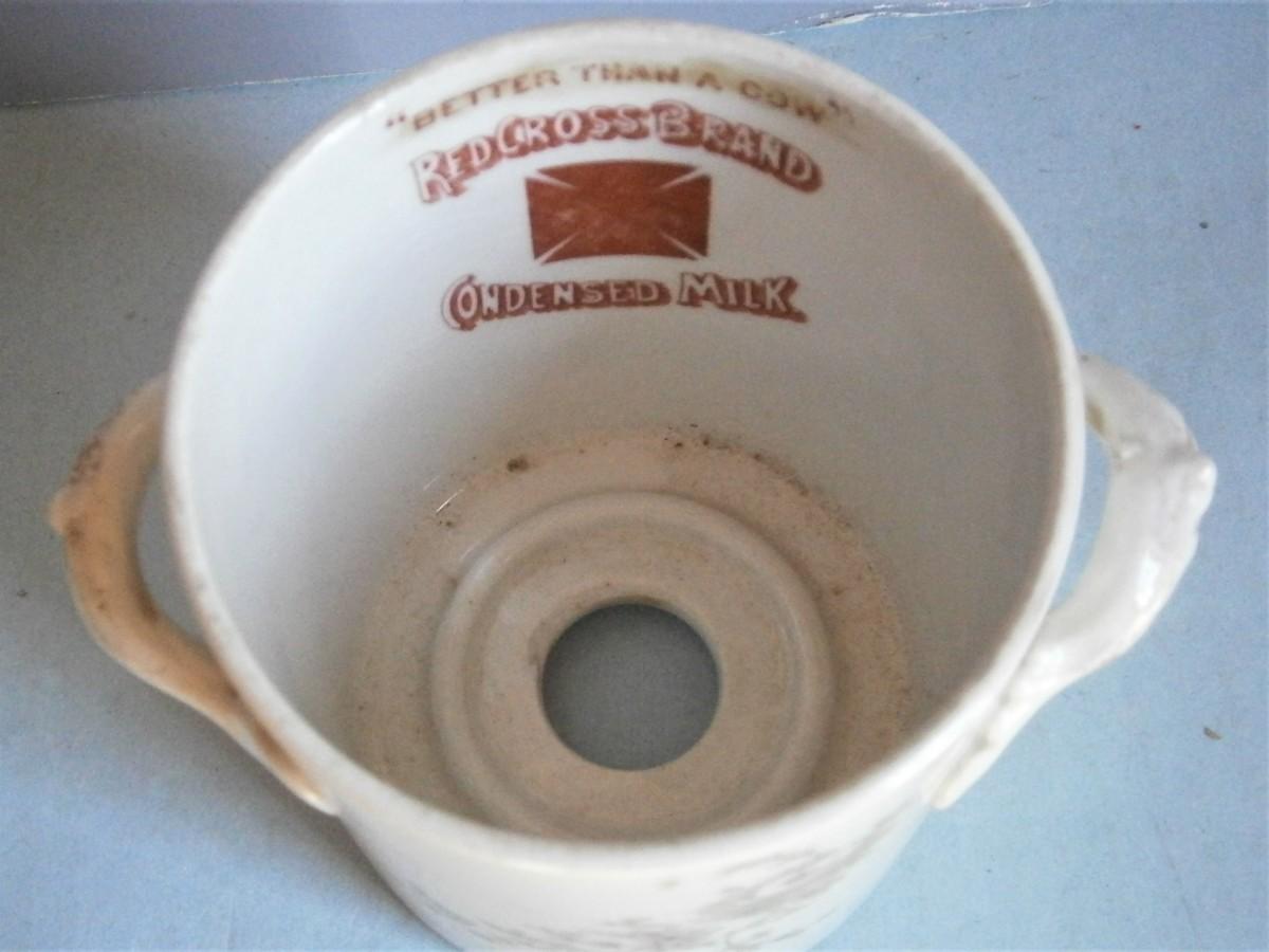 RED CROSS BRAND Condensed Milk Can Holder from the early 1900's, 4 in. tall, porcelain.