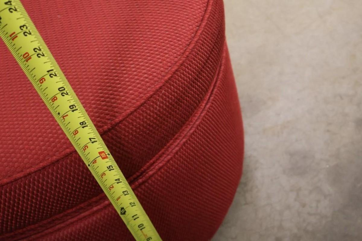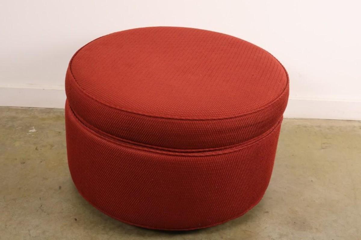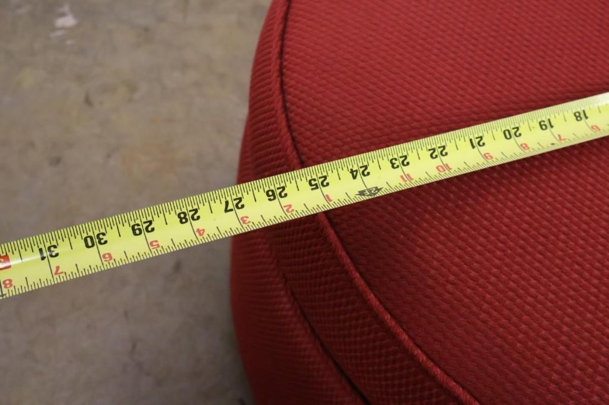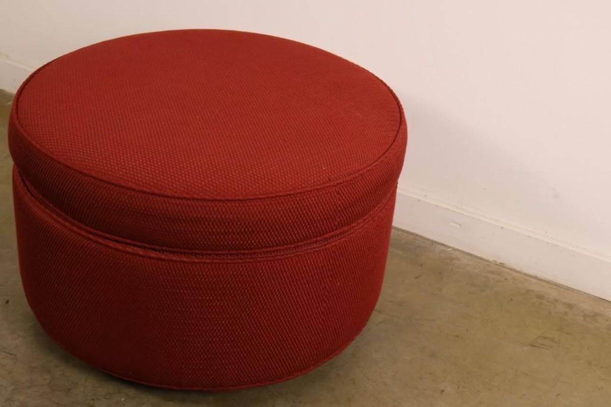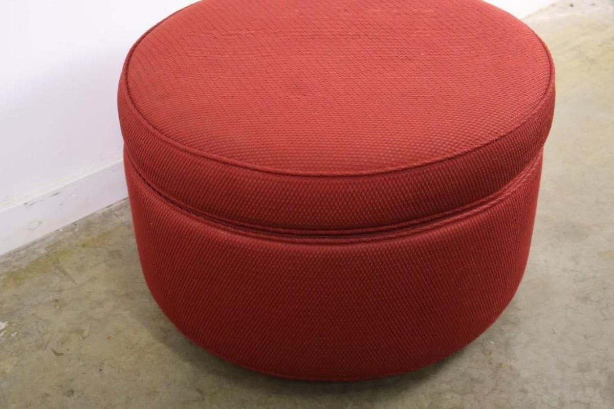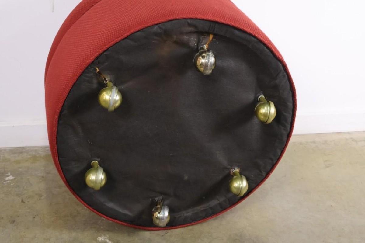 Red Custom Upholstered Ottoman on Brass Casters, excellent condition.  25" diameter x 17" high.