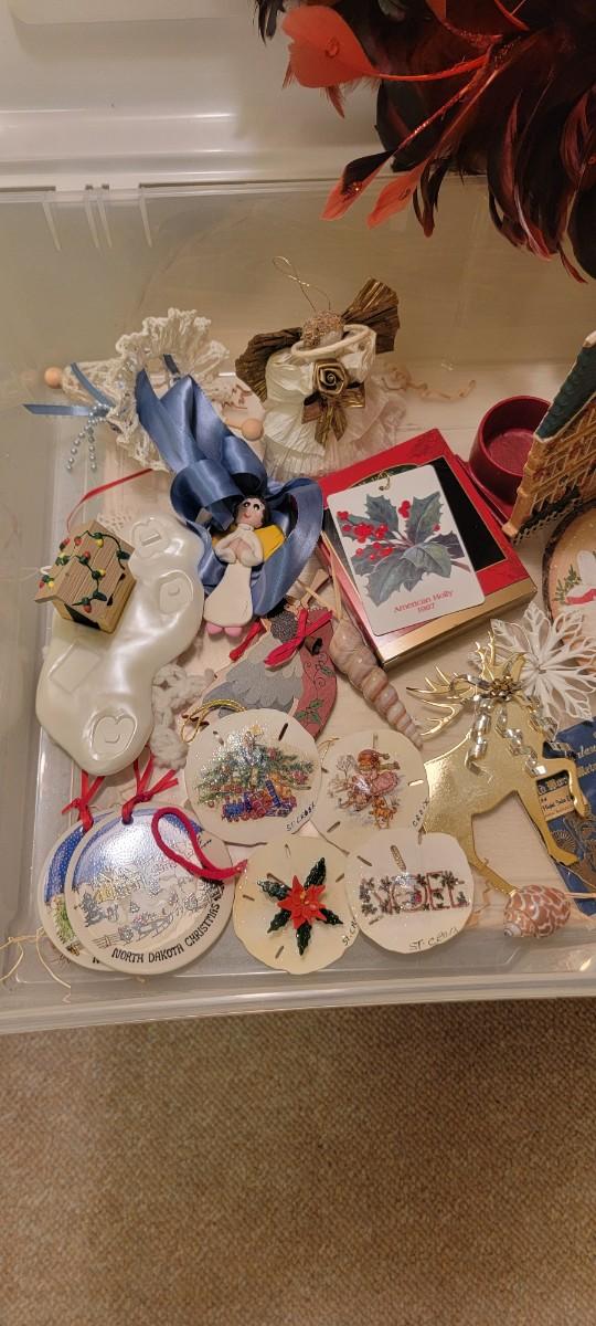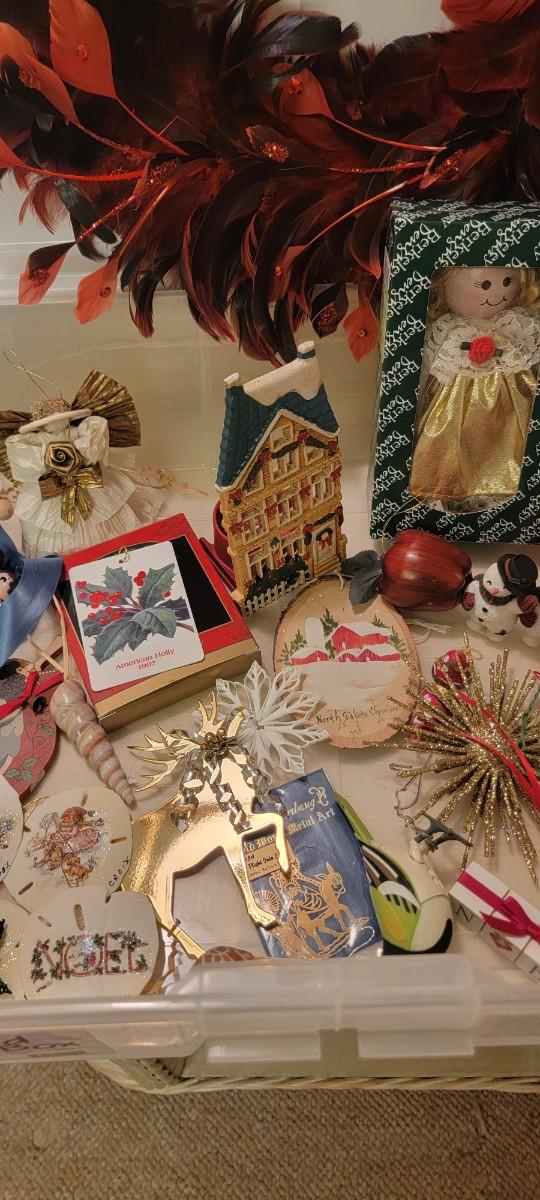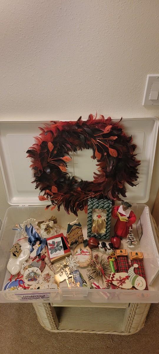 Cool red feather wreath! Miscellaneous fun holiday items in tote!