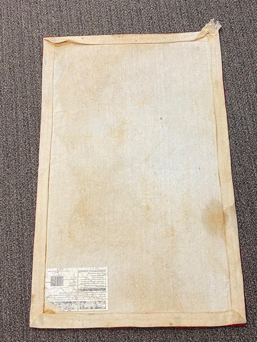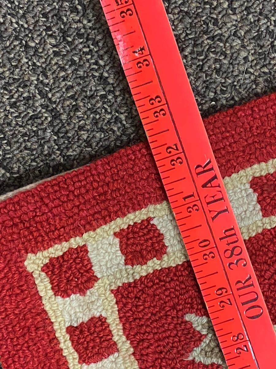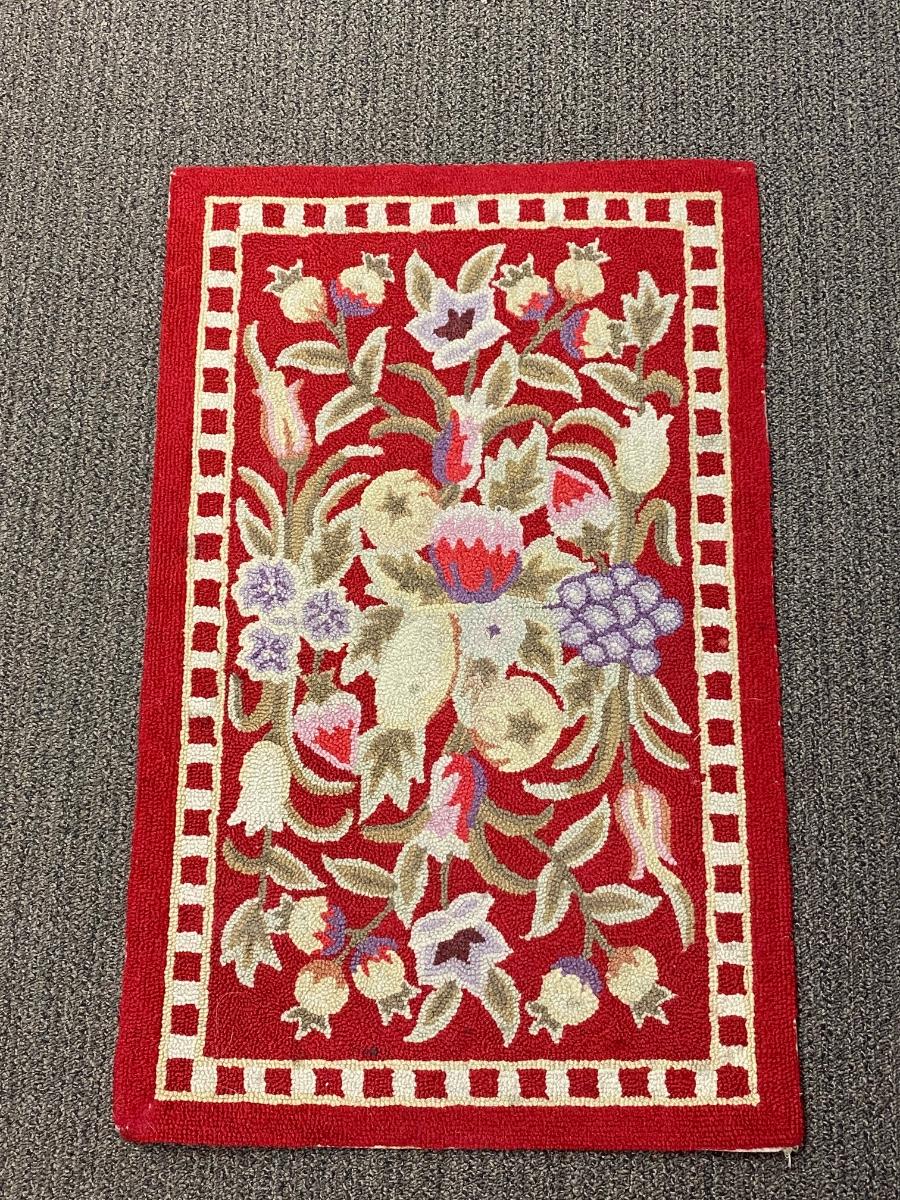 Floral red door mat. In fair condition, could use a cleaning. Just under 3'x2' size.