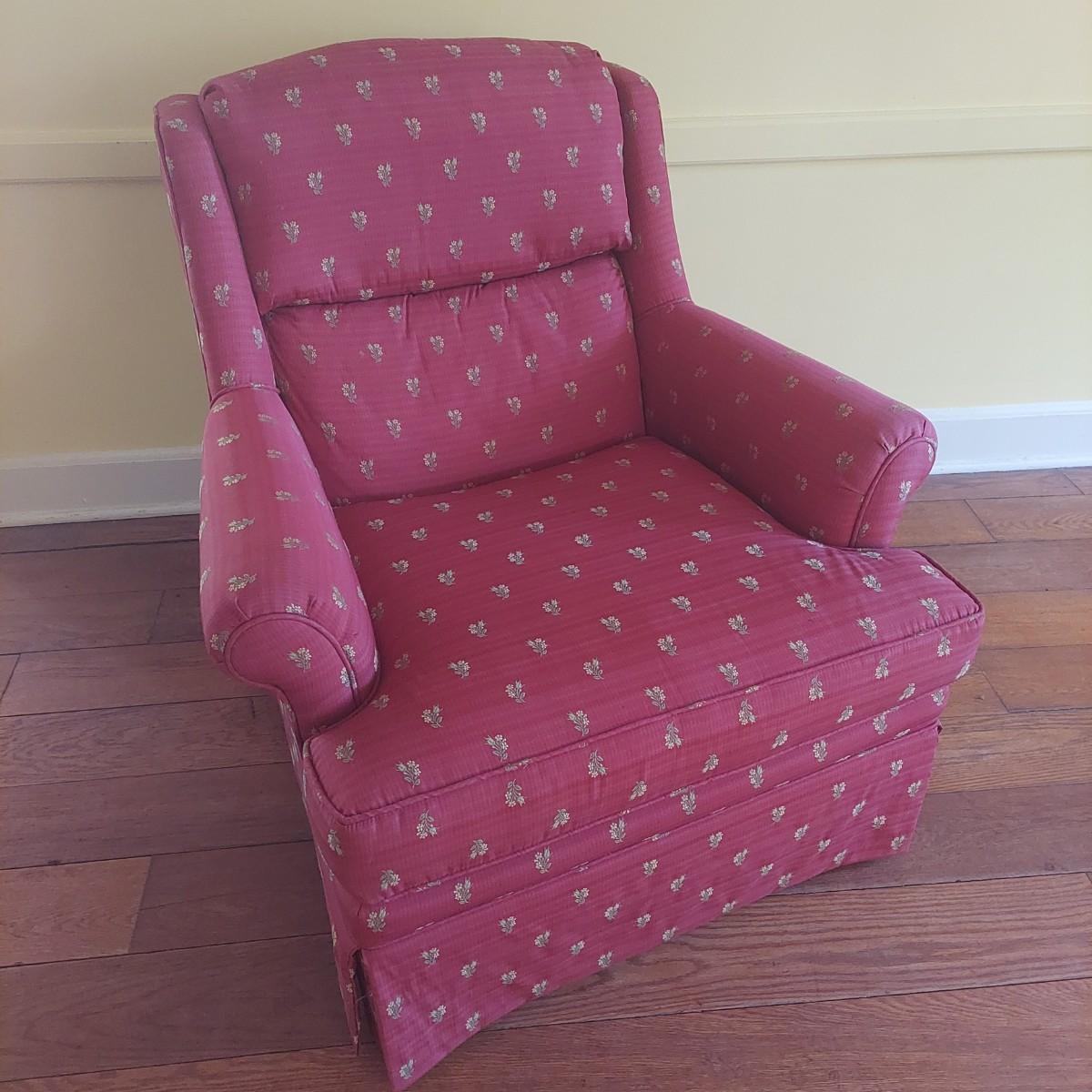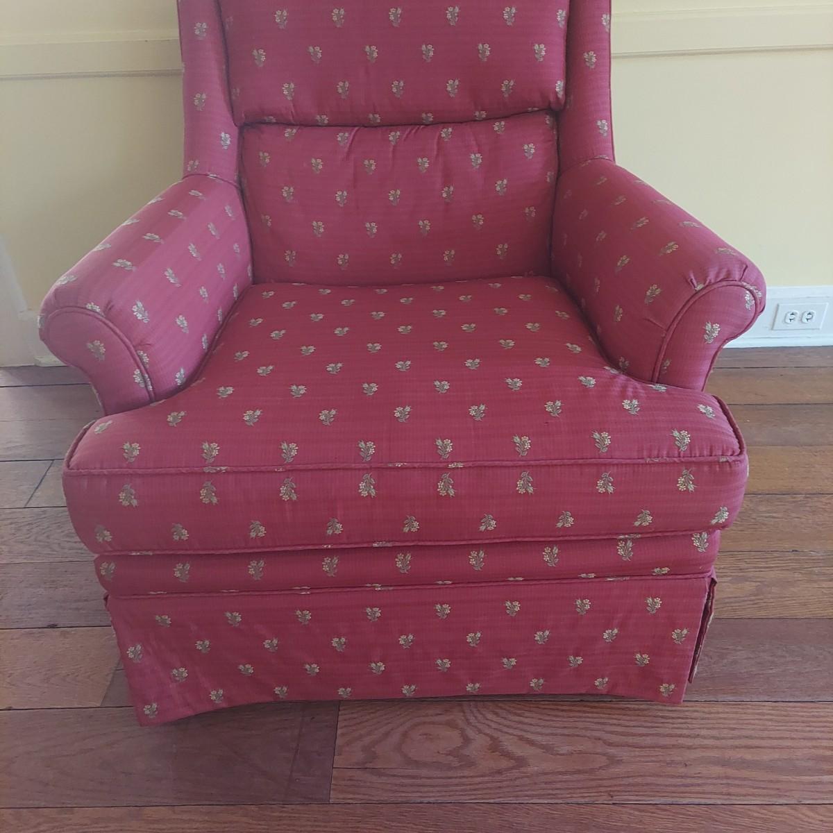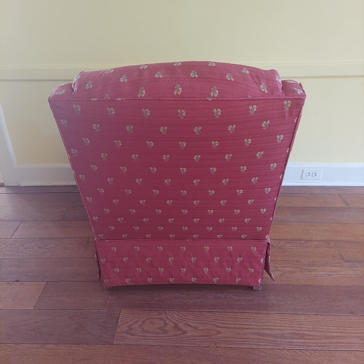 French Provincial style skirted red armchair with yellow floral print. Chair measures approximately 35" x 36" x 33"H with a seat height of 18"H. Local Pickup Only.