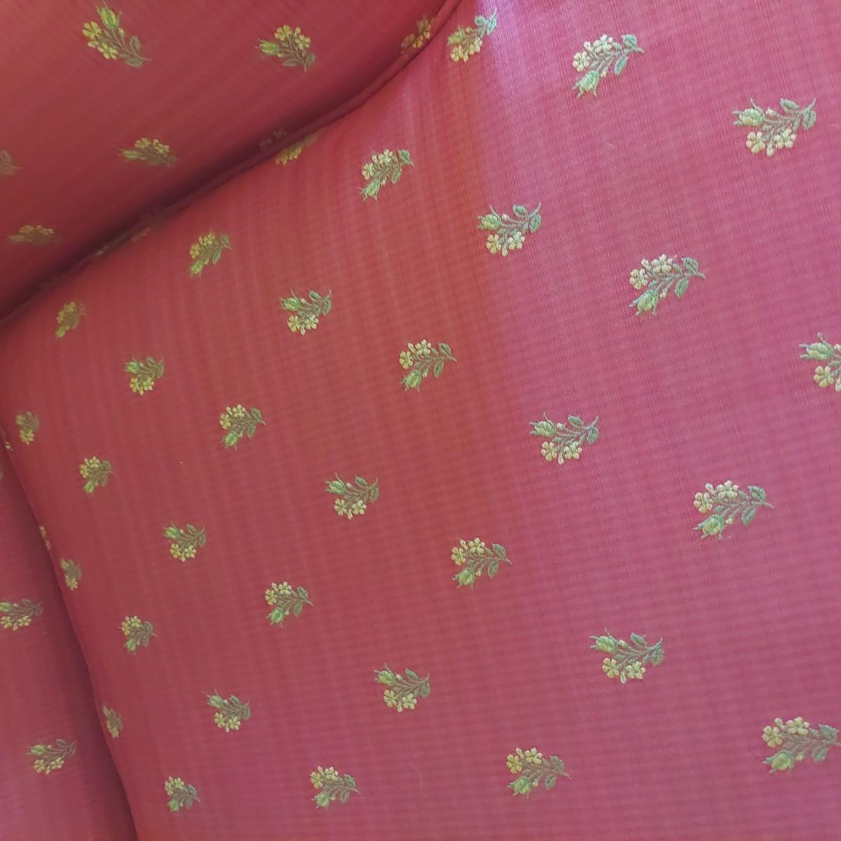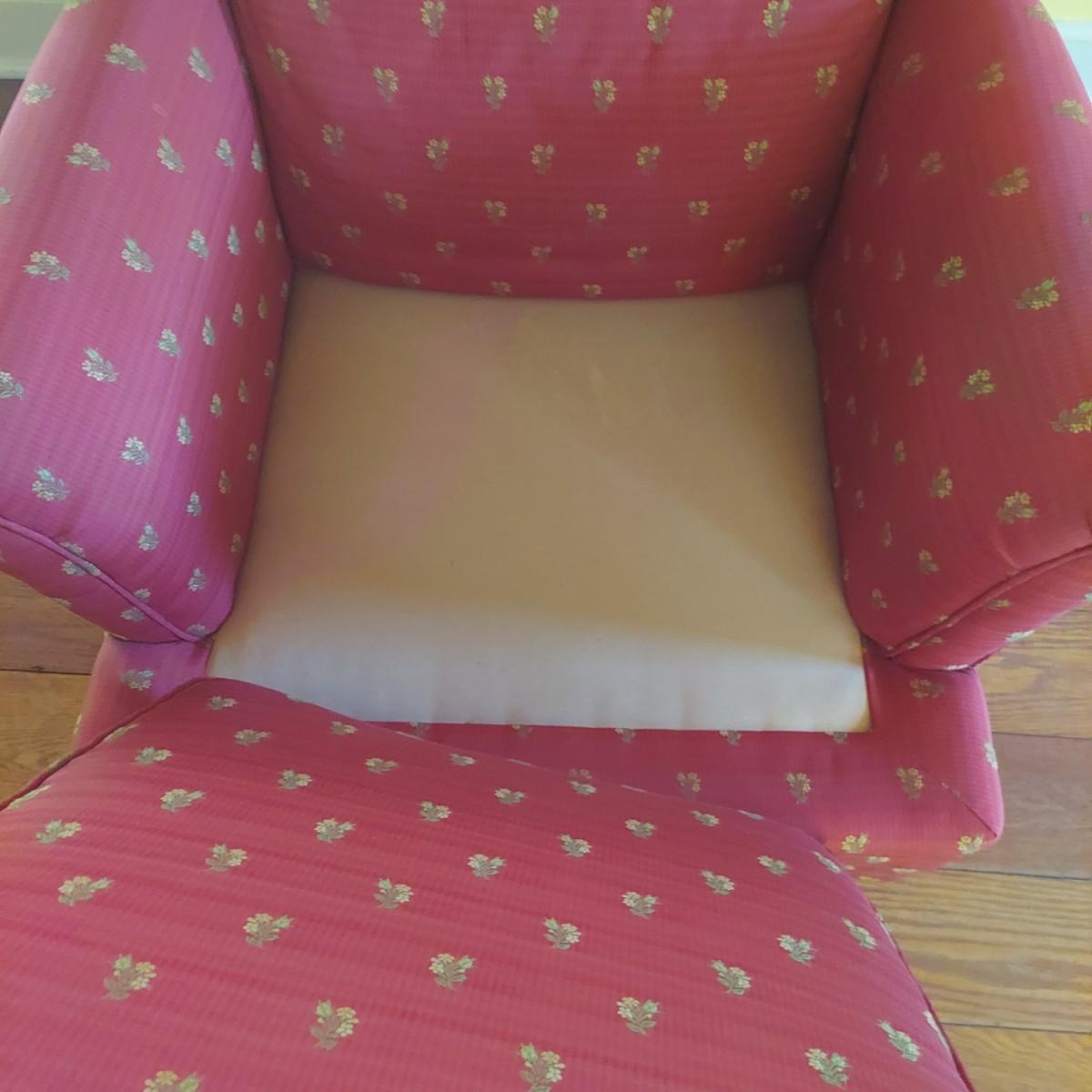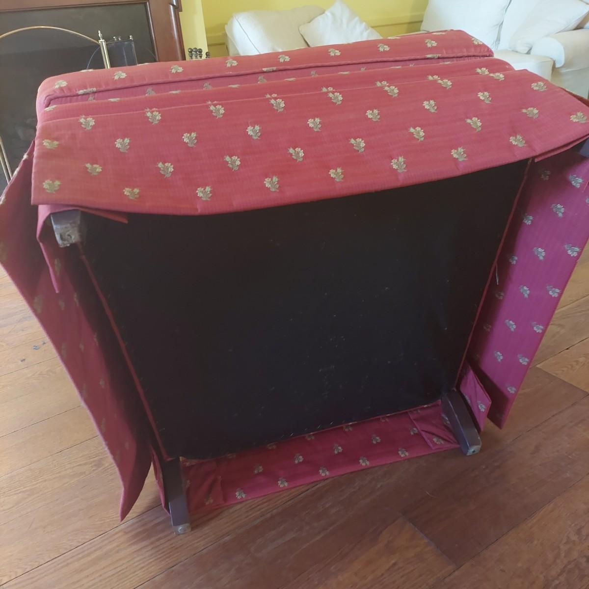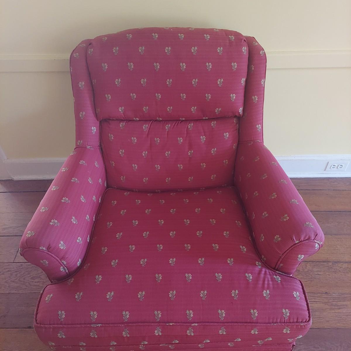 French Provincial style skirted red armchair with yellow floral print. Chair measures approximately 35" x 36" x 33"H with a seat height of 18"H. Local Pickup Only.