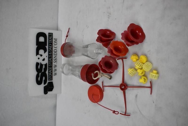 Red Flower Humming Bird Feeder Parts, Missing Base. Includes 8 Flowers with 6 Bee Guards, One Four-Way Perch, and Two glass container. Dirty, will need to be cleaned before use.s