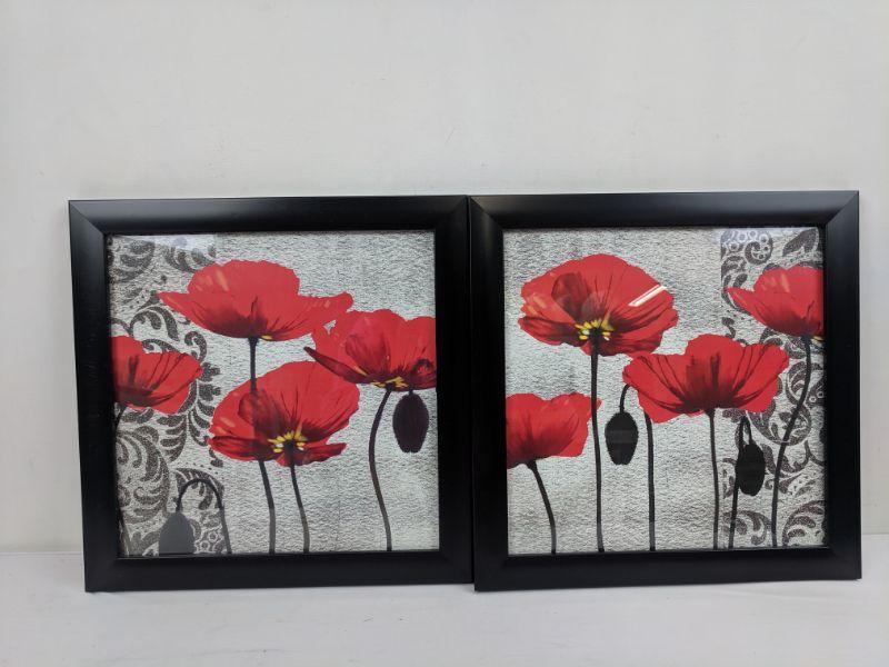 Red Flower Print With Black Frame, 14" x 14", Set of 2 - New