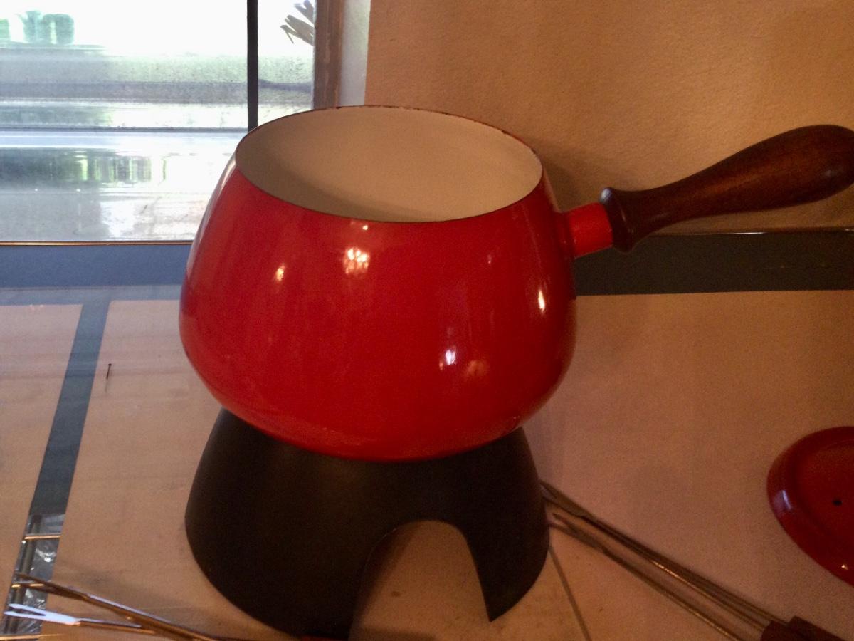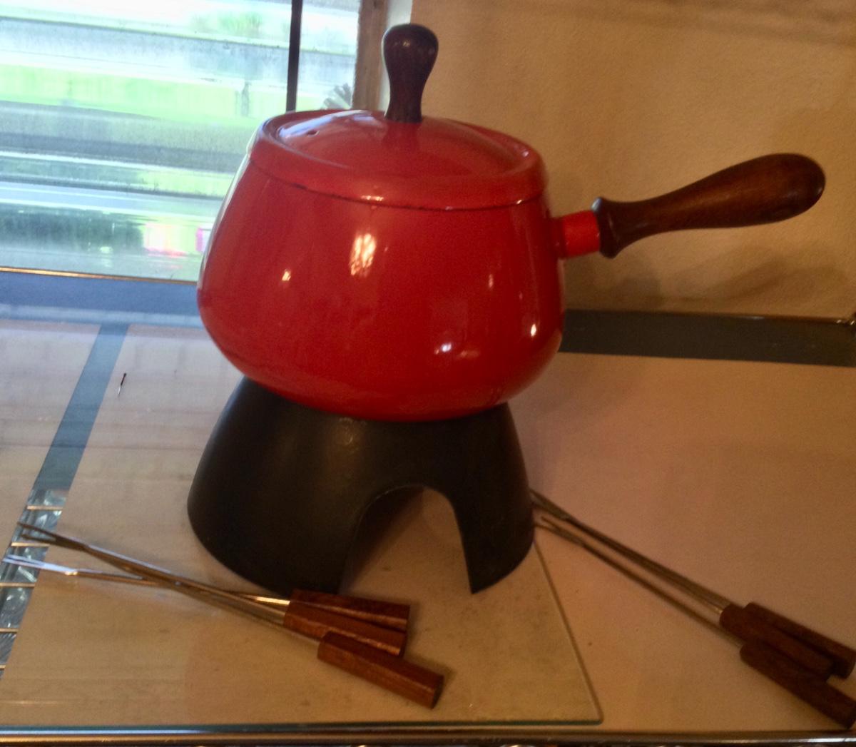 Brilliant red fondu pot on stand with cover and 8 fondue forks with wooden handles.