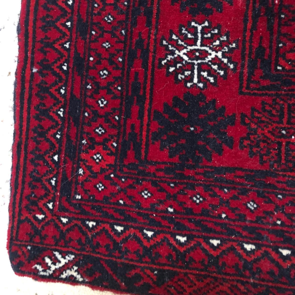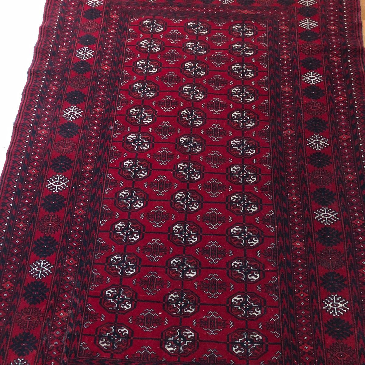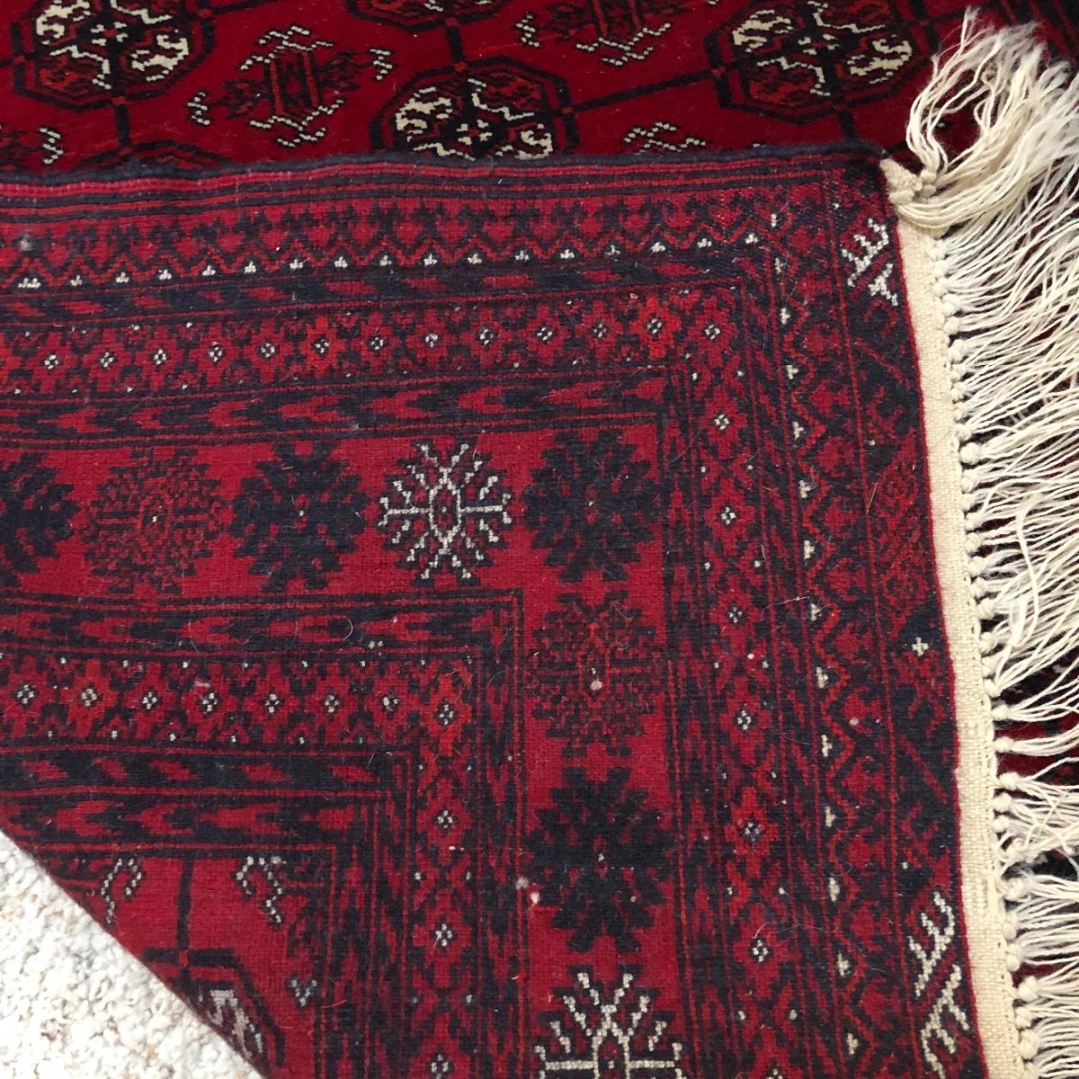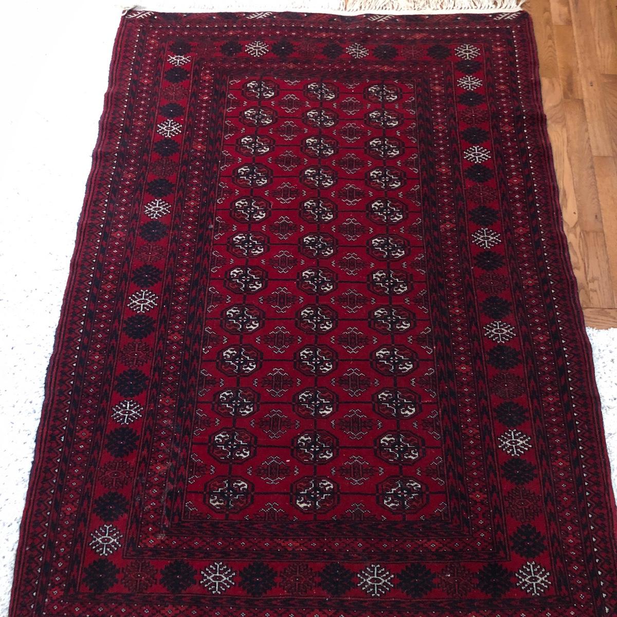 Rug has no labels yet feels like it is a wool blend. It measures 48” x 68” not inclusive of fringe. Local pick up only.