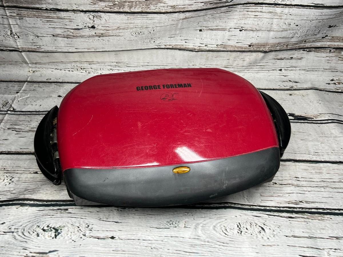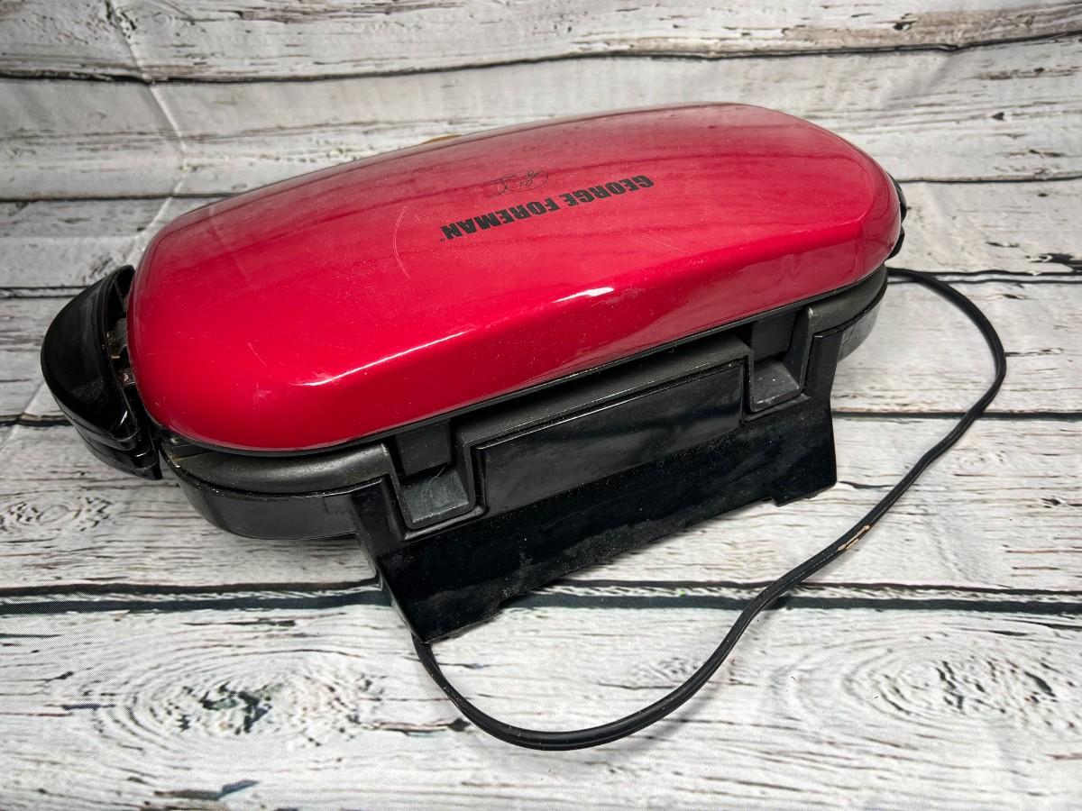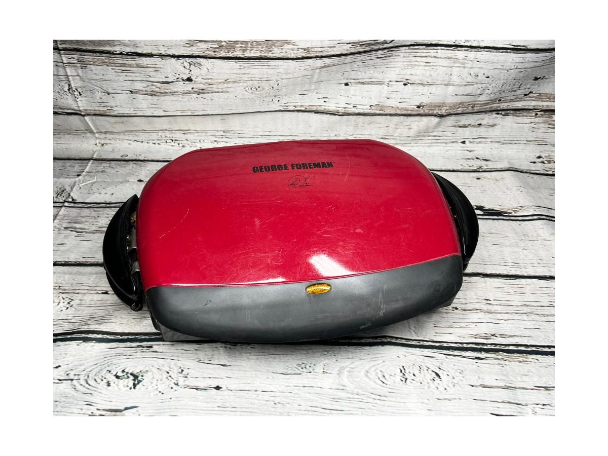 Red George Foreman Kitchenware Burger Meat Grill, there is some use to the grill, but there is no significant damage and is in good condition. The indicator light turns on when plugged in, but has not been tested further. Check pictures for more details and for sizing.