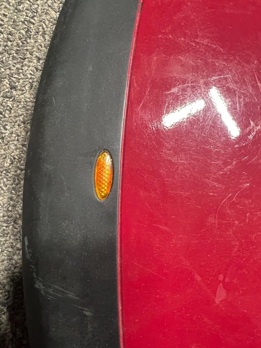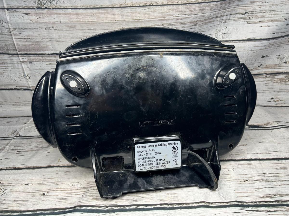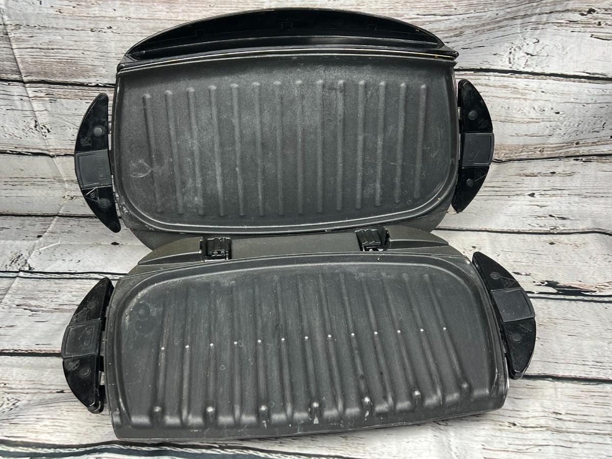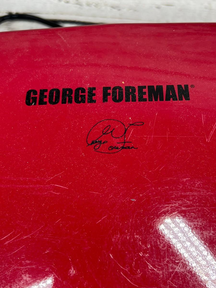 Red George Foreman Kitchenware Burger Meat Grill, there is some use to the grill, but there is no significant damage and is in good condition. The indicator light turns on when plugged in, but has not been tested further. Check pictures for more details and for sizing.