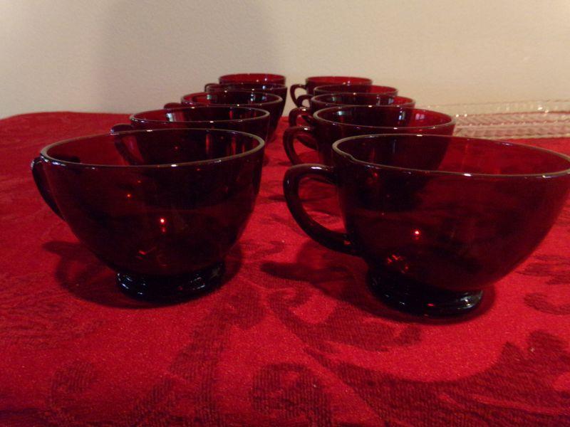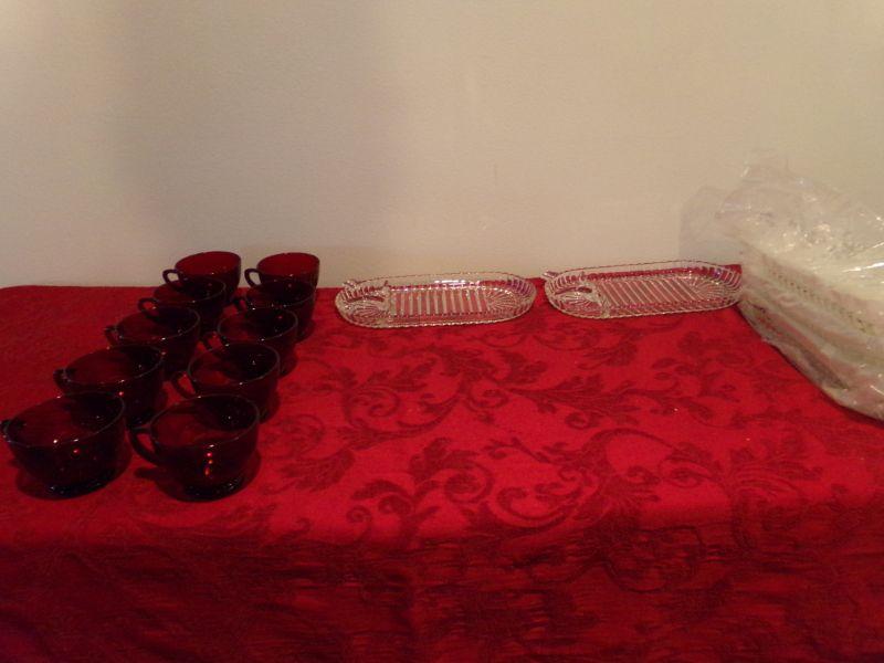 10 RED GLASS CUPS AND 8 OVAL GLASS PLATES.
