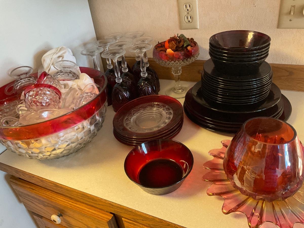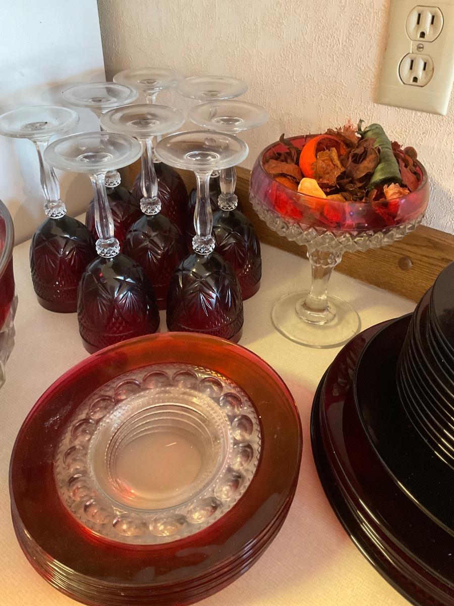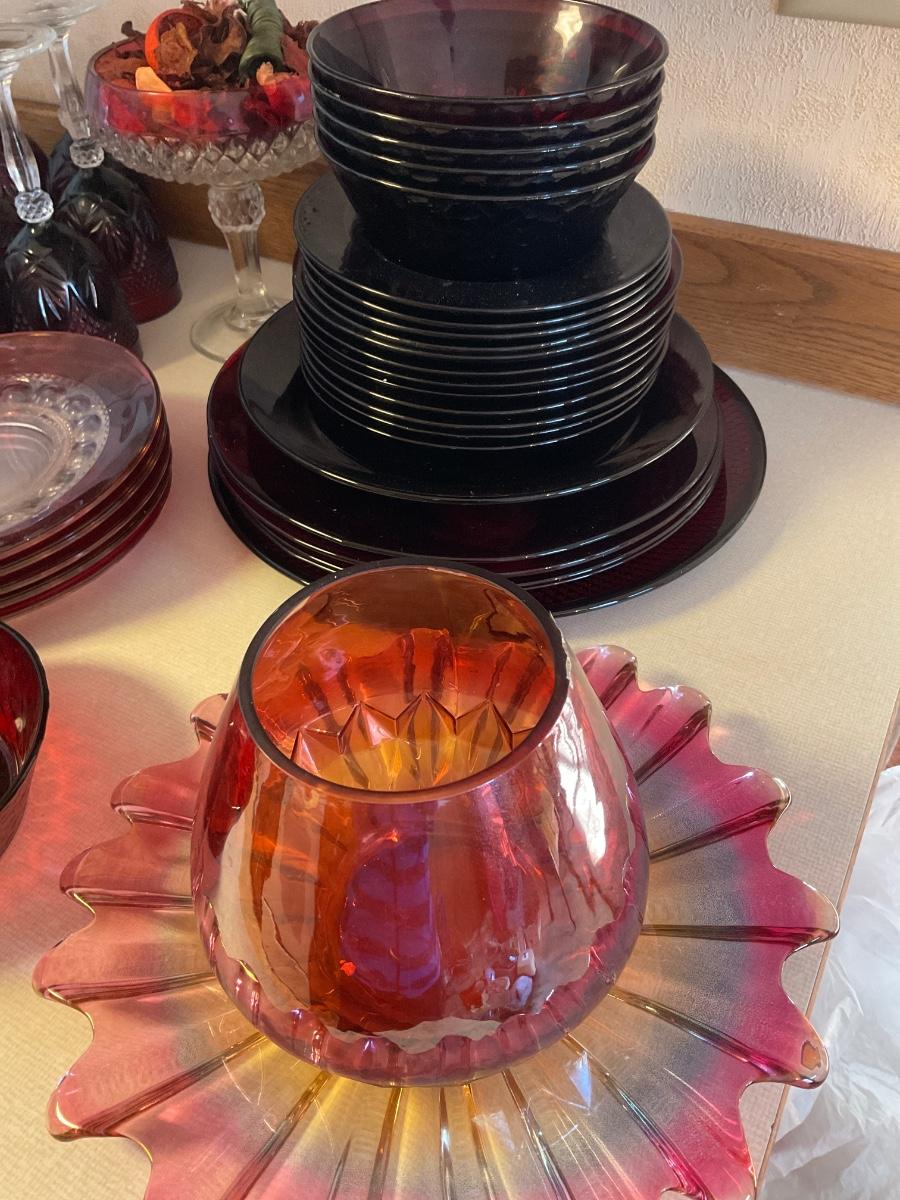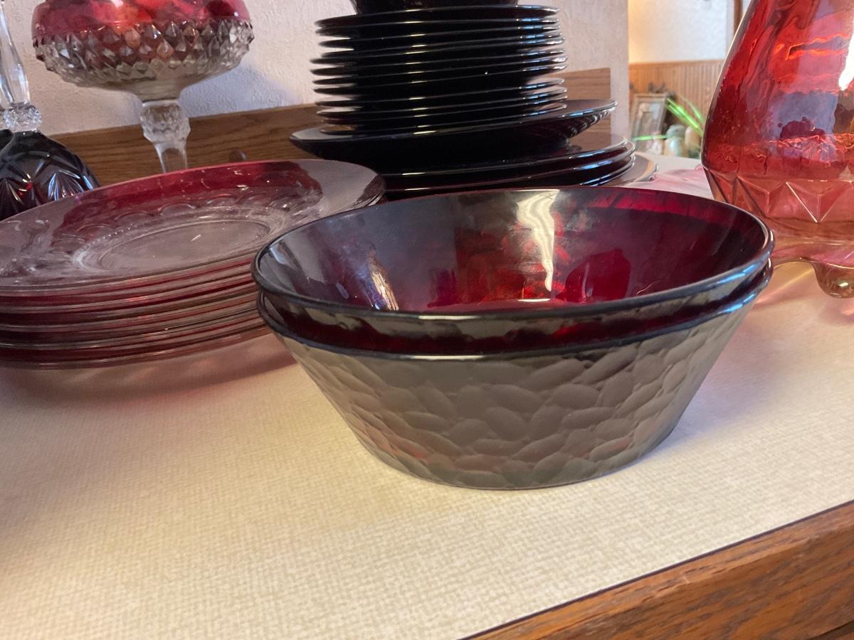 Red glass dessert plates, bowls, punch bowl