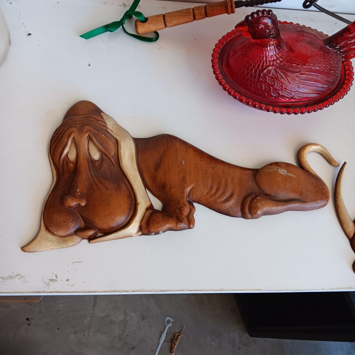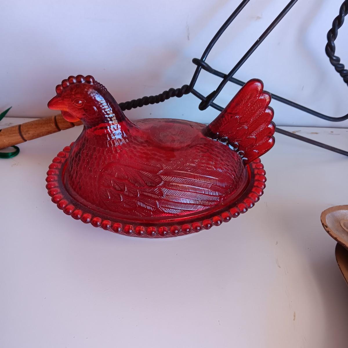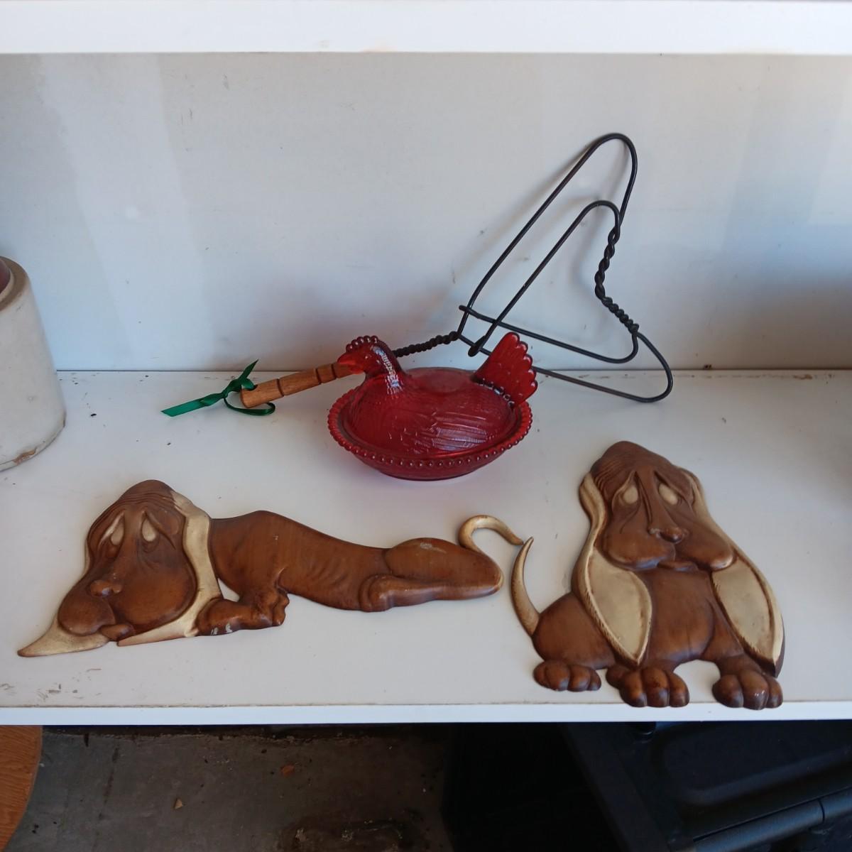 RED GLASS HEN ON NEST, SEXTON 1967 METAL HOUNDS WALL ART AND RUG BEATER