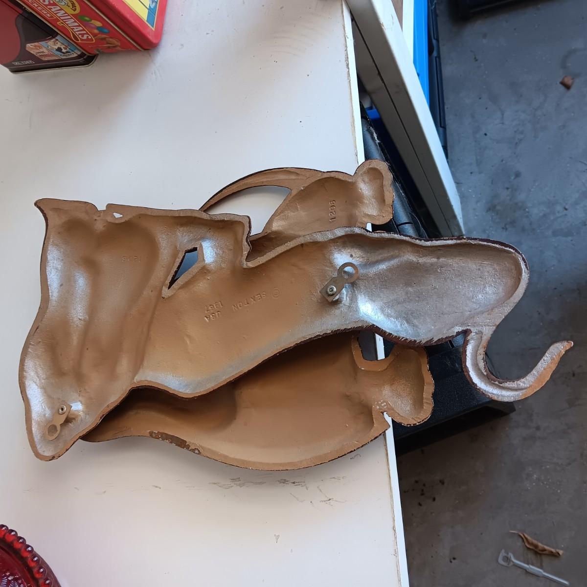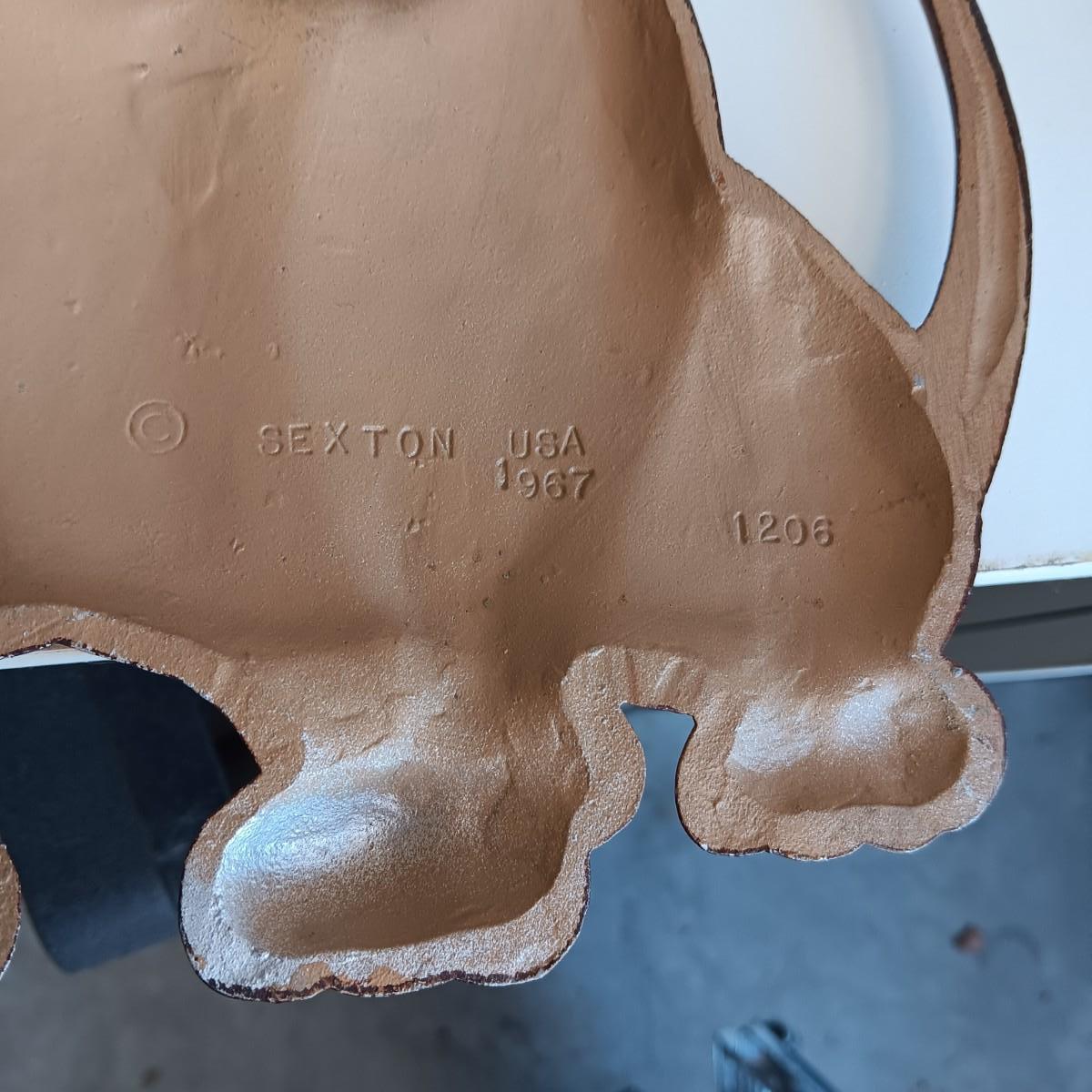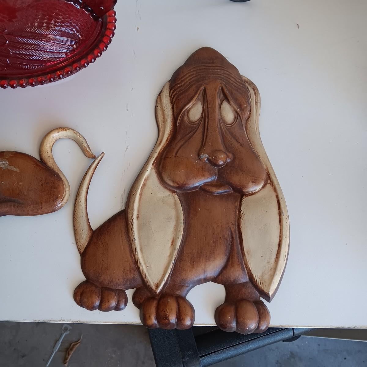 RED GLASS HEN ON NEST, SEXTON 1967 METAL HOUNDS WALL ART AND RUG BEATER