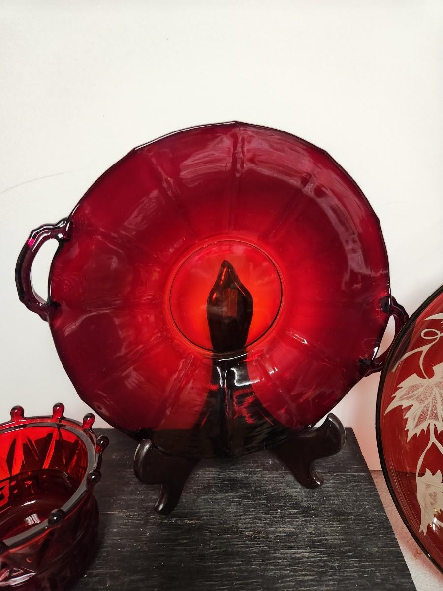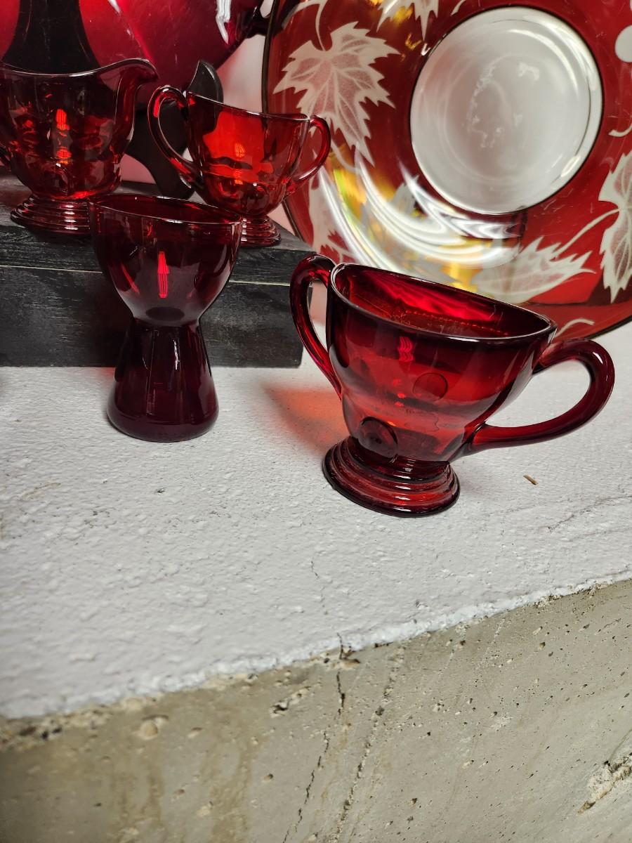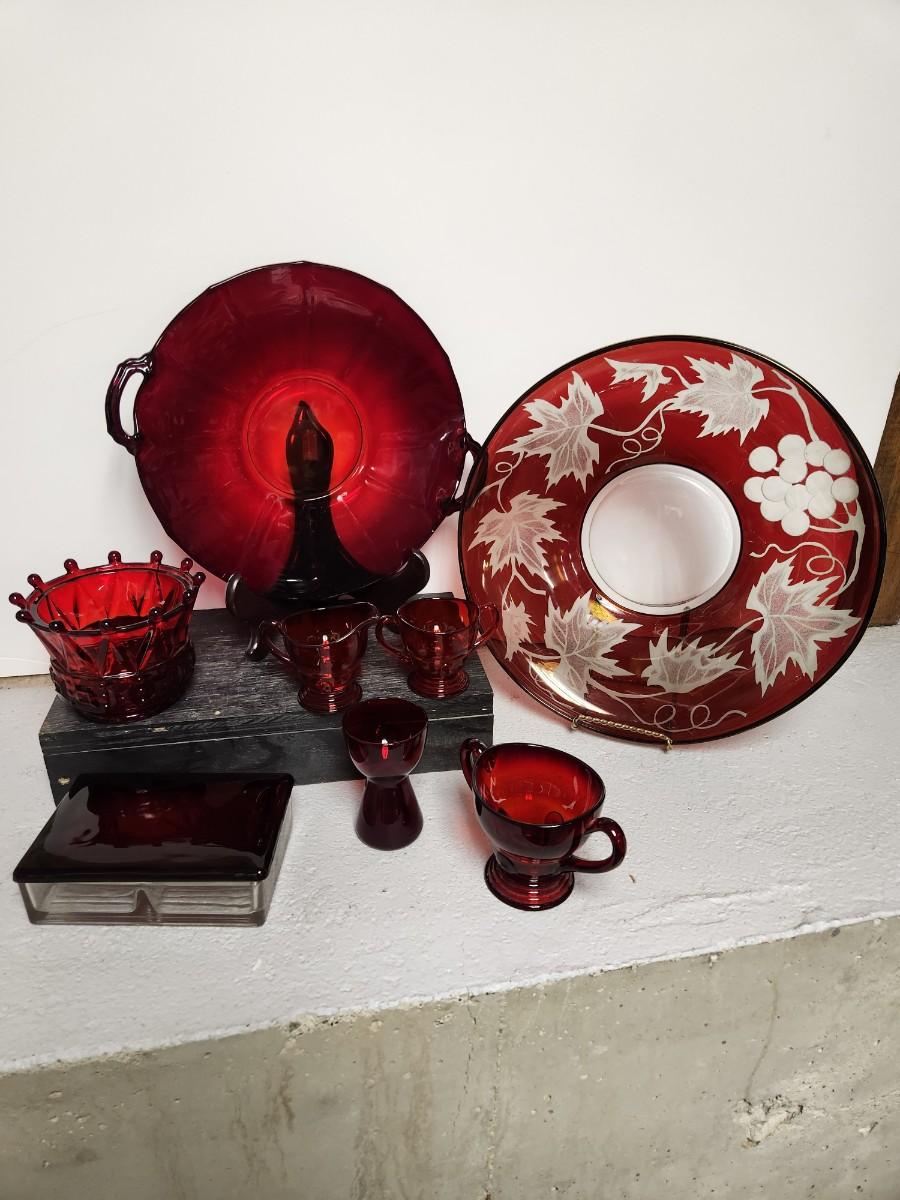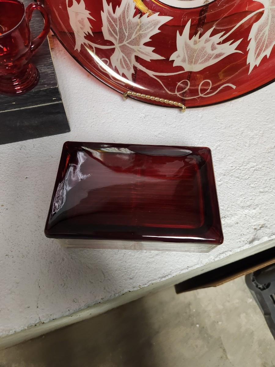 Lot of ruby flashes and ruby glass pieces. The clear box with the red lid is for playing cards.