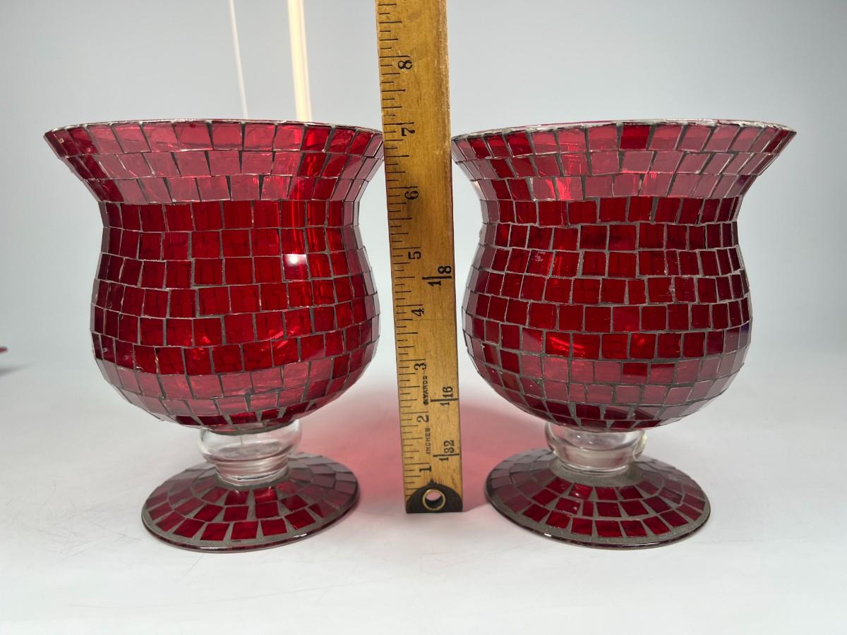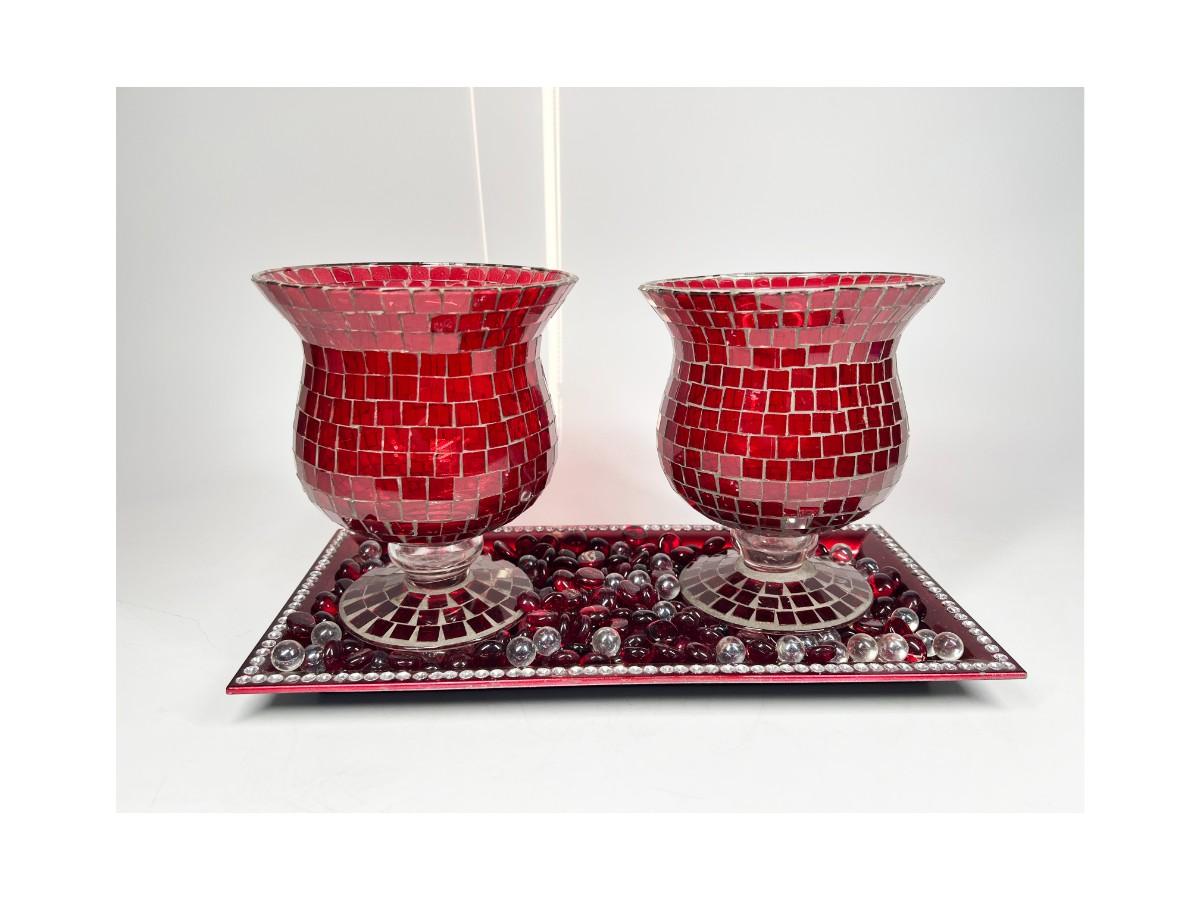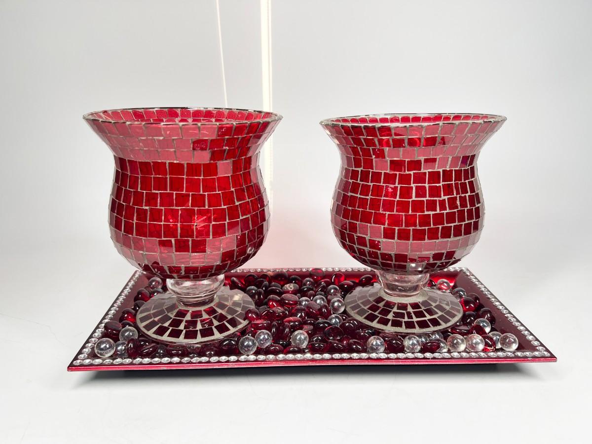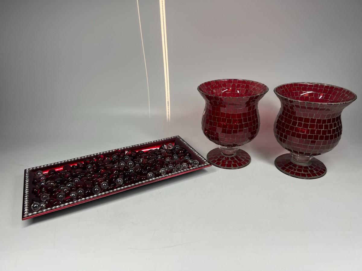 Red Glass Pane & Beads Candle Home Accents Holder Display Set