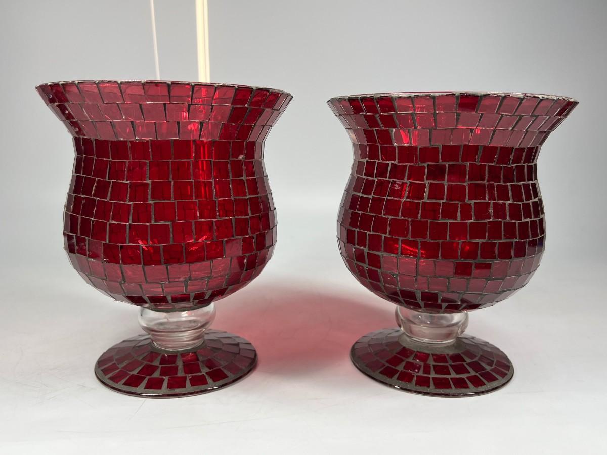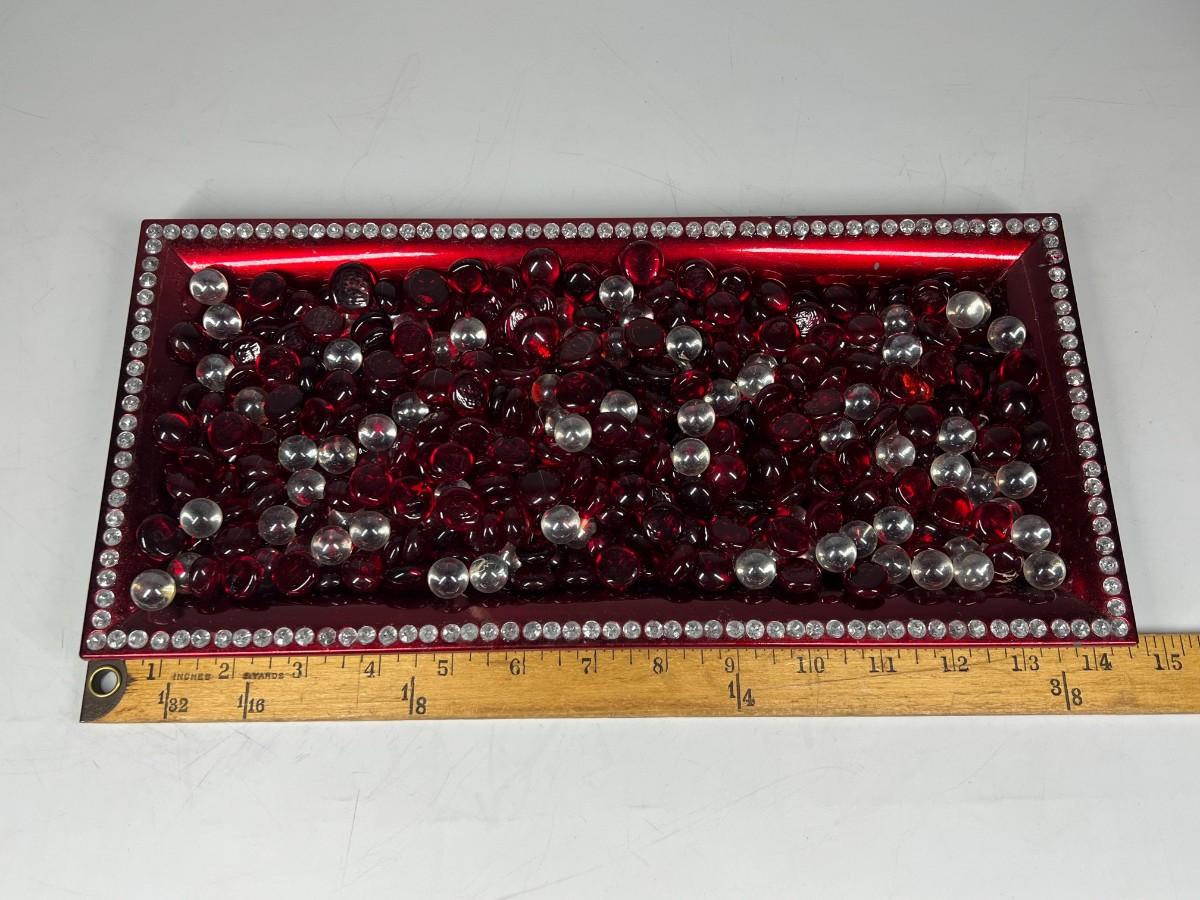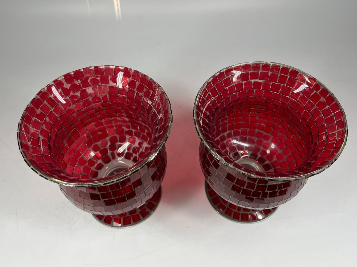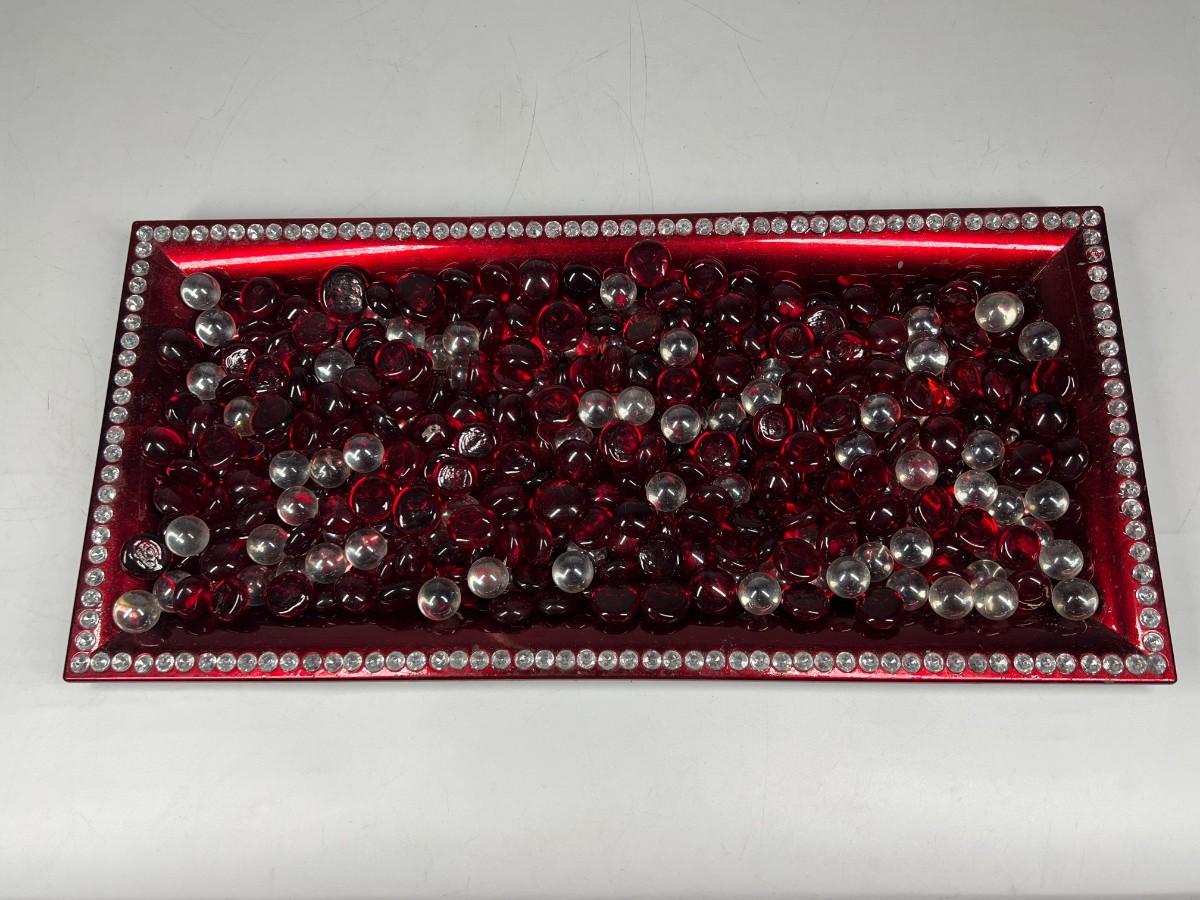 Red Glass Pane & Beads Candle Home Accents Holder Display Set