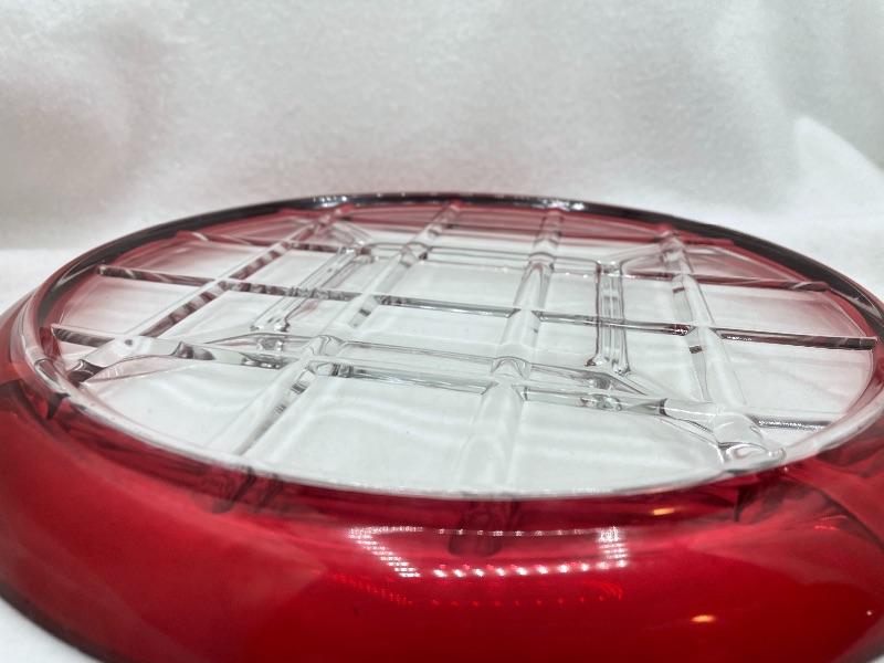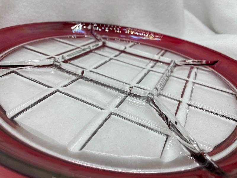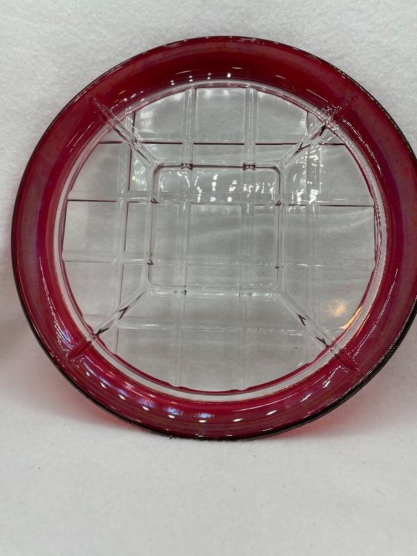 Vintage Ruby Red/Kings Crown square divided relish tray/serving platter. 12" diameter.
