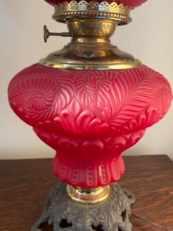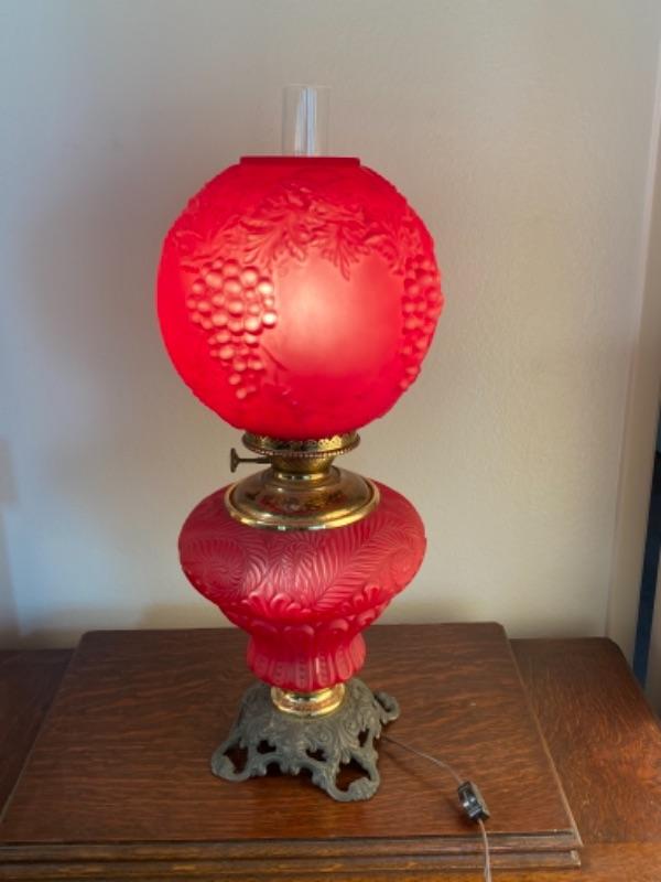 Beautiful antique red satin globe success table lamp. Grape embossed pattern on globes. Three way light setting. In good condition. On/off switch on electric cord. About 26" tall.