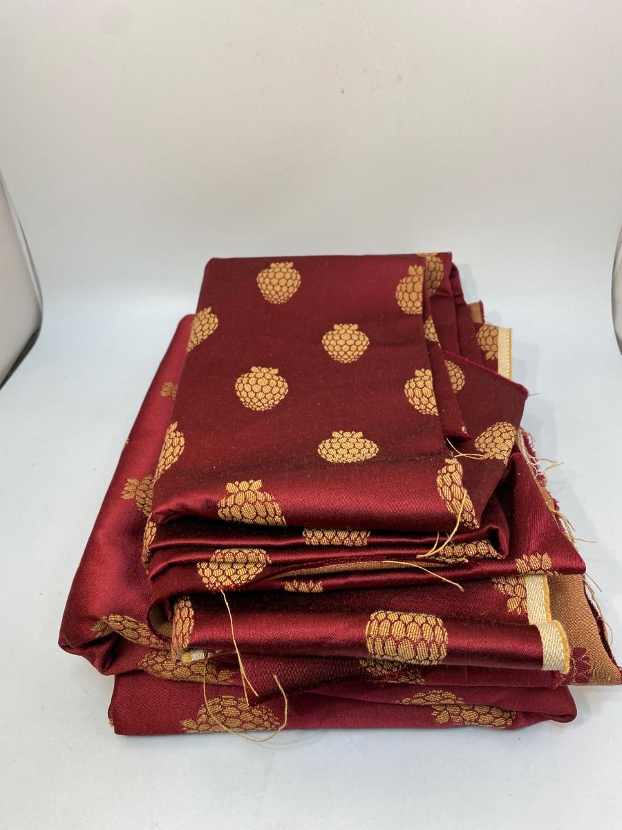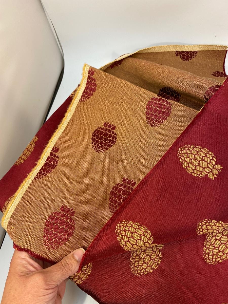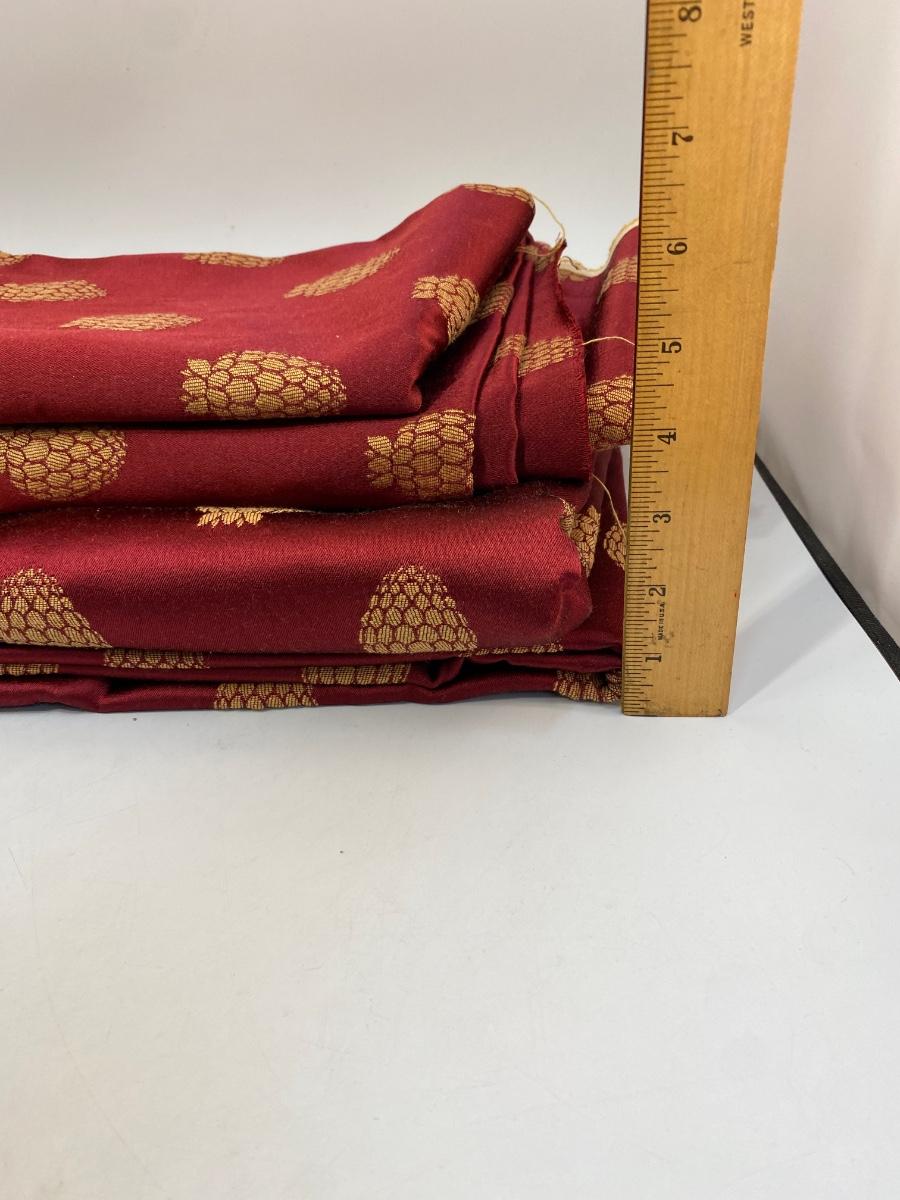 Red & Gold Berry Fruit Pattern Upholstery Fabric. In good condition. Seems to be a good amount of fabric, not scraps. Did not measure or find any maker info along the edges.
