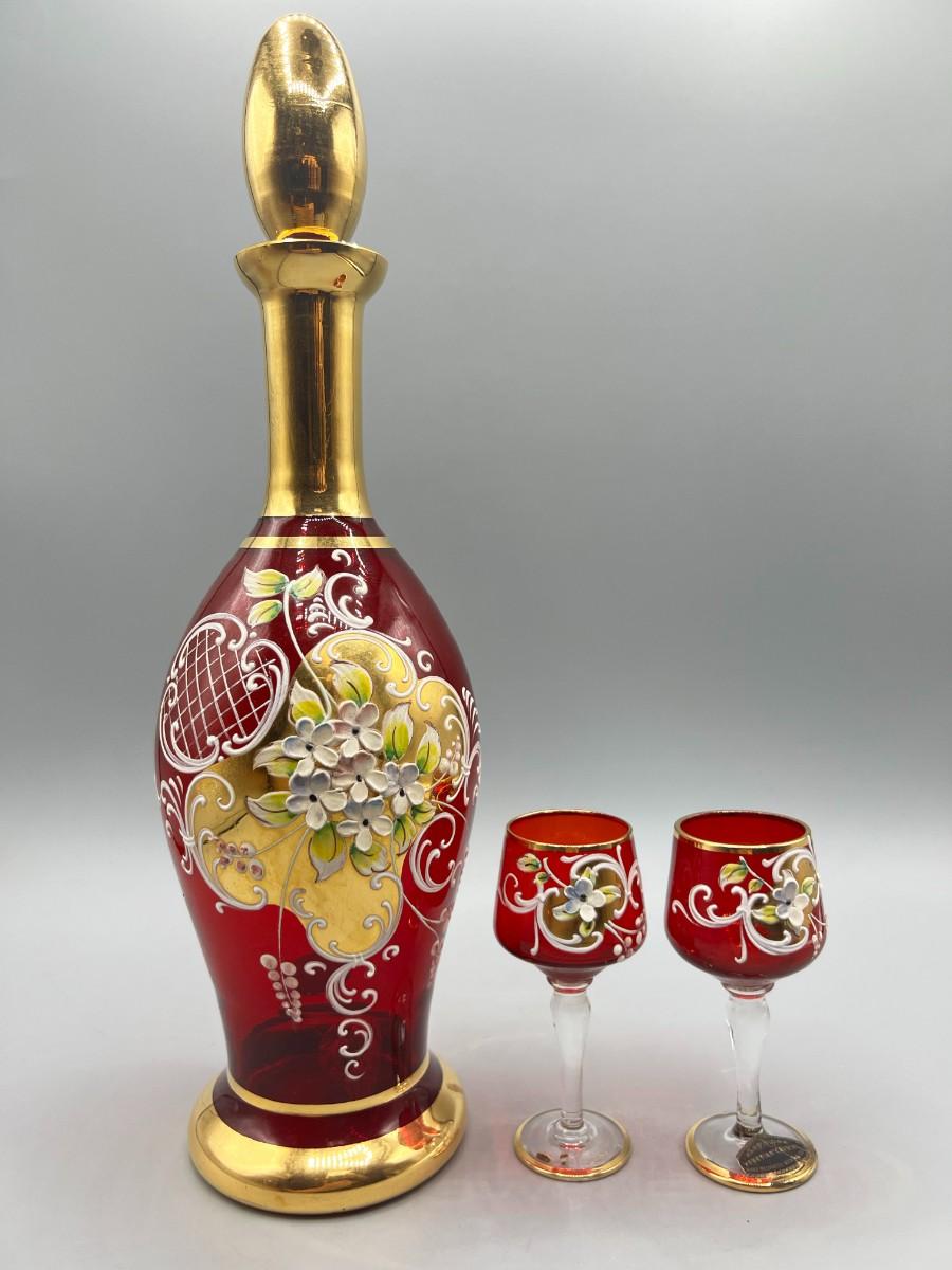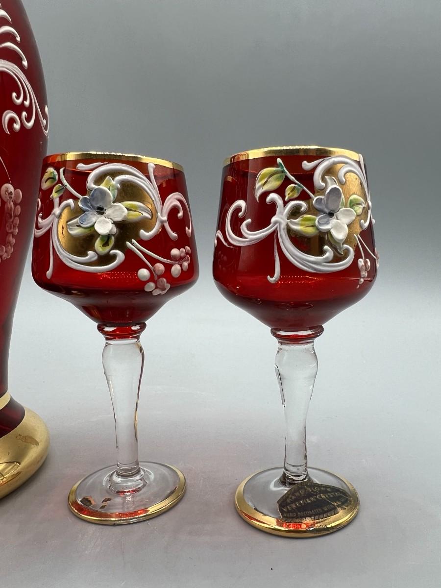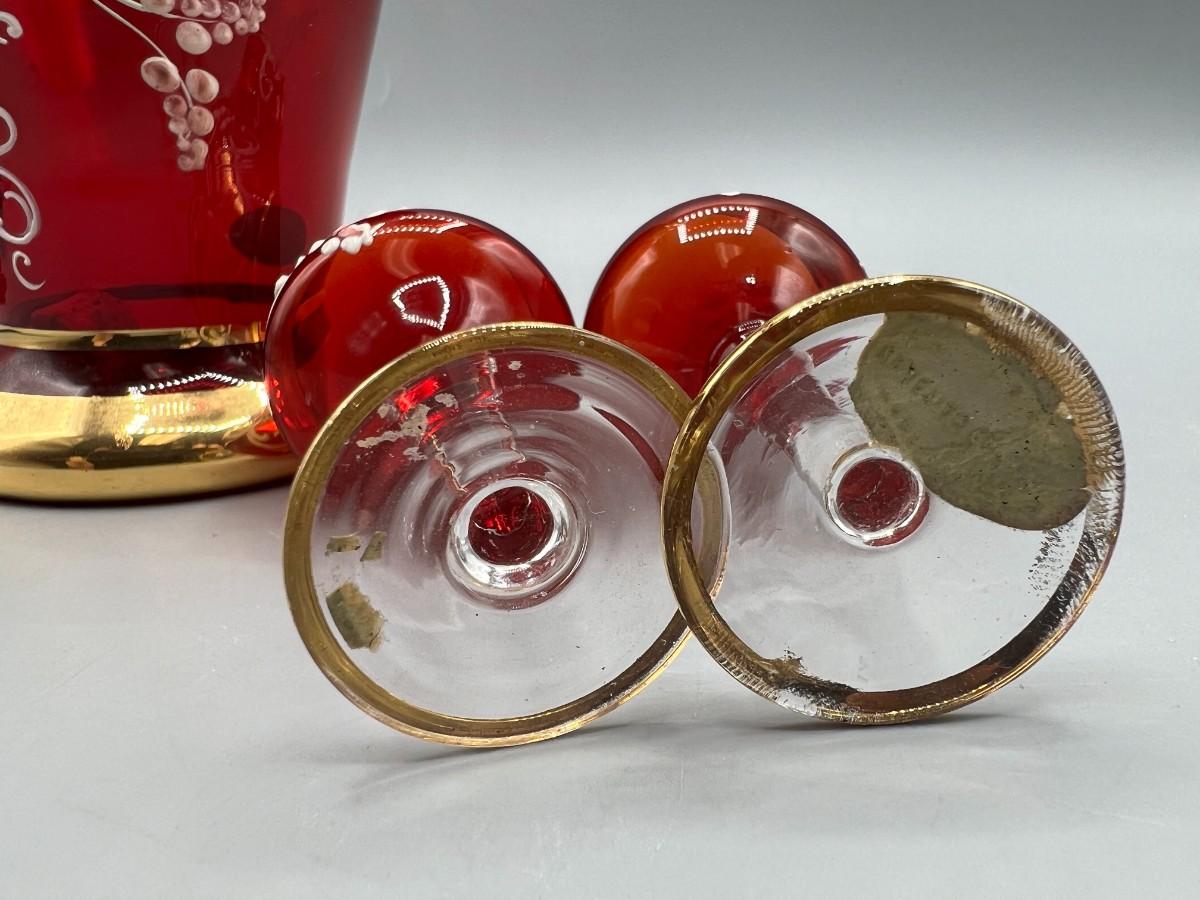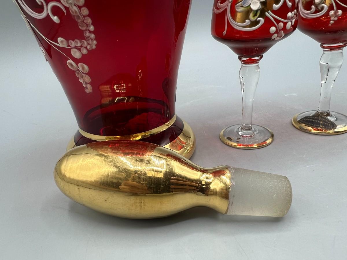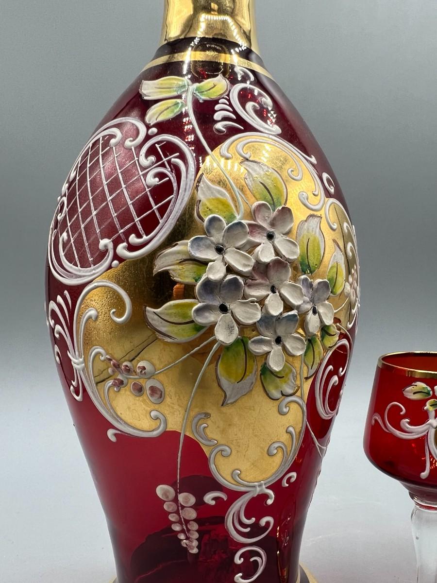 Red & Gold Venetian Crystal Bohemian Floral Painted Decanter with 2 Cordial Glasses