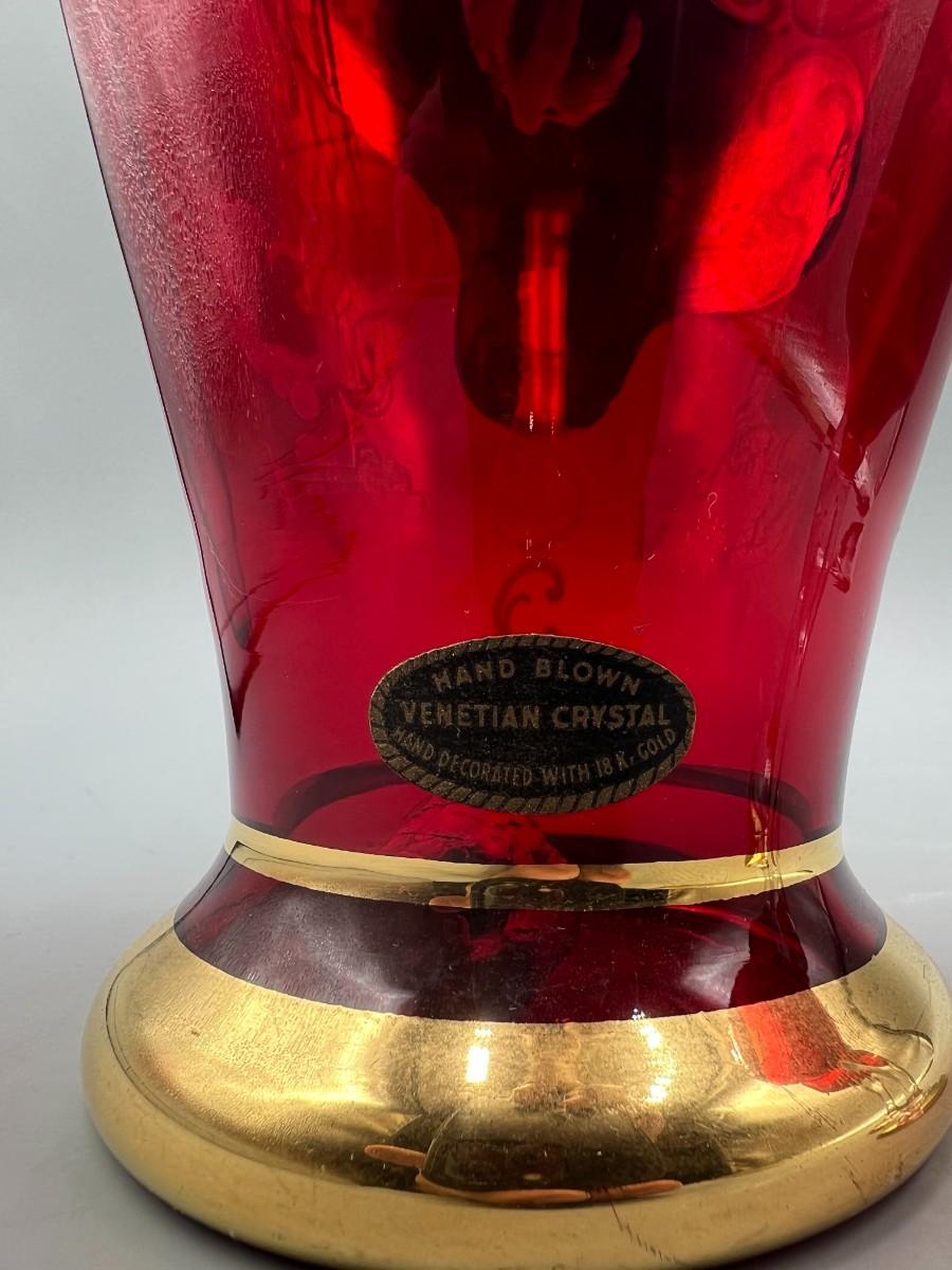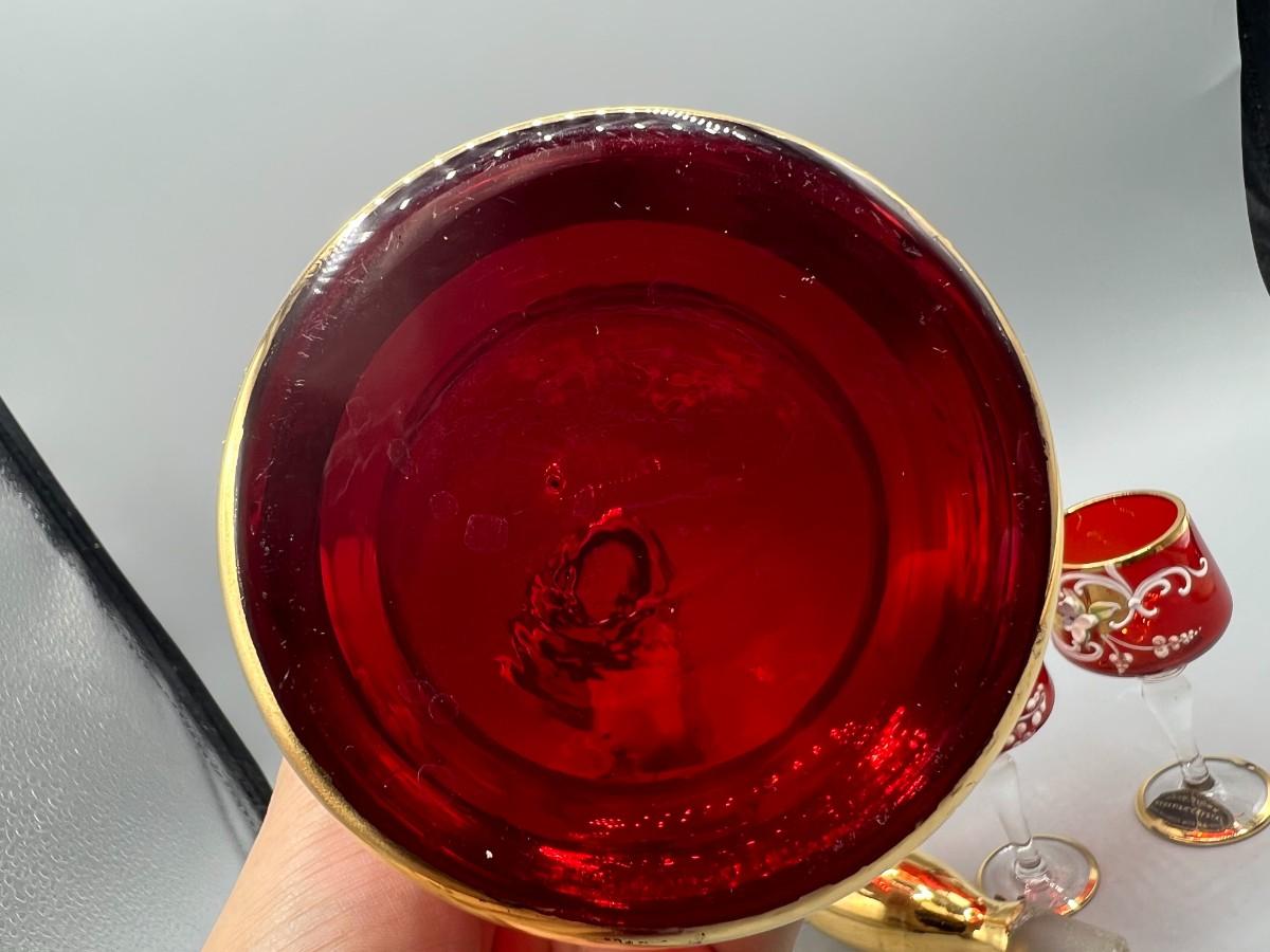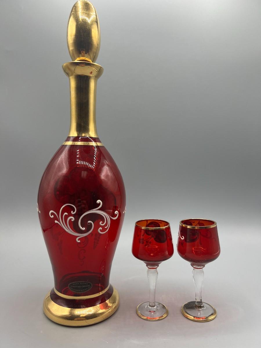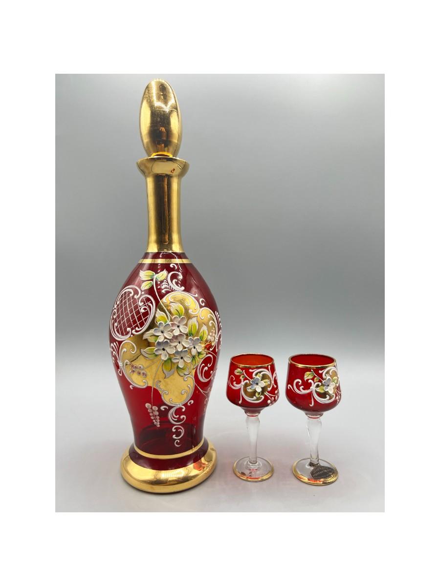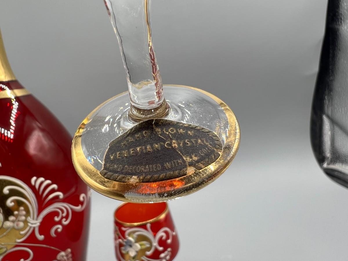 Red & Gold Venetian Crystal Bohemian Floral Painted Decanter with 2 Cordial Glasses