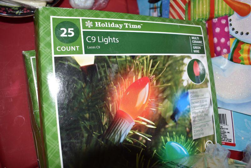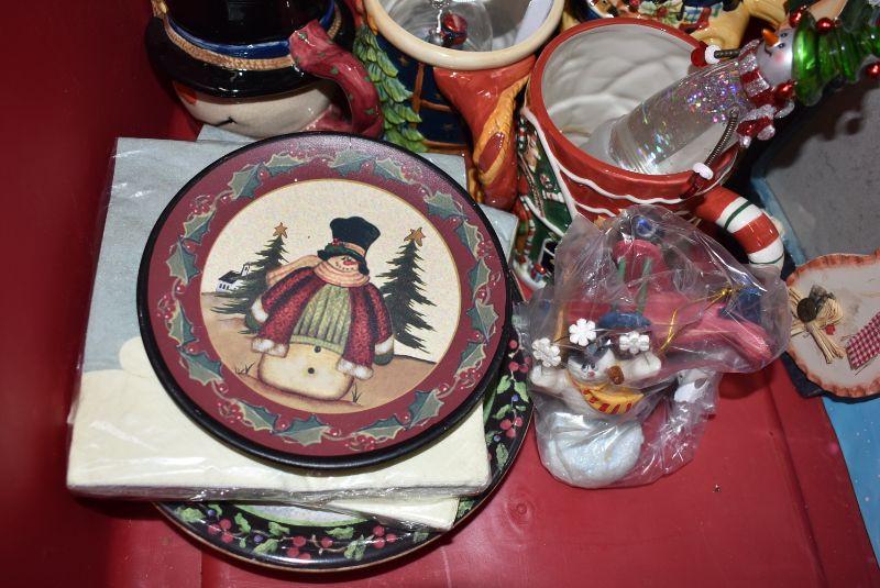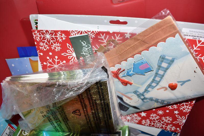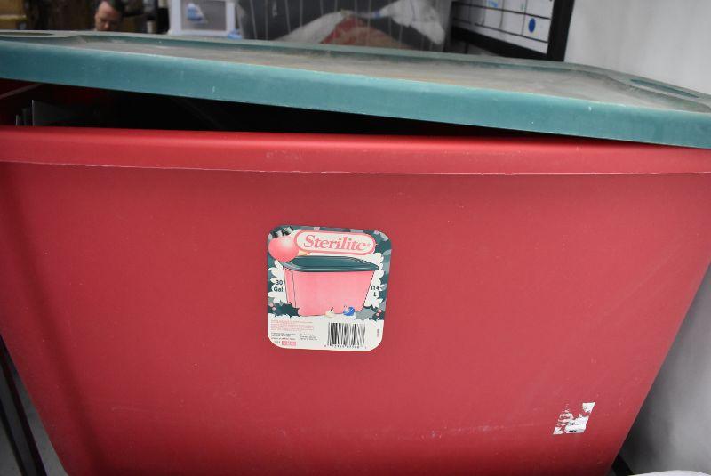 Red & Green 30 gallon Sterilite Full of Misc Christmas Decor, Lots of Snowmen