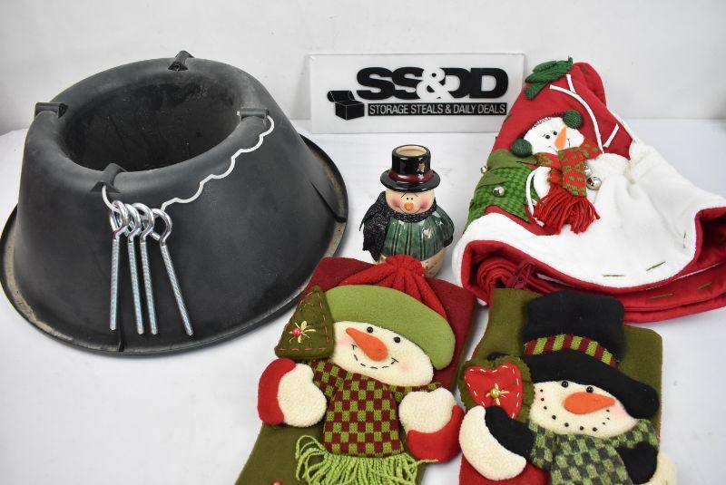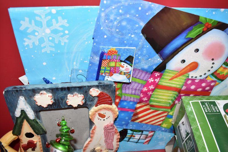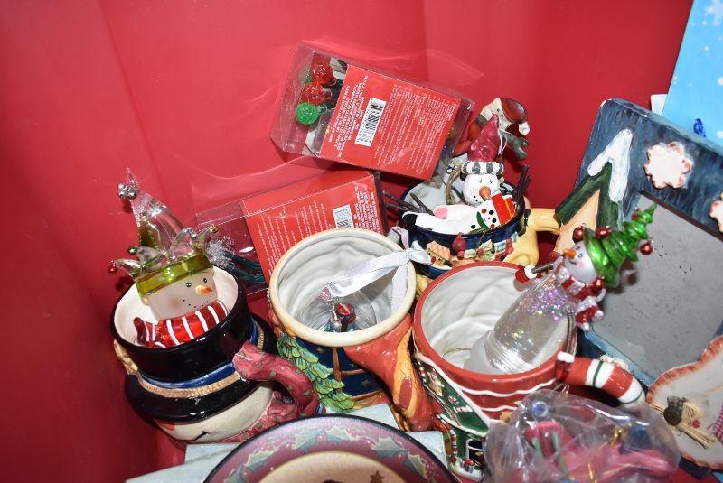 Red & Green 30 gallon Sterilite Tote Full of Misc Christmas Decor, Lots of Snowmen. Bin Included