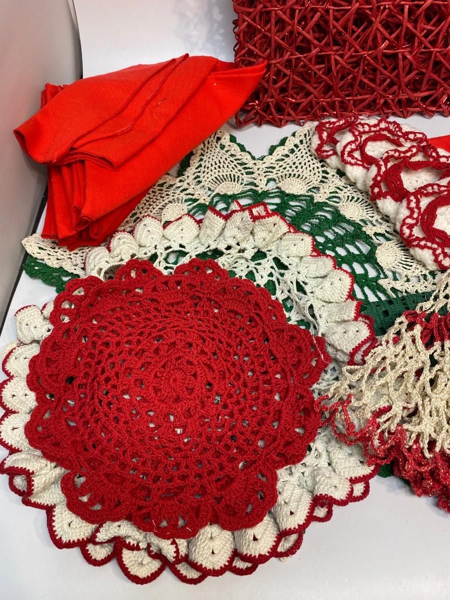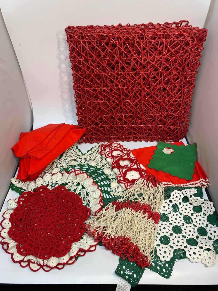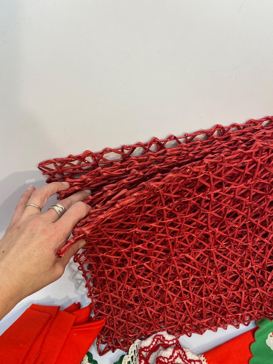 Red & Green Christmas Winter Holiday Seasonal Table Linens Doilies Lot. Different color variations of doilies, 8 raffia woven placemats, red linen dinner napkins, and a couple other table linens. All seem to be in fair to good condition. May have a light spot or two, did not notice any major spots.