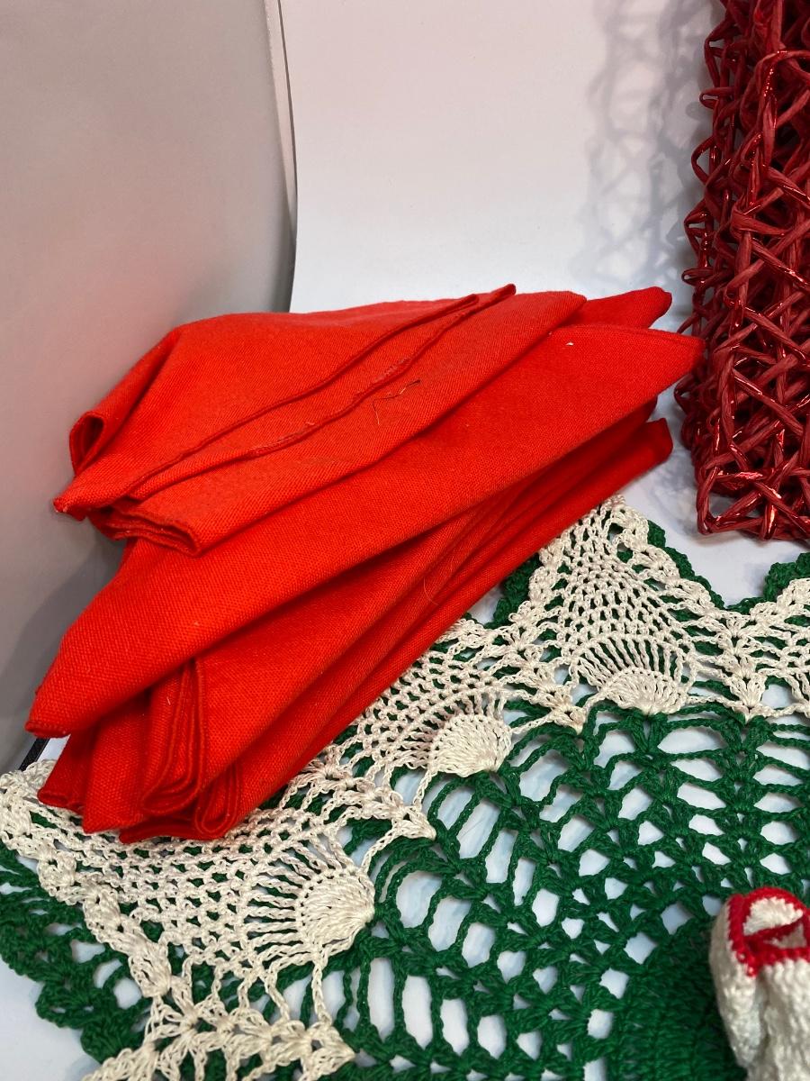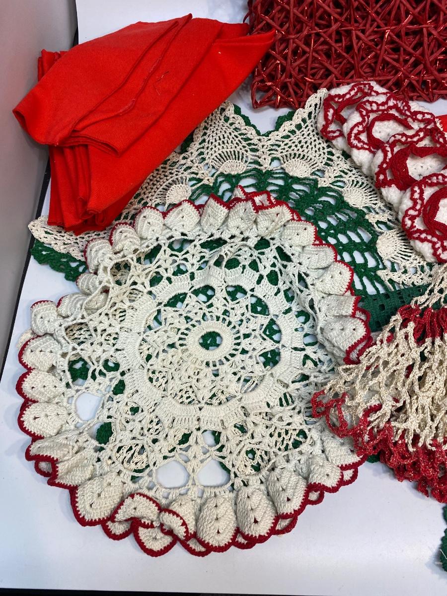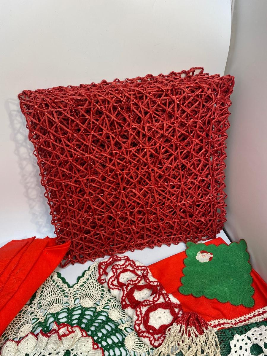Red & Green Christmas Winter Holiday Seasonal Table Linens Doilies Lot. Different color variations of doilies, 8 raffia woven placemats, red linen dinner napkins, and a couple other table linens. All seem to be in fair to good condition. May have a light spot or two, did not notice any major spots.