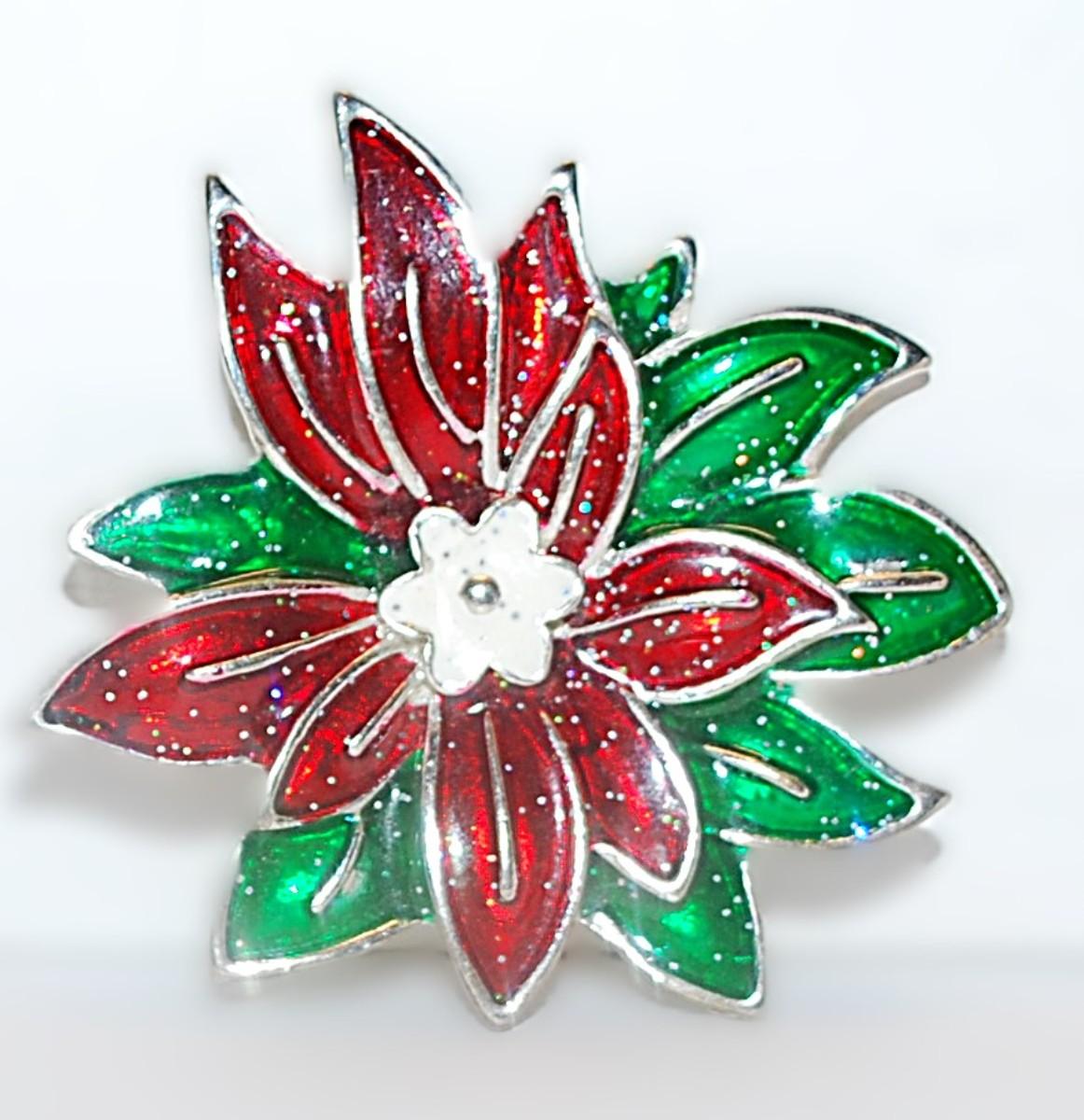 RED & GREEN Enameled HOLIDAY FLOWER BROOCH (2" Diam.) with White Center Accent and a Silver Tone Setting