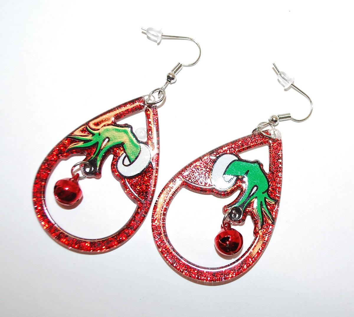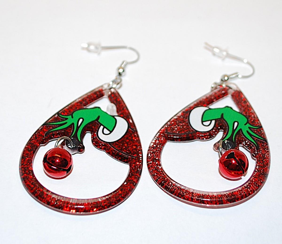RED & GREEN Teardrop "GRINCH" EARRINGS (1¾" x 1¼") Set with Wire Hook Clasp