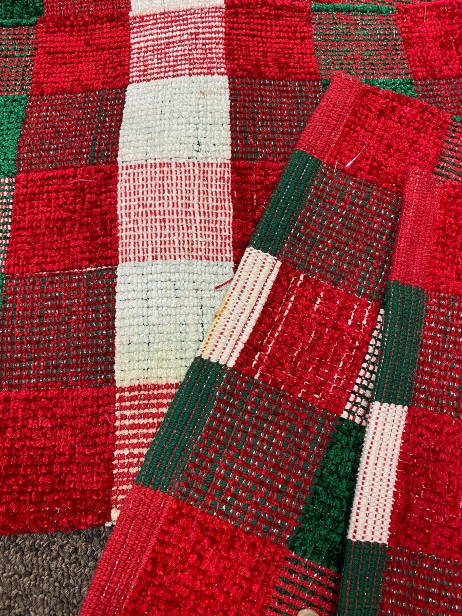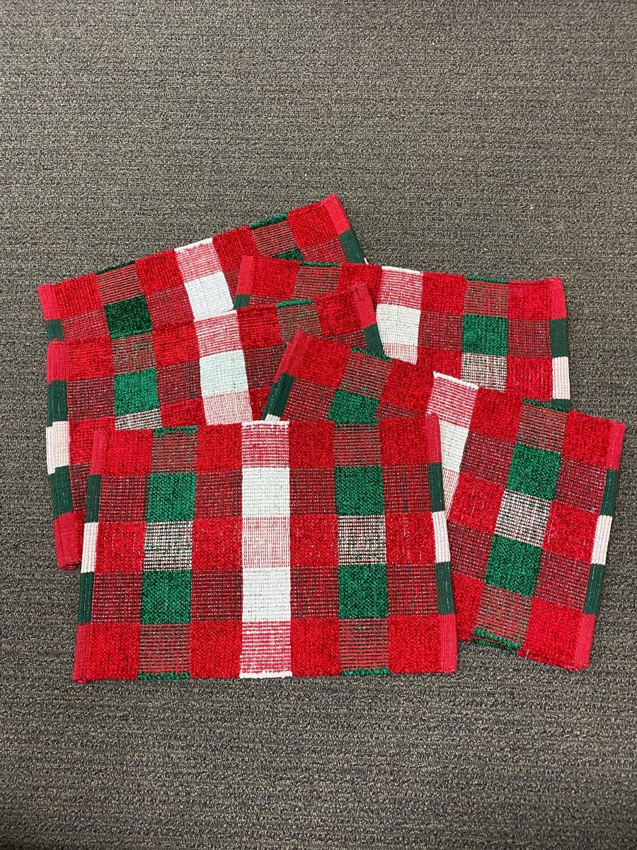 Set of red, green, and white plaid holiday seasonal placemats. Previously used, there are some light spots and discolor, not sure if they might just need to be washed.