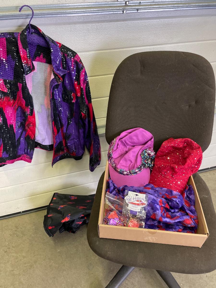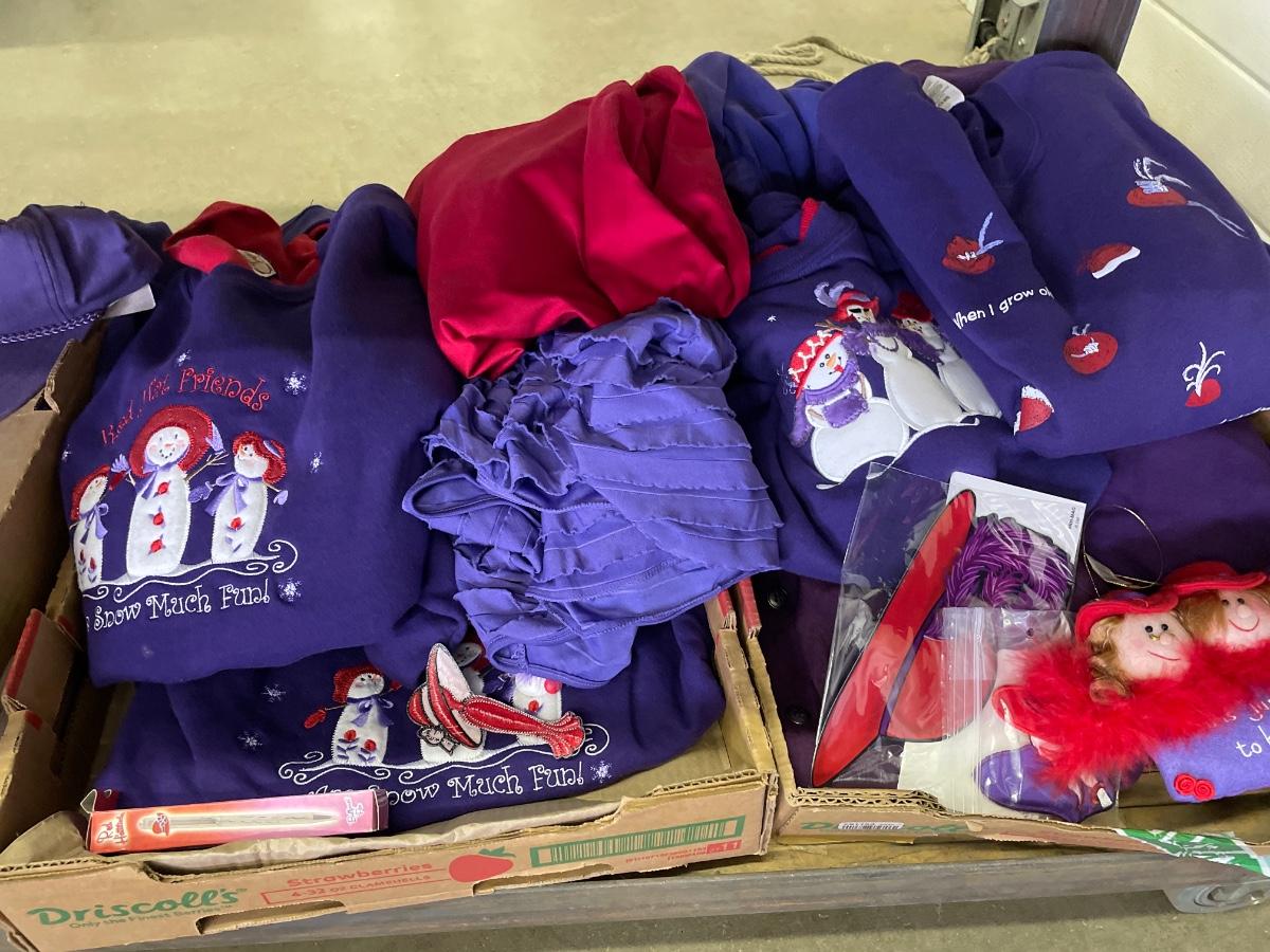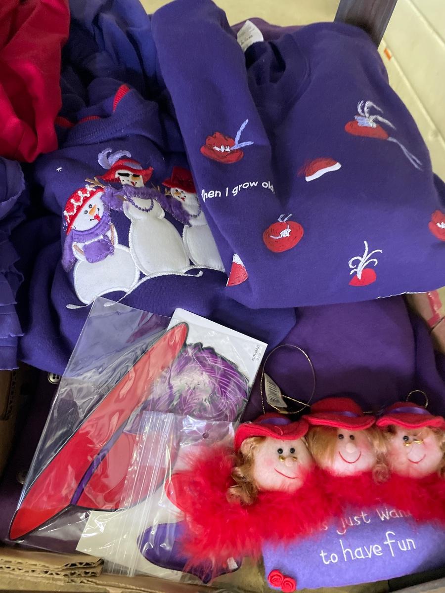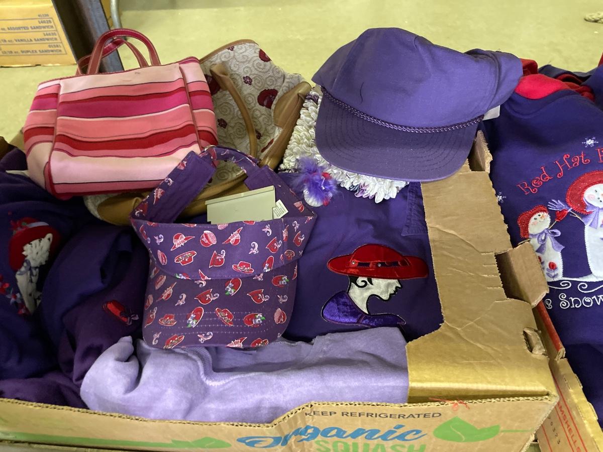 Includes four boxes of red hats, society, sweatshirts, hats, purses, and accessories