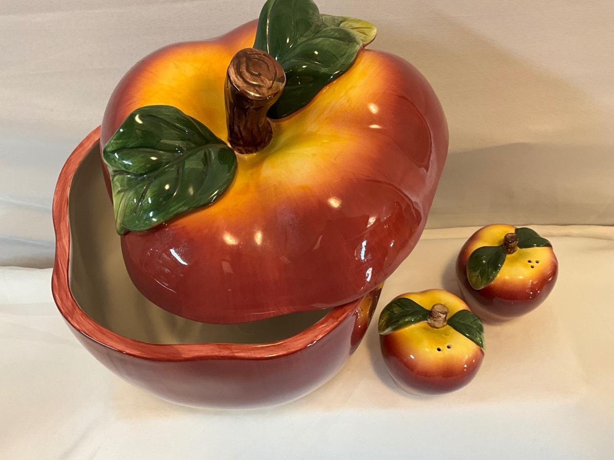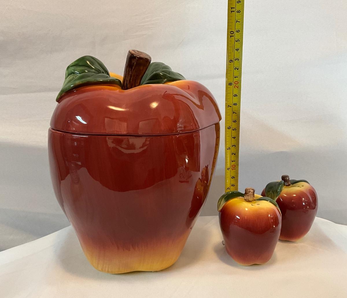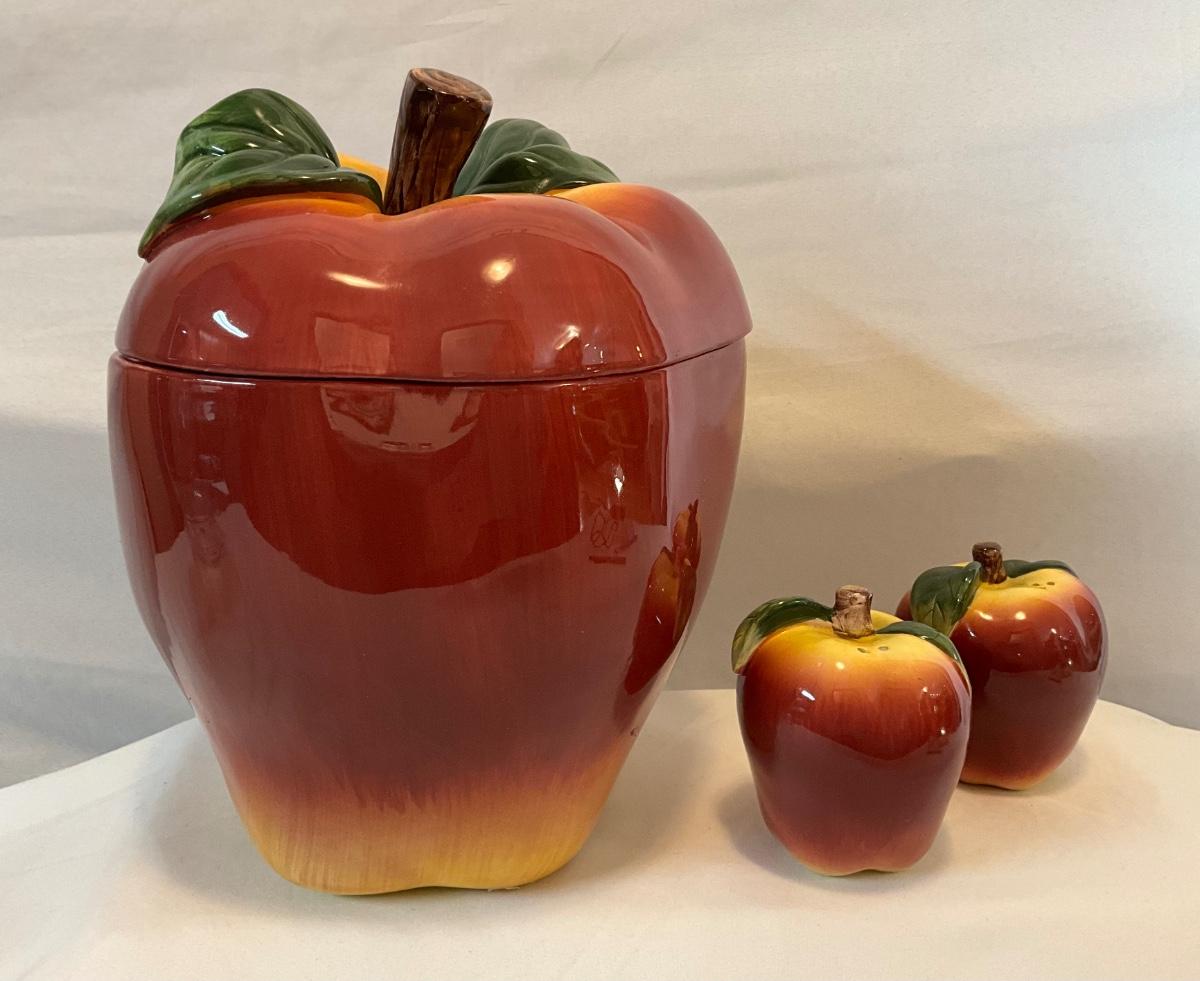 Red Heart Apple cookie jar, salt, and pepper shakers