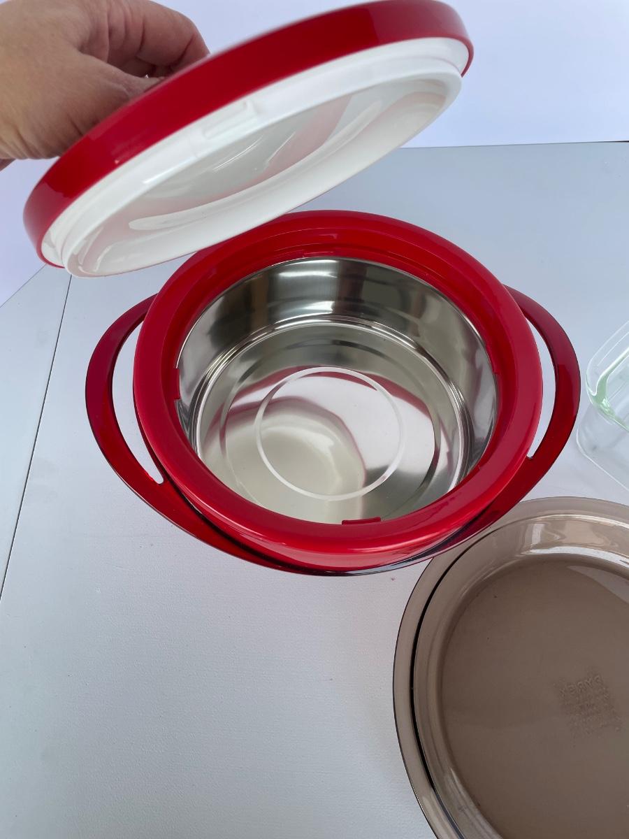 Red Insulated Bowl and Pyrex