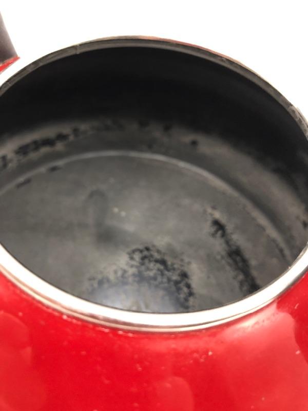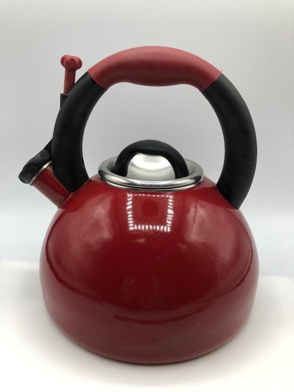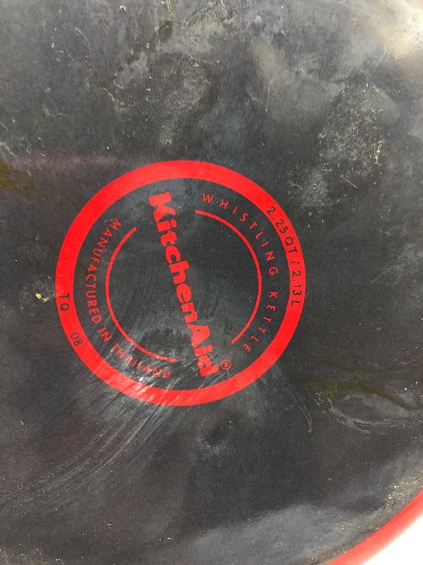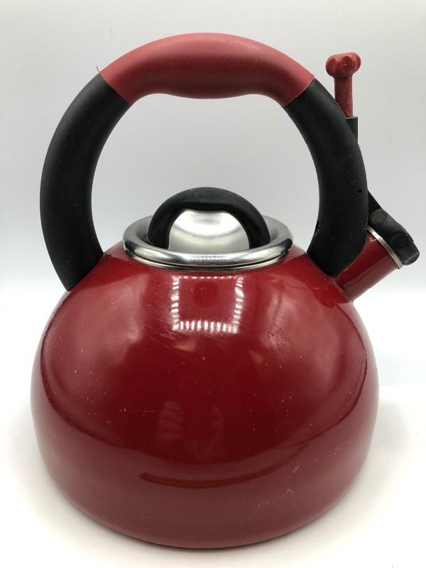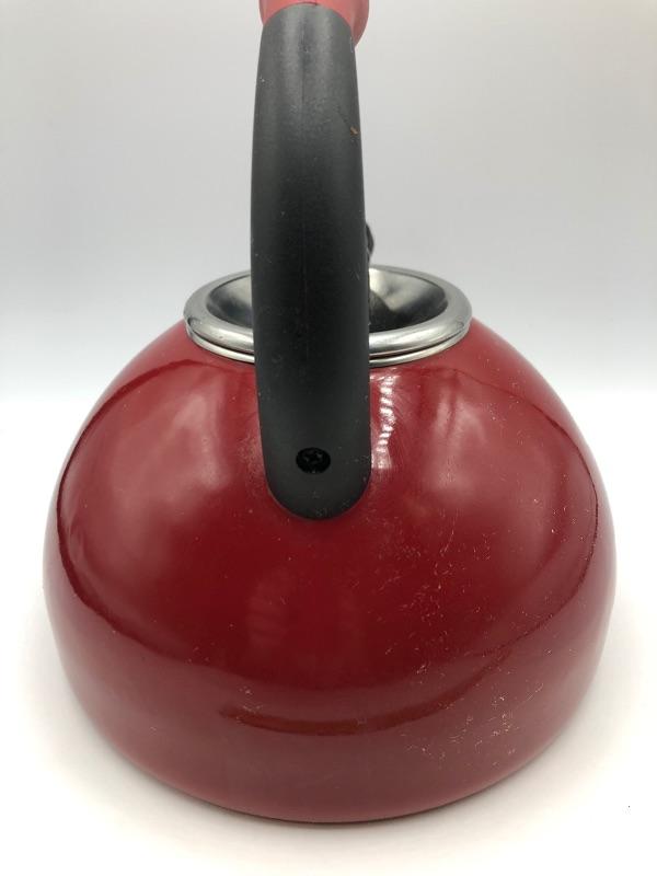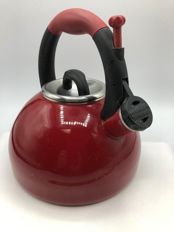 Red KitchenAid Tea Kettle. Has signs of regular use but in good condition. Made for the stove top.
