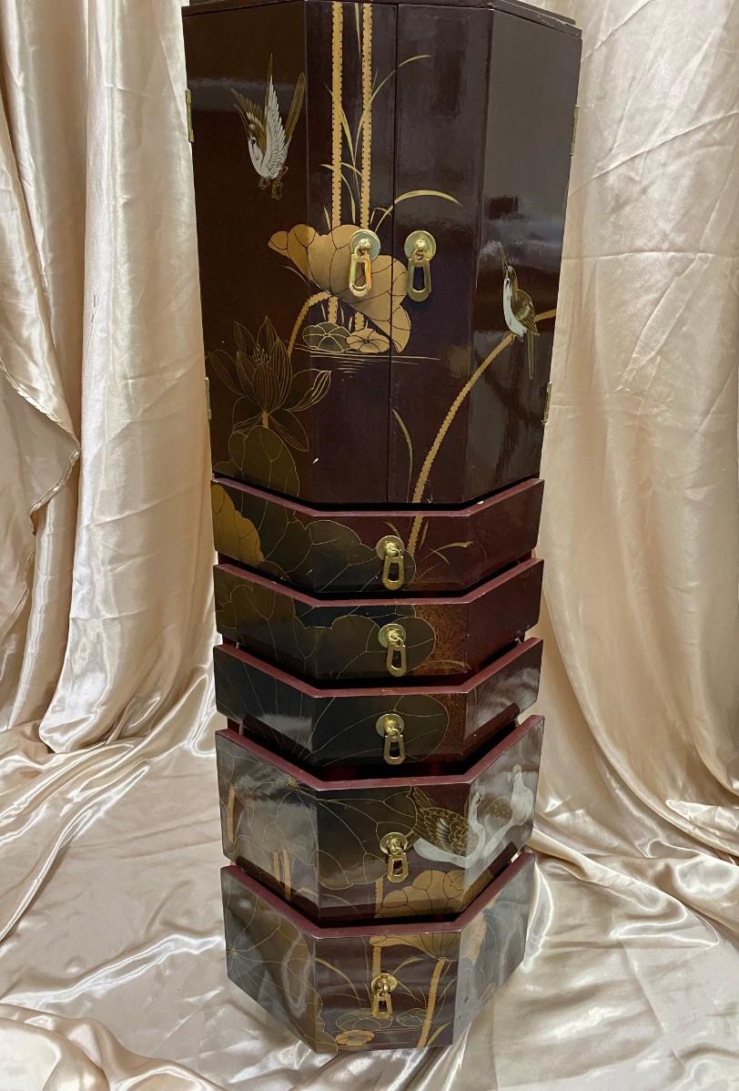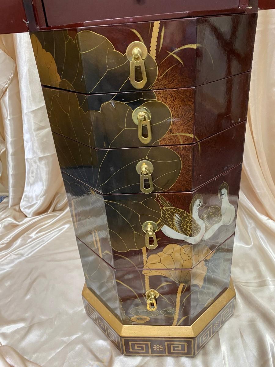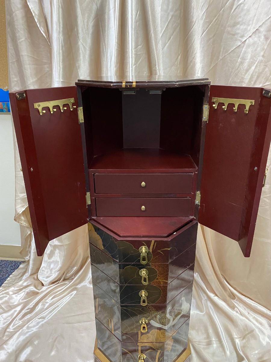 This is a beautiful piece of furniture, Octagon shape, 5 drawers. Necklace hanger, 2 interior drawers. Bird & FLoral motif. There is a slight damage spot on the top. Retail prices are $495 to $1250.