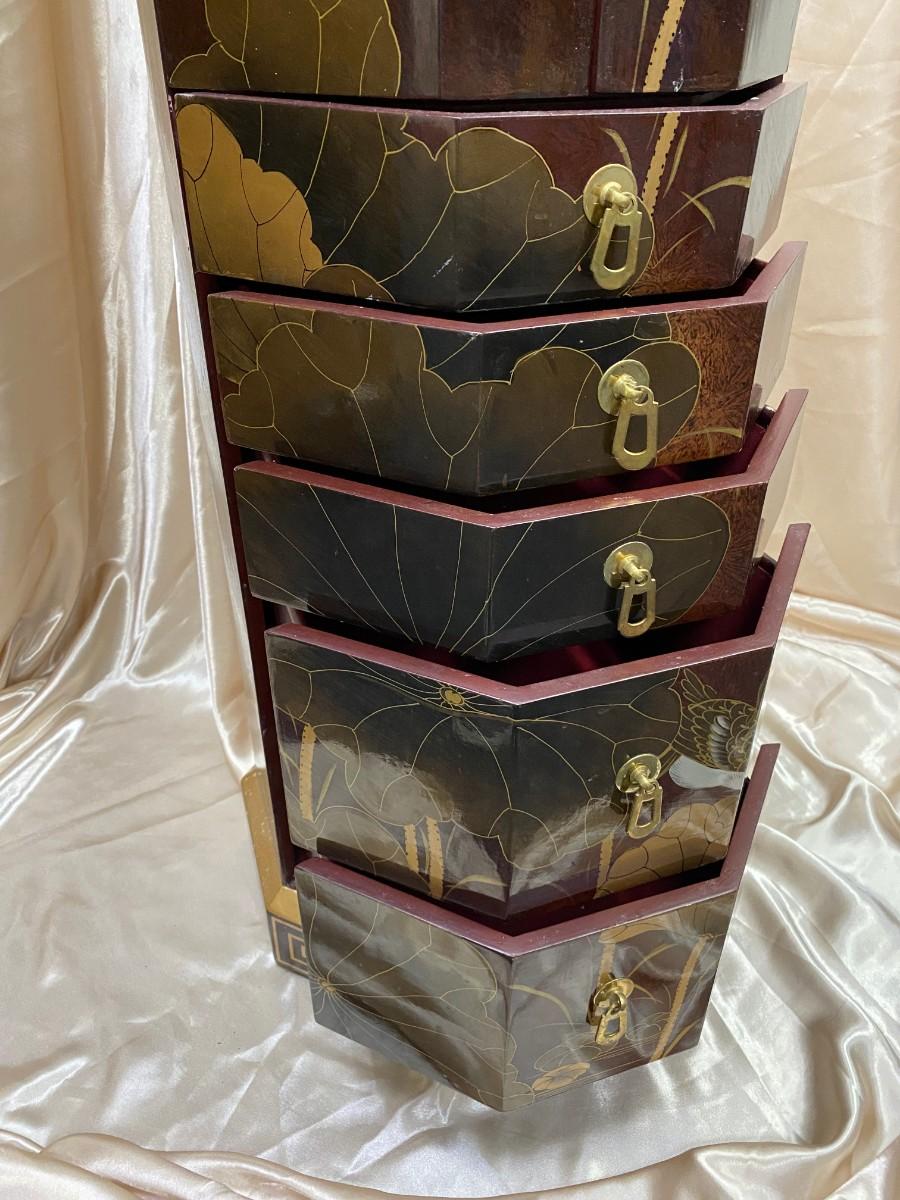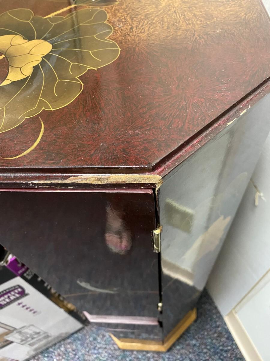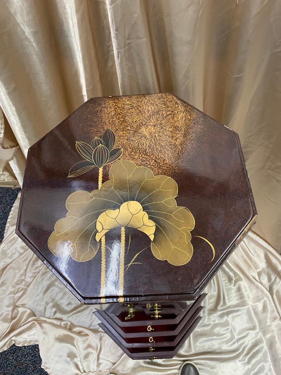 This is a beautiful piece of furniture, Octagon shape, 5 drawers. Necklace hanger, 2 interior drawers. Bird & FLoral motif. There is a slight damage spot on the top. Retail prices are $495 to $1250.