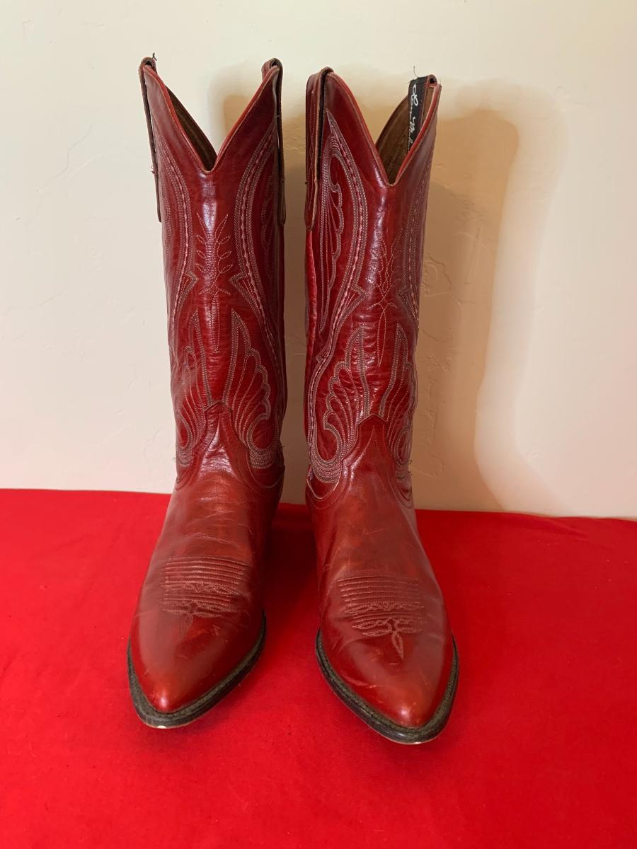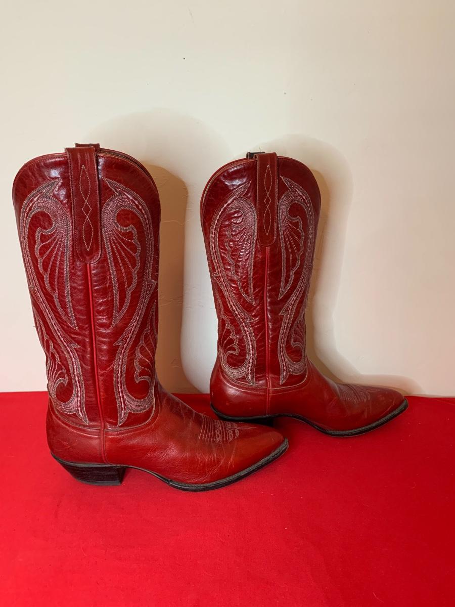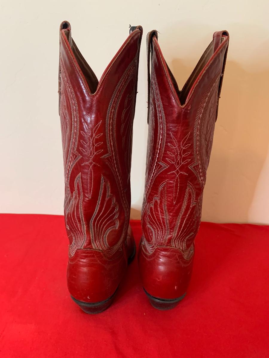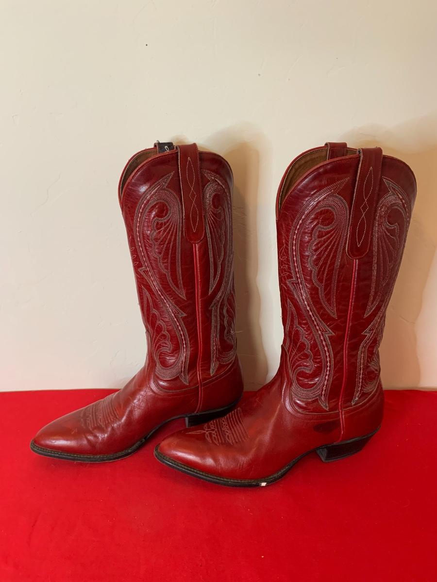 Pair of very nice red women’s Larry Mahan El Paso, leather boots. Red with embroidery. Black scuff on left boot (see photo). Size 8.5 M Made in the USA.