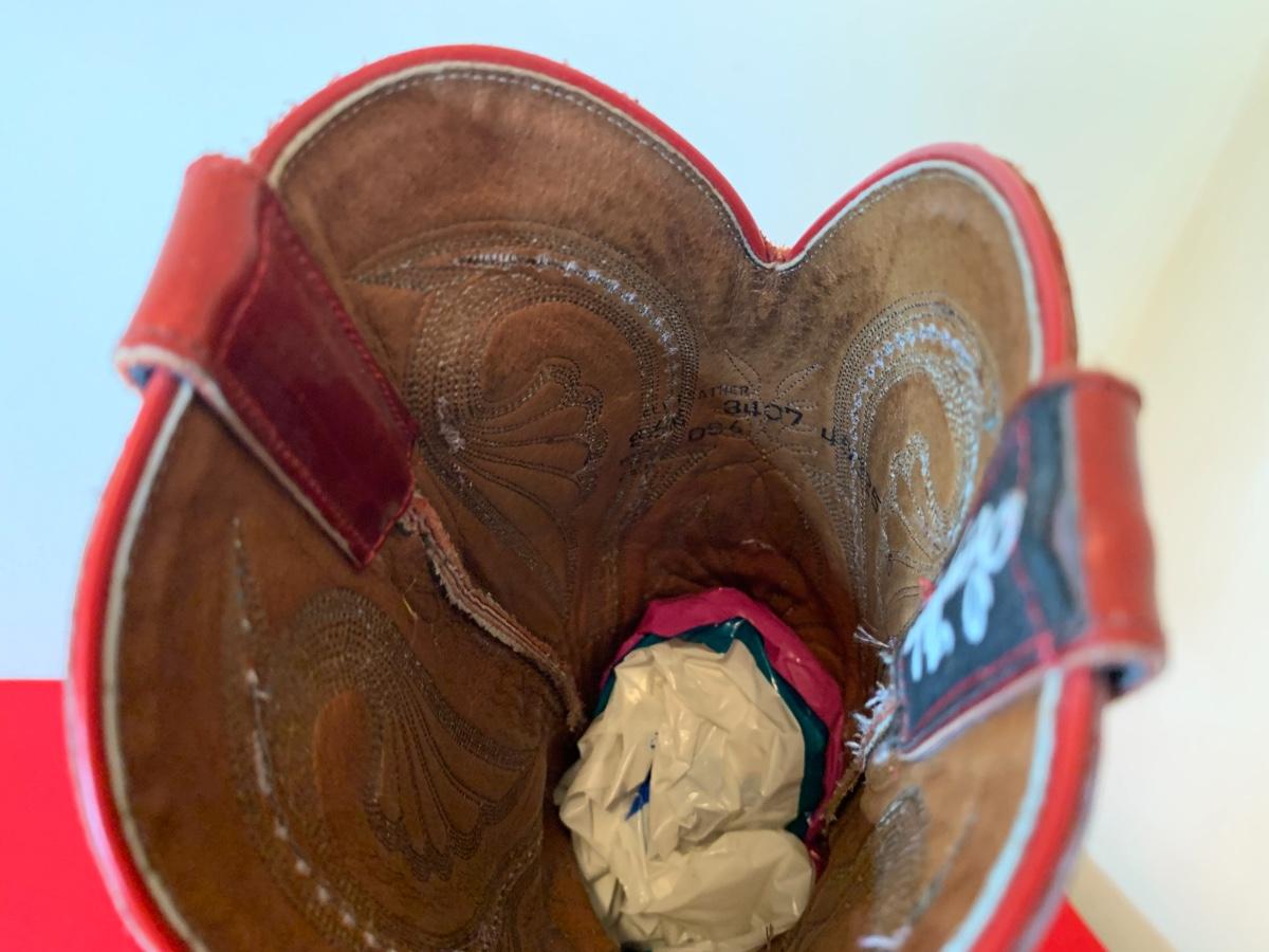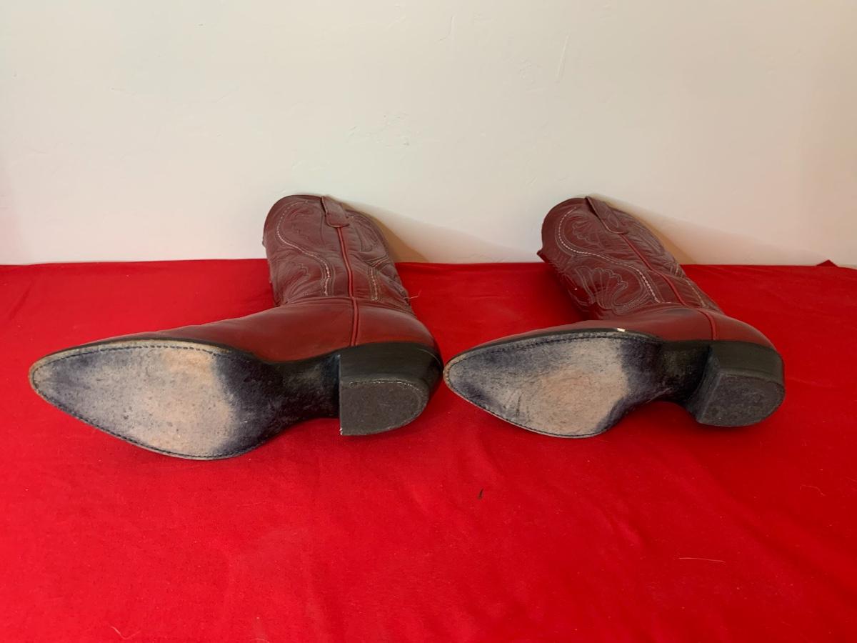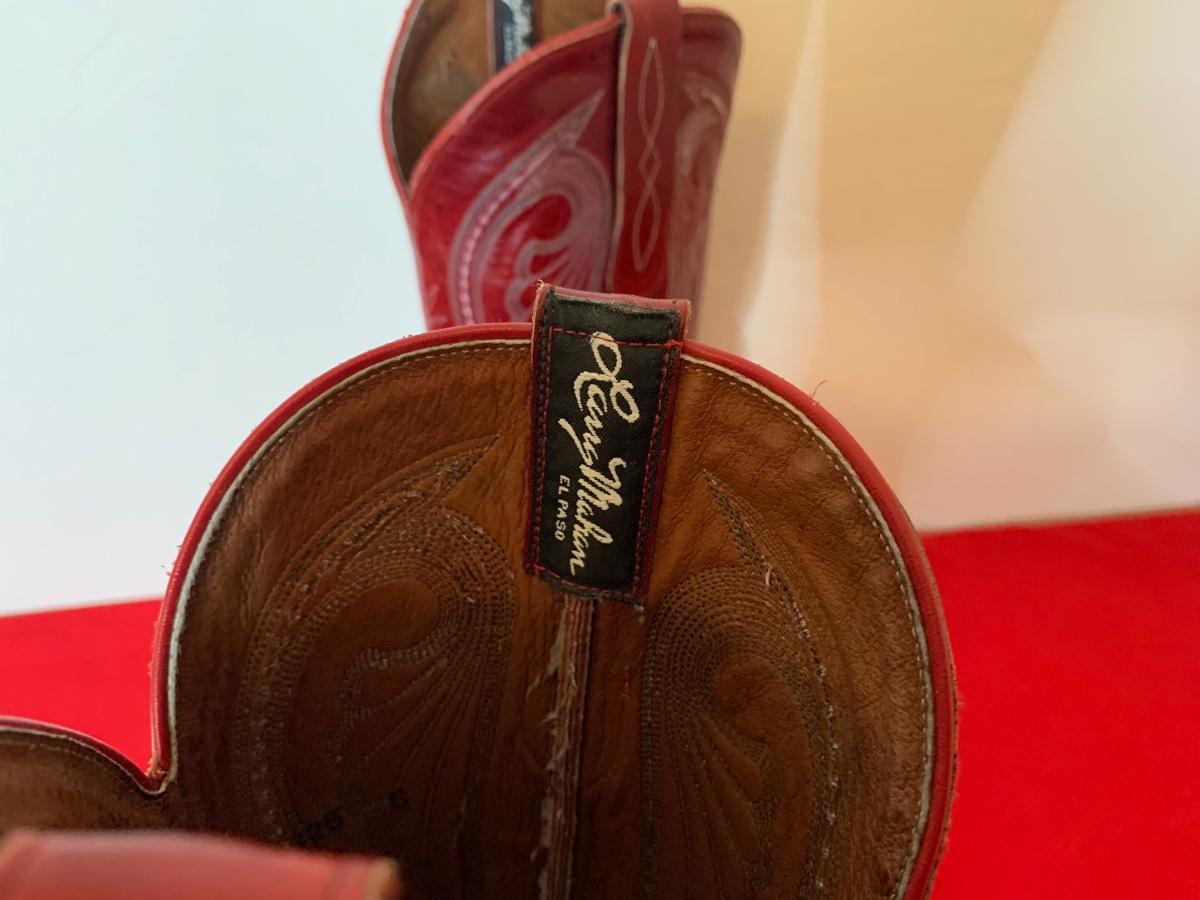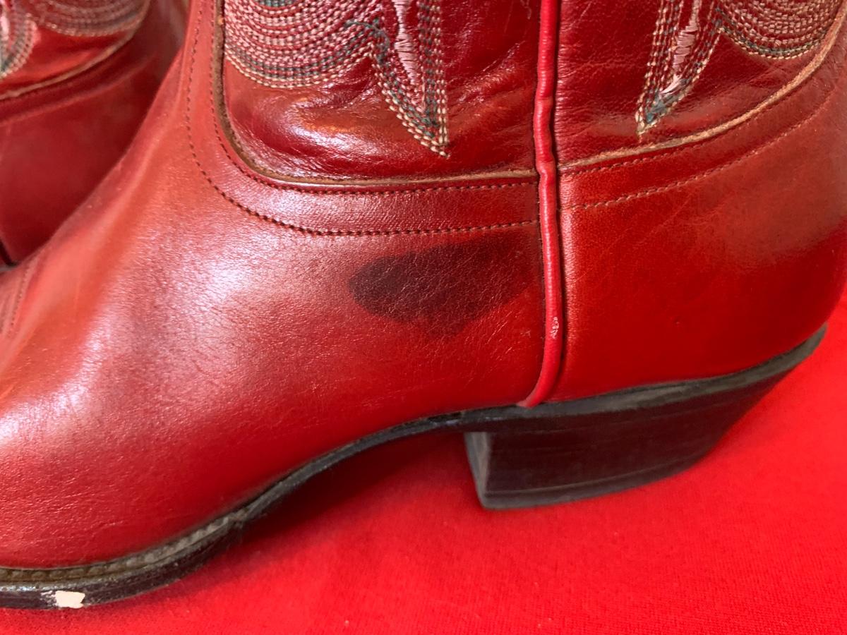 Pair of very nice red women’s Larry Mahan El Paso, leather boots. Red with embroidery. Black scuff on left boot (see photo). Size 8.5 M Made in the USA.