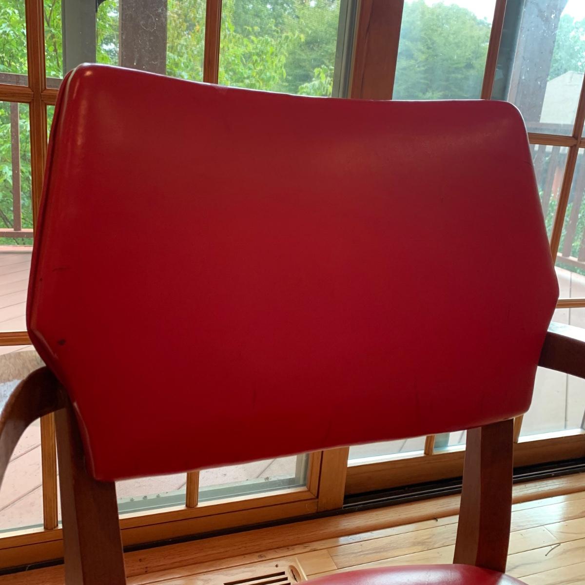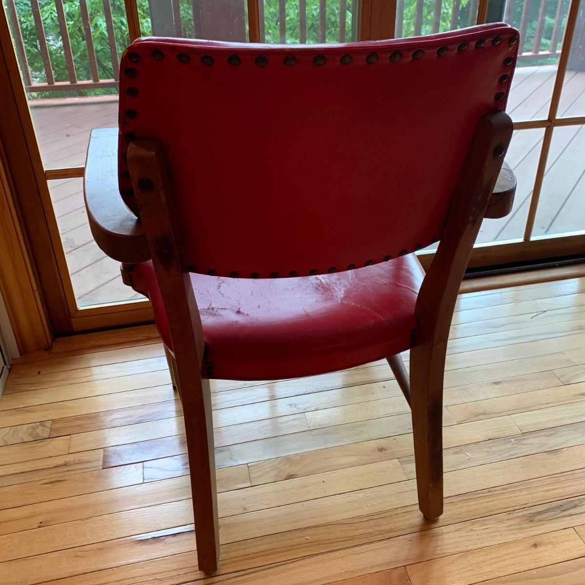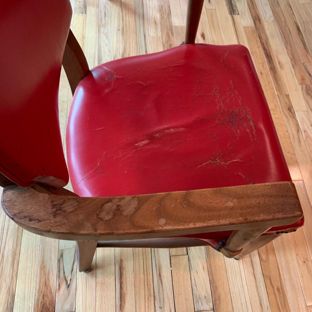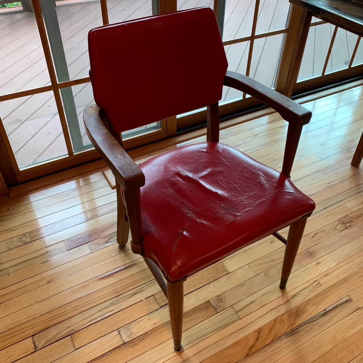 Red leather chair on wood base with label from the B. L. Marble Chair Company. The chair measures 23” x 20” x 33”H with a 17.5” seat height. The chair has quite a bit of wear throughout, see photos.