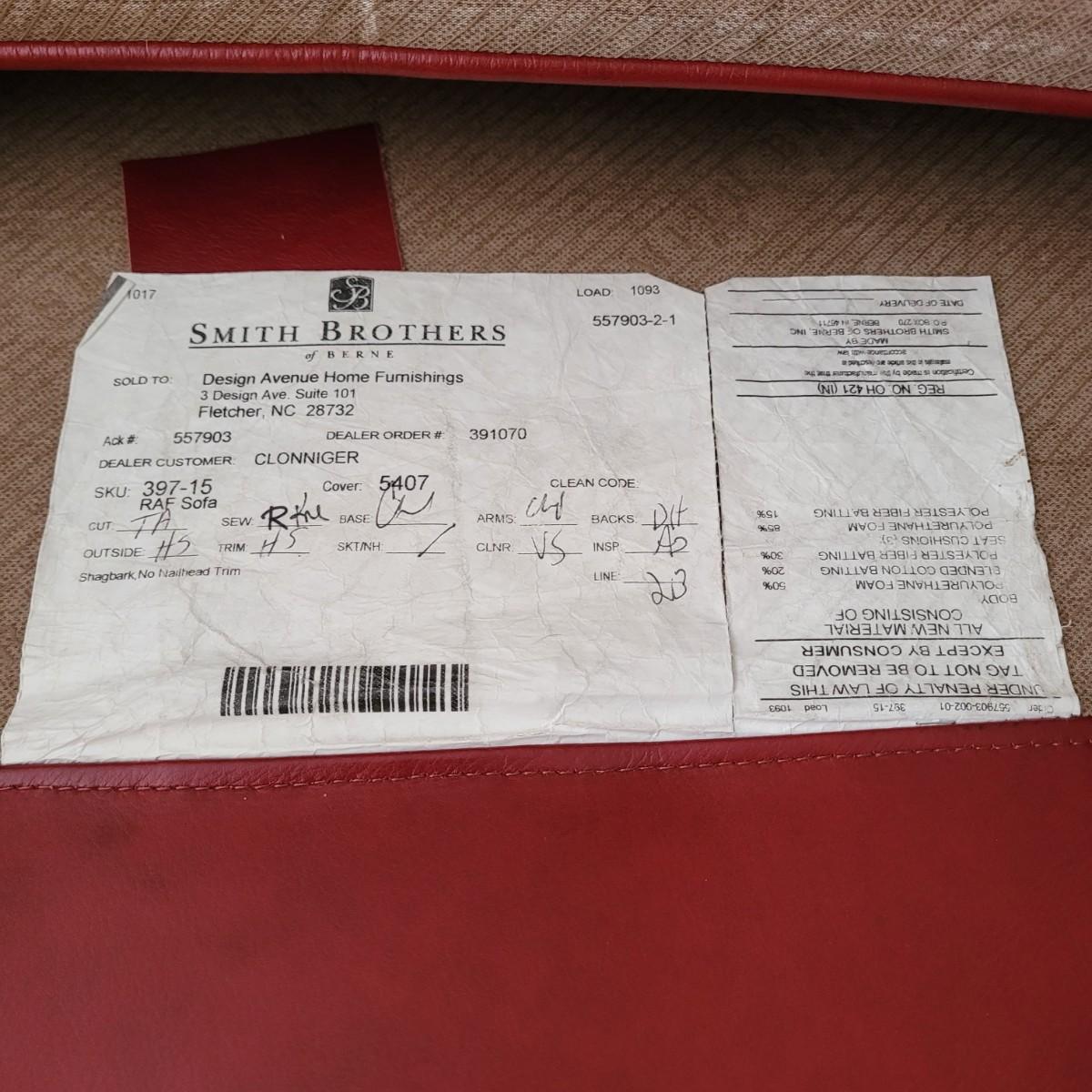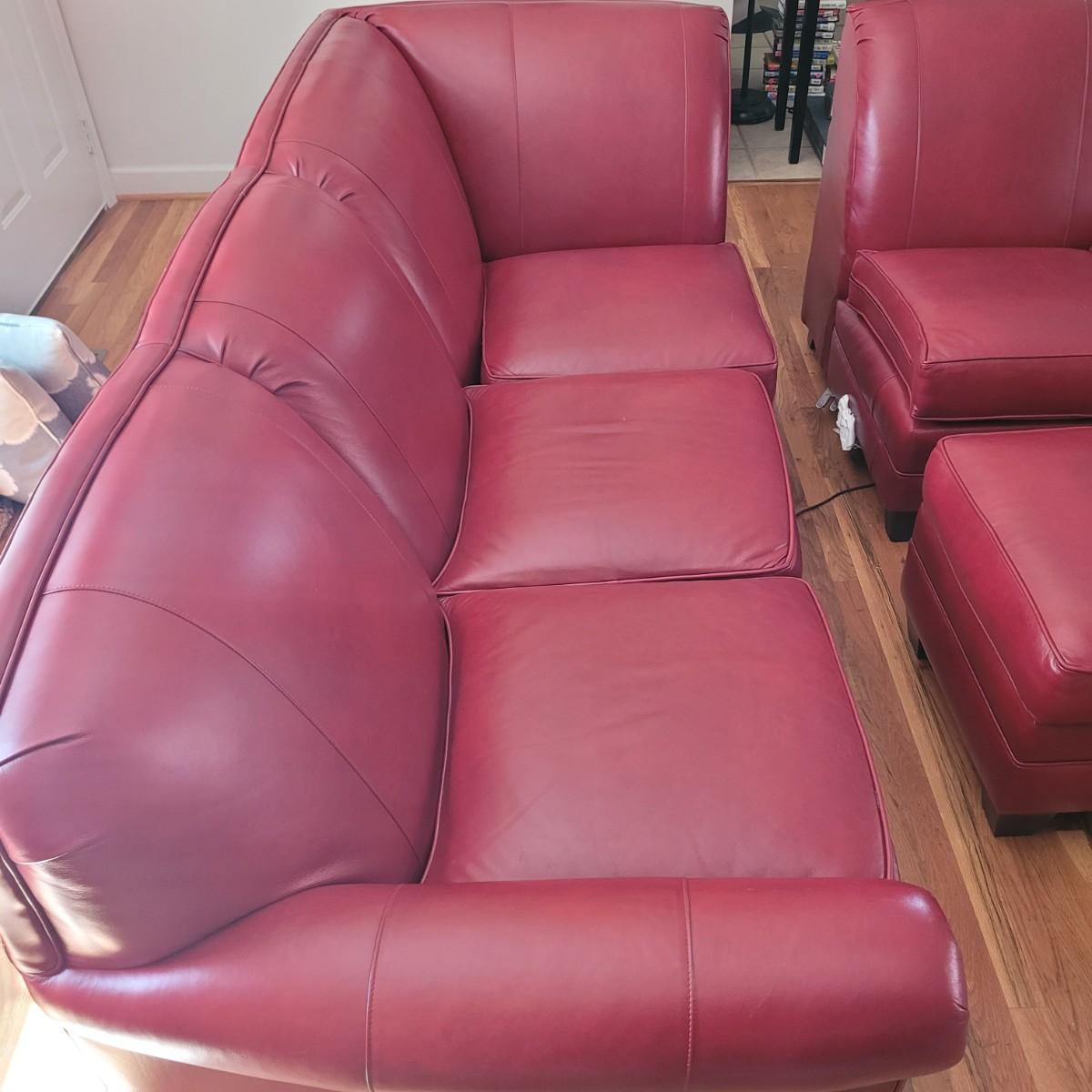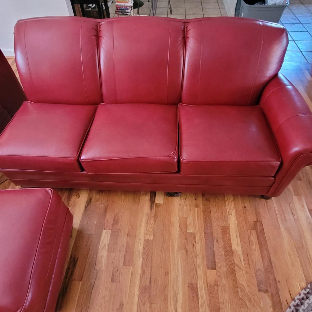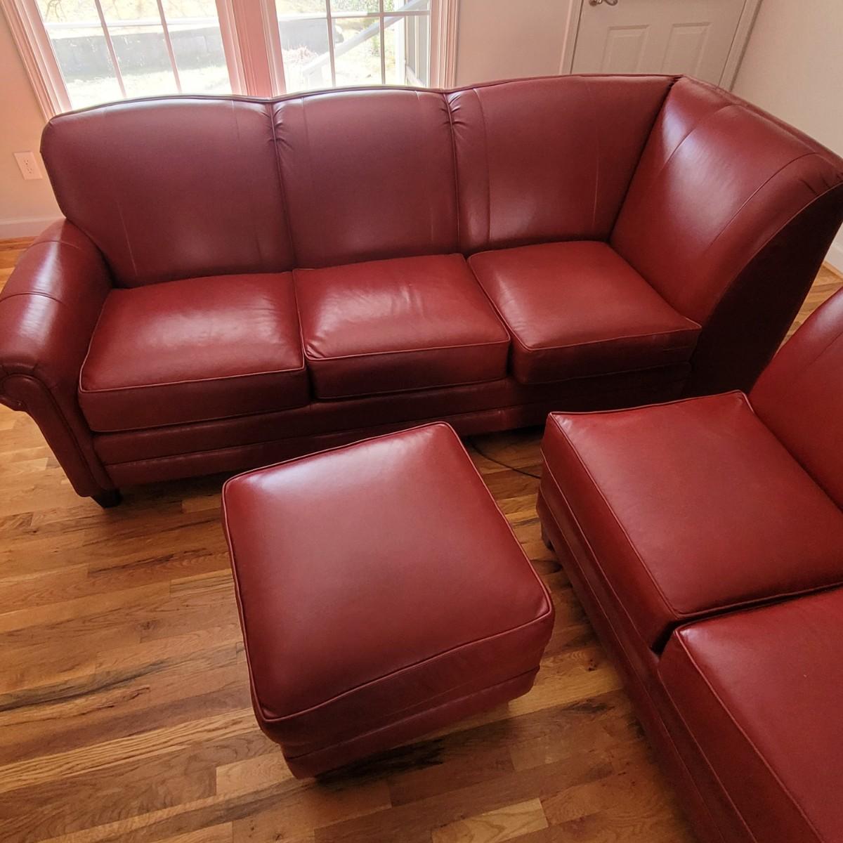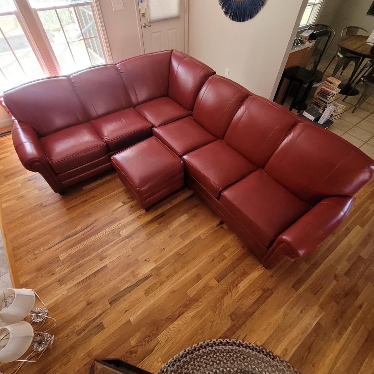 This auction is for large red/ maroon colored sectional couch and ottoman. The couch combines two separate pieces together to form an L-shaped seating arrangement. It is a Smith Brothers brand couch. The smaller section measures 76" x 38" x 35"H. The larger piece measures 90" x 37" x 35"H. The ottoman measures 24" x 24" x 20"H. The entire couch is in very good condition with no signs of damage to be seen.