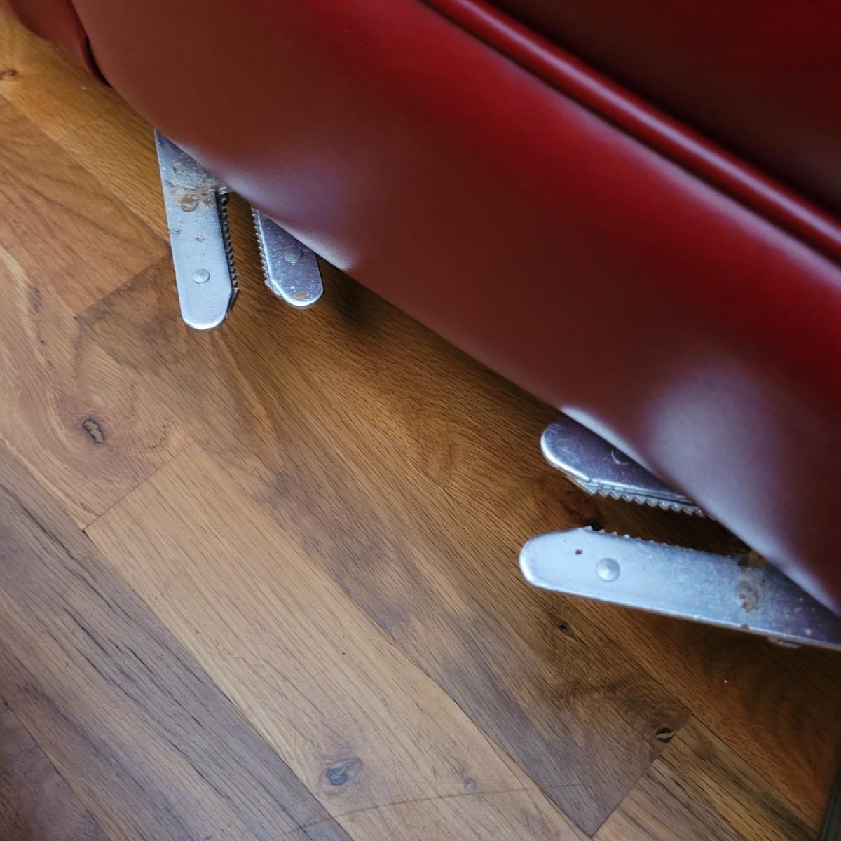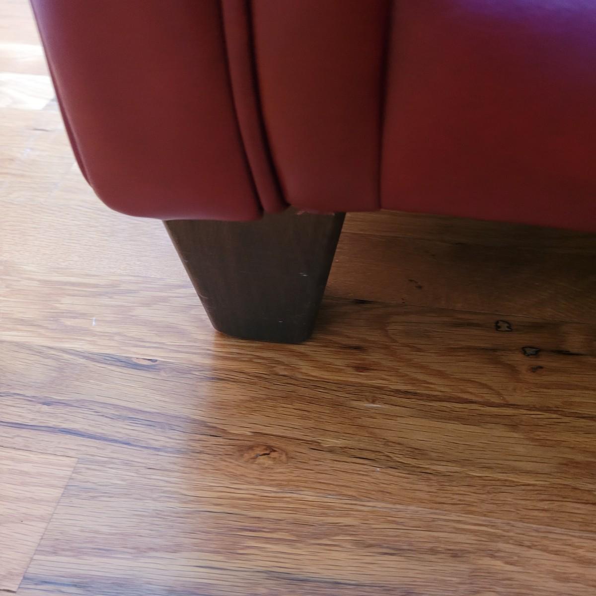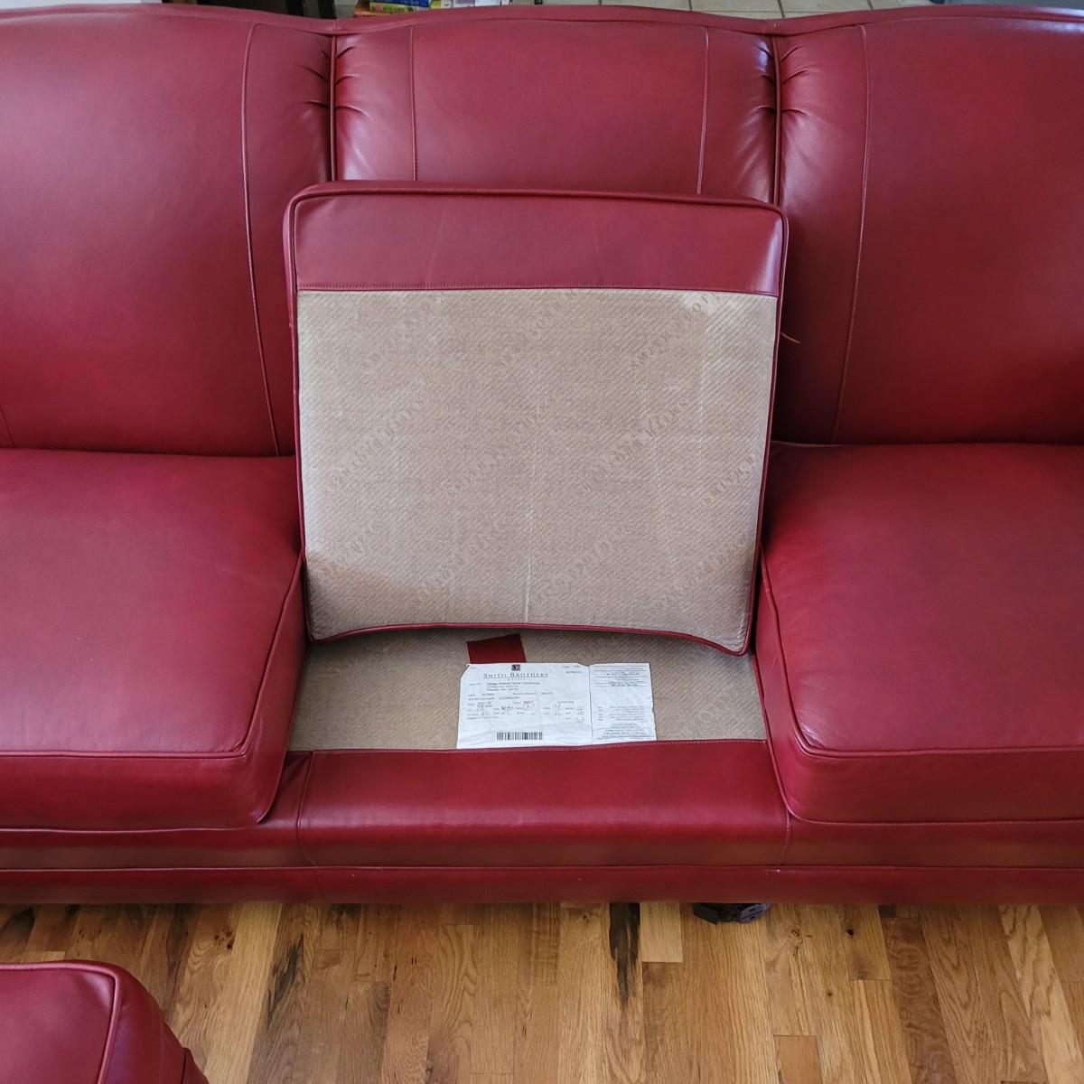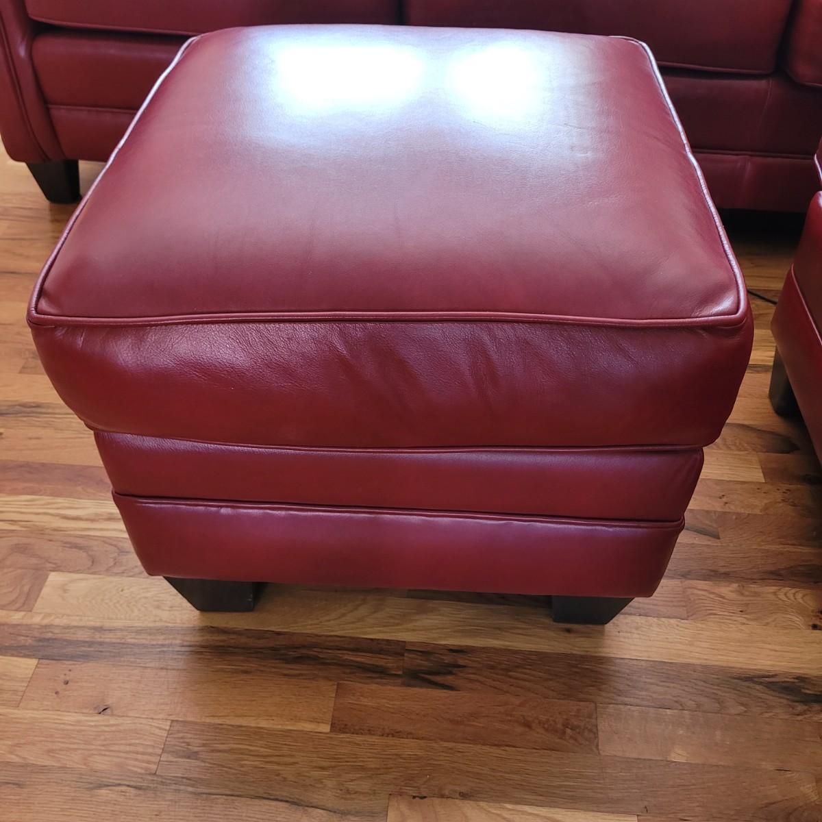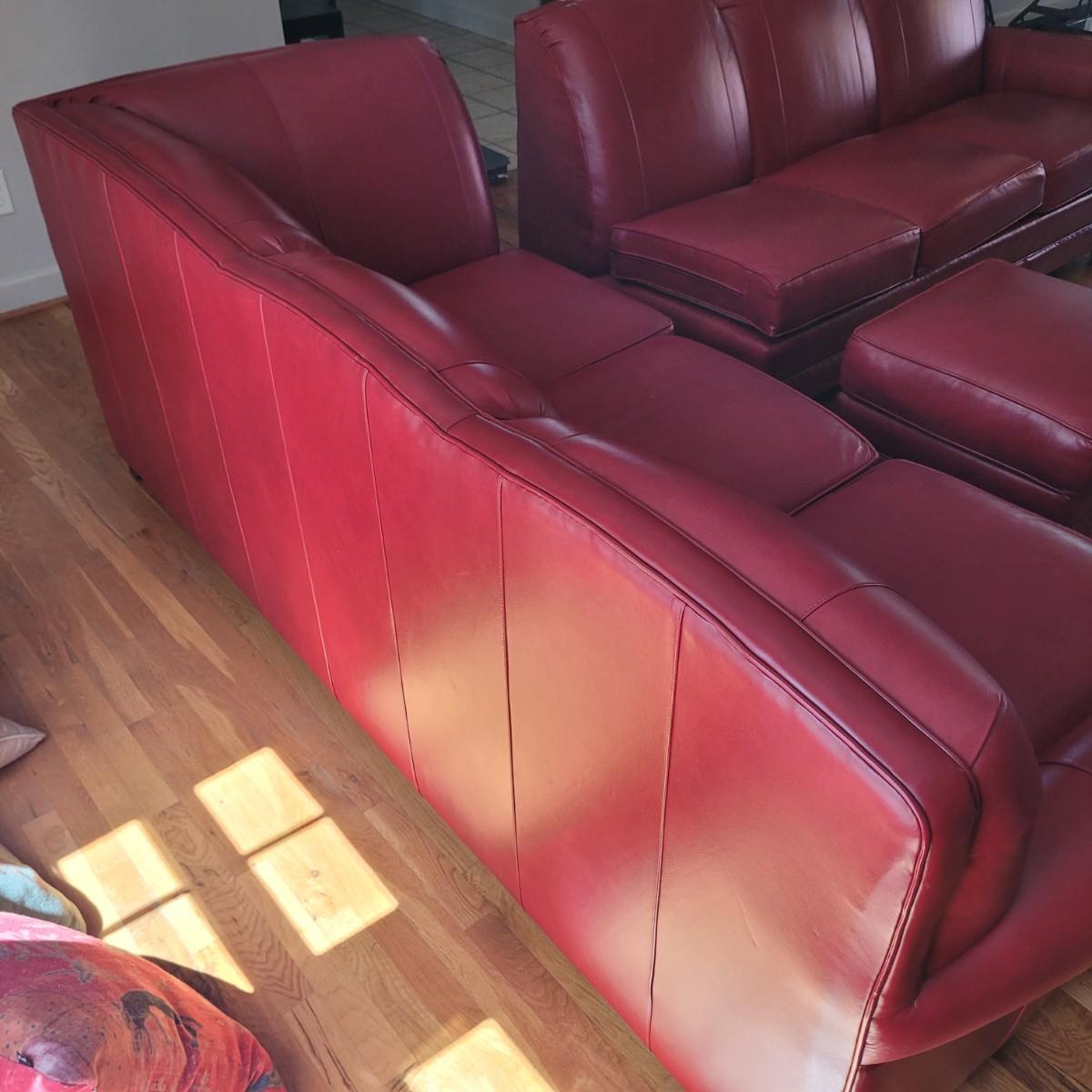 This auction is for large red/ maroon colored sectional couch and ottoman. The couch combines two separate pieces together to form an L-shaped seating arrangement. It is a Smith Brothers brand couch. The smaller section measures 76" x 38" x 35"H. The larger piece measures 90" x 37" x 35"H. The ottoman measures 24" x 24" x 20"H. The entire couch is in very good condition with no signs of damage to be seen.
