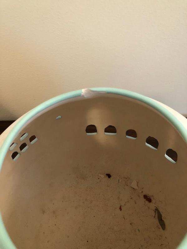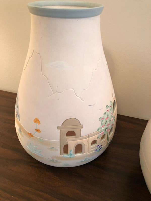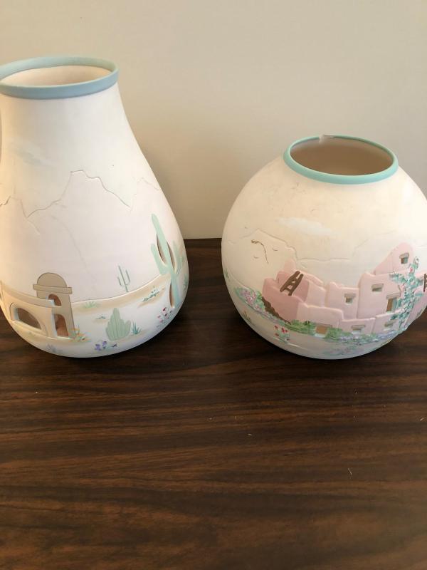 Here are a pair of Southwestern style vases. from Redline Studio...Good condition on the larger 17' pot...There is an inner rim chip on the smaller 10" high round pot....(pictured)...