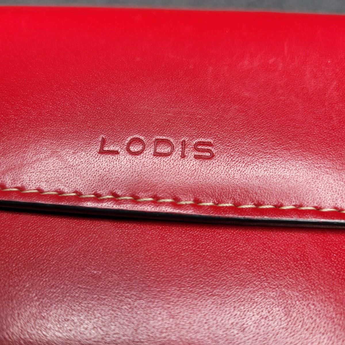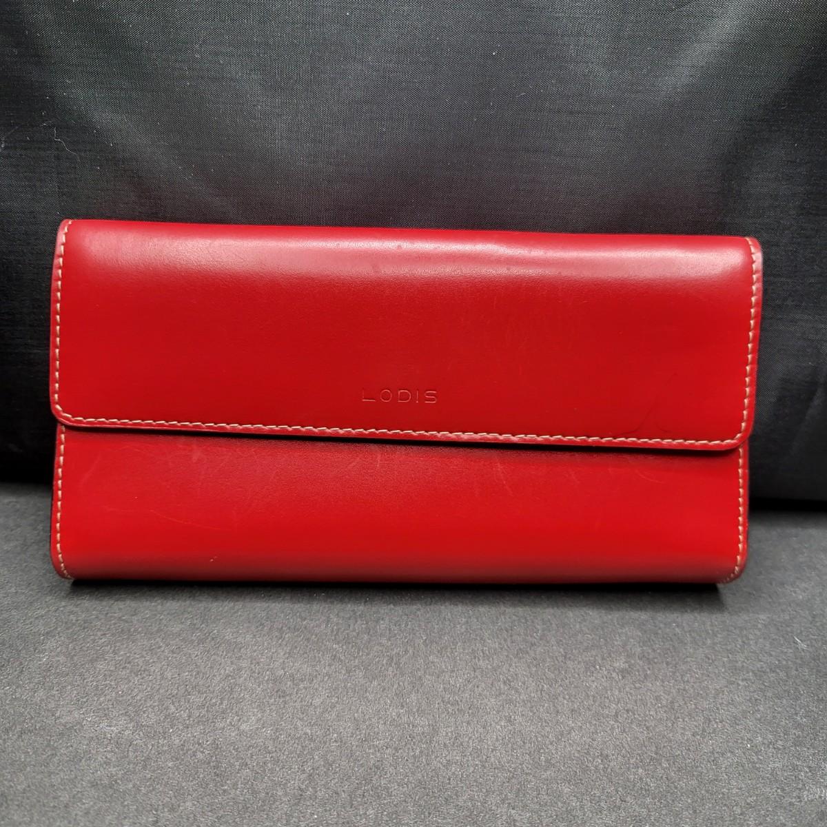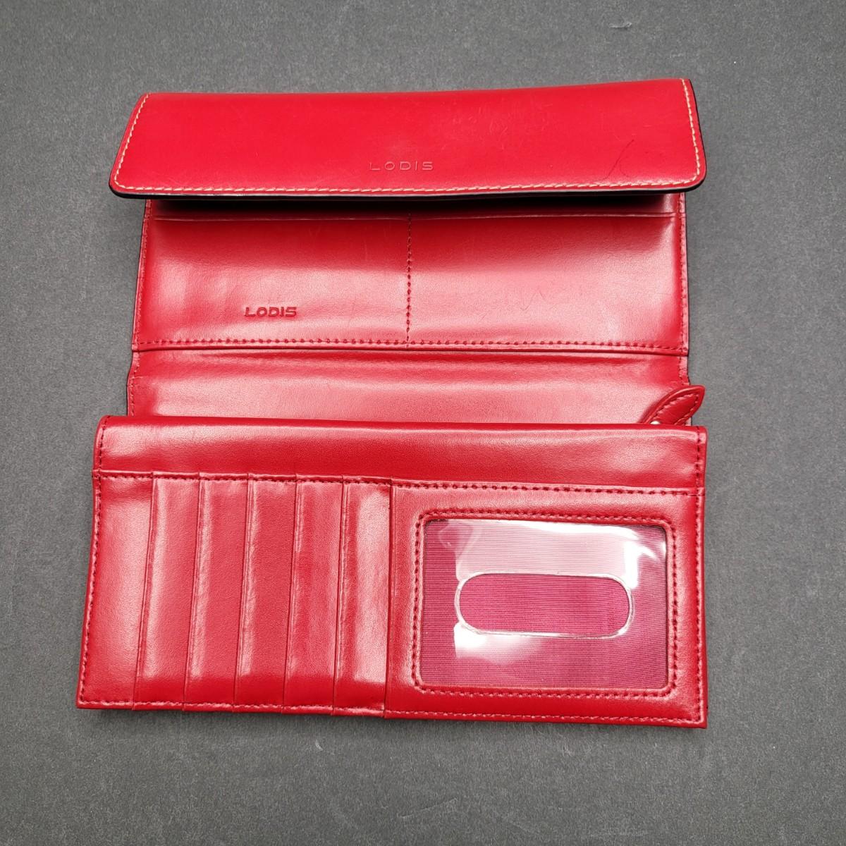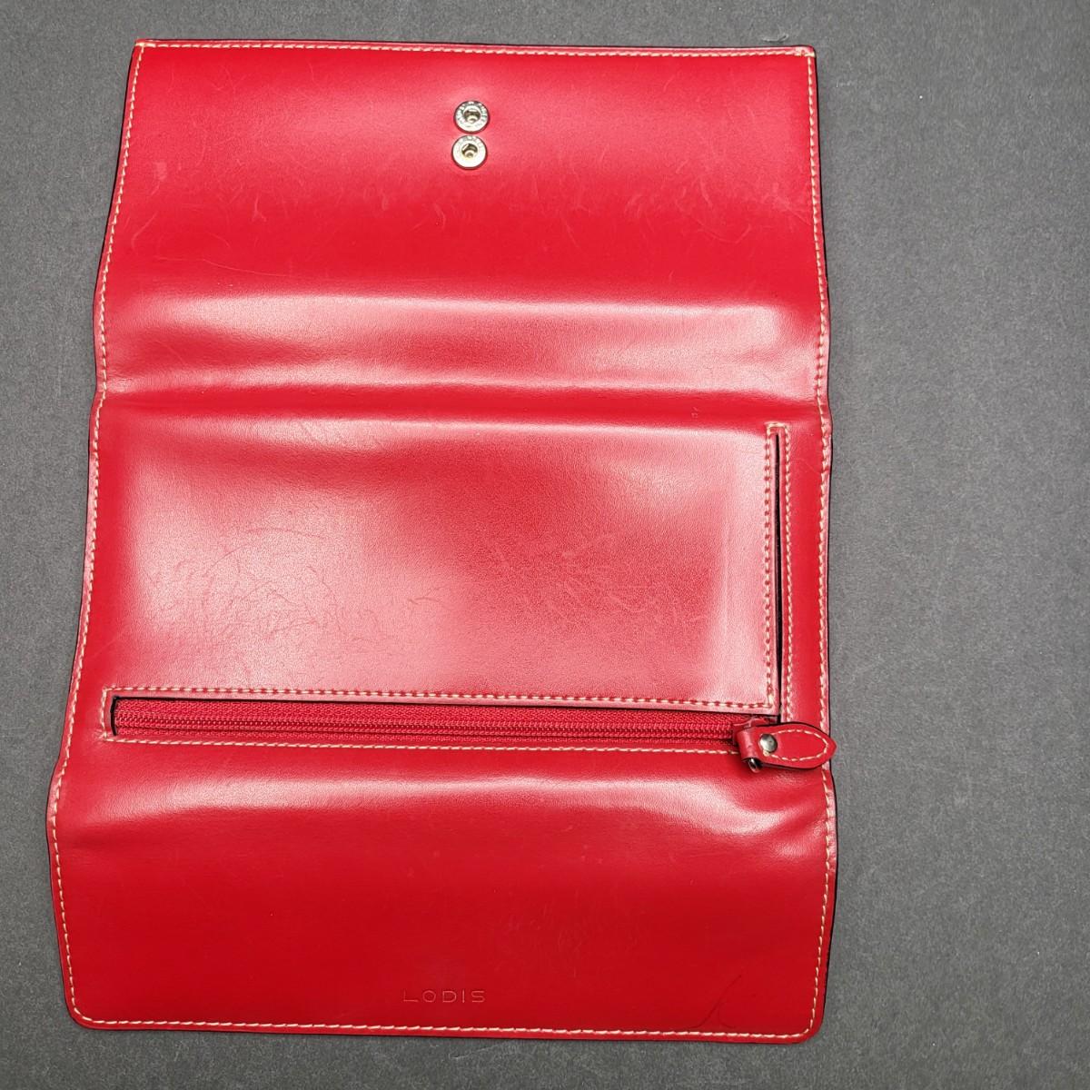 Snap closure trifold checkbook style Lodis brand red leather wallet. External zipper compartment. 12 card slots, inside zipper pocket and several lo g slots for cash, receipts, etc.