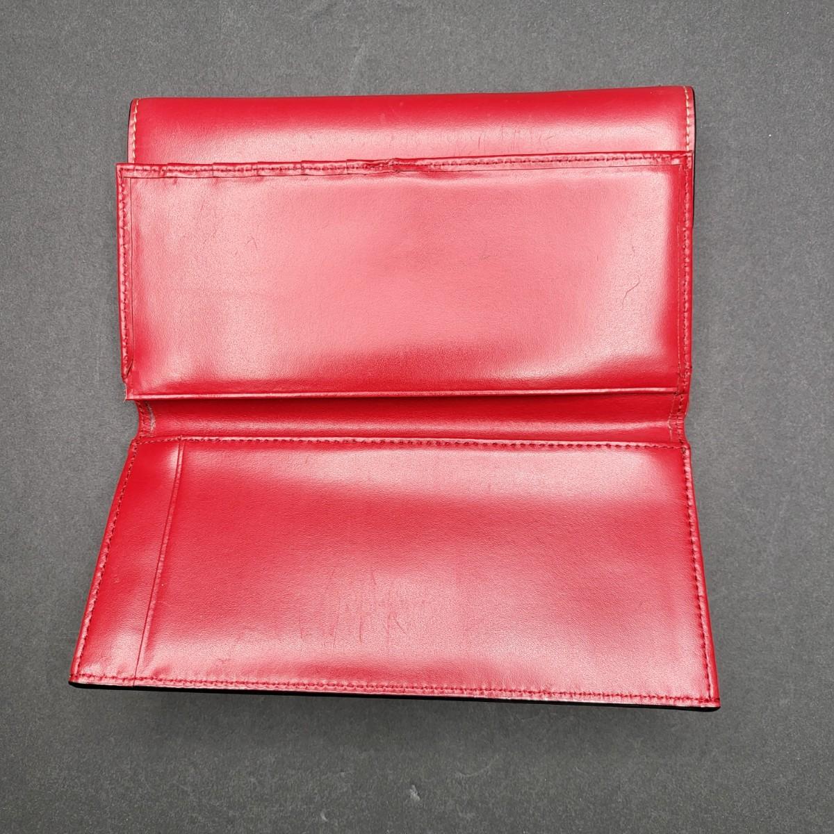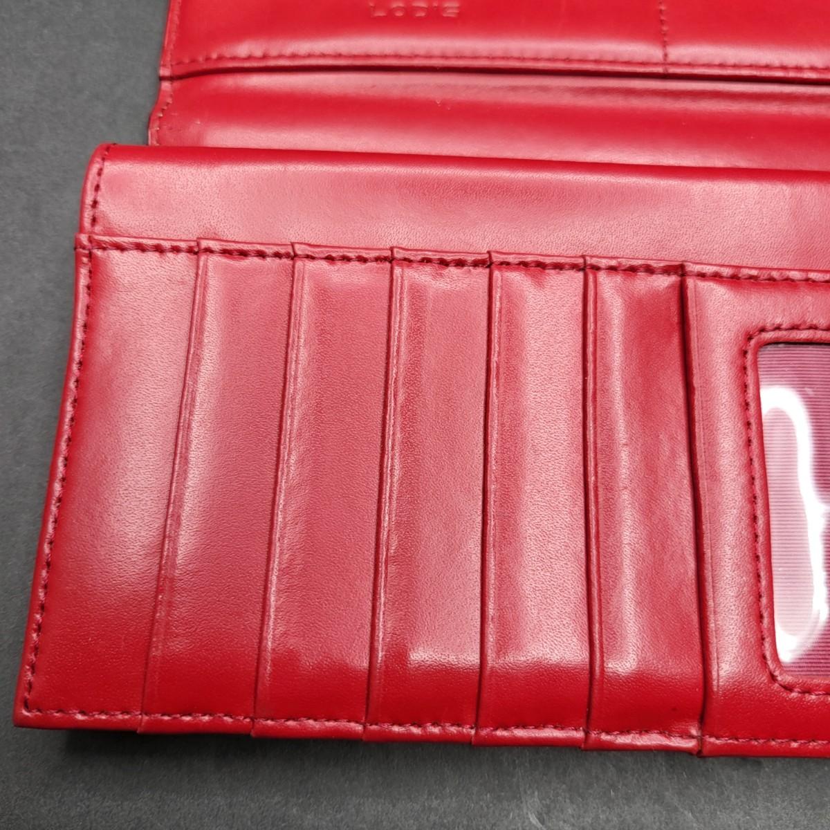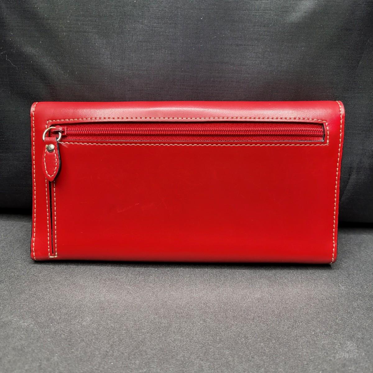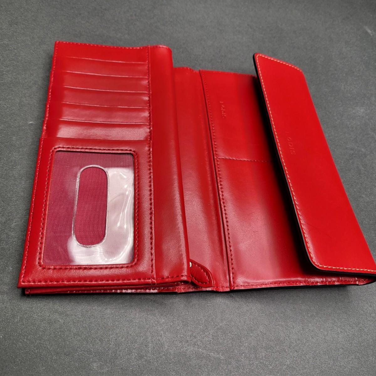 Snap closure trifold checkbook style Lodis brand red leather wallet. External zipper compartment. 12 card slots, inside zipper pocket and several lo g slots for cash, receipts, etc.