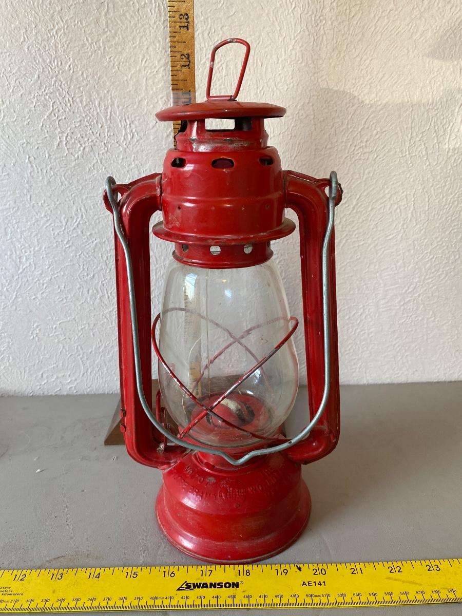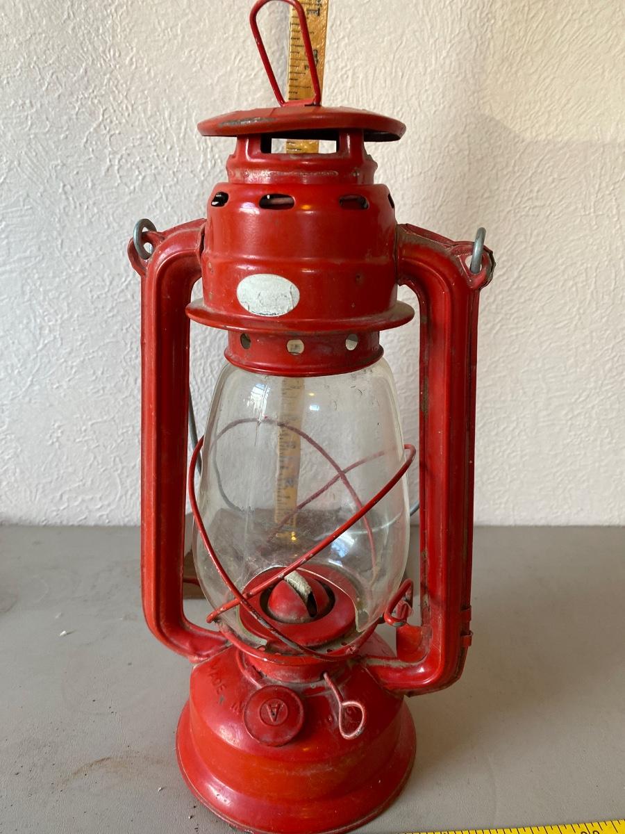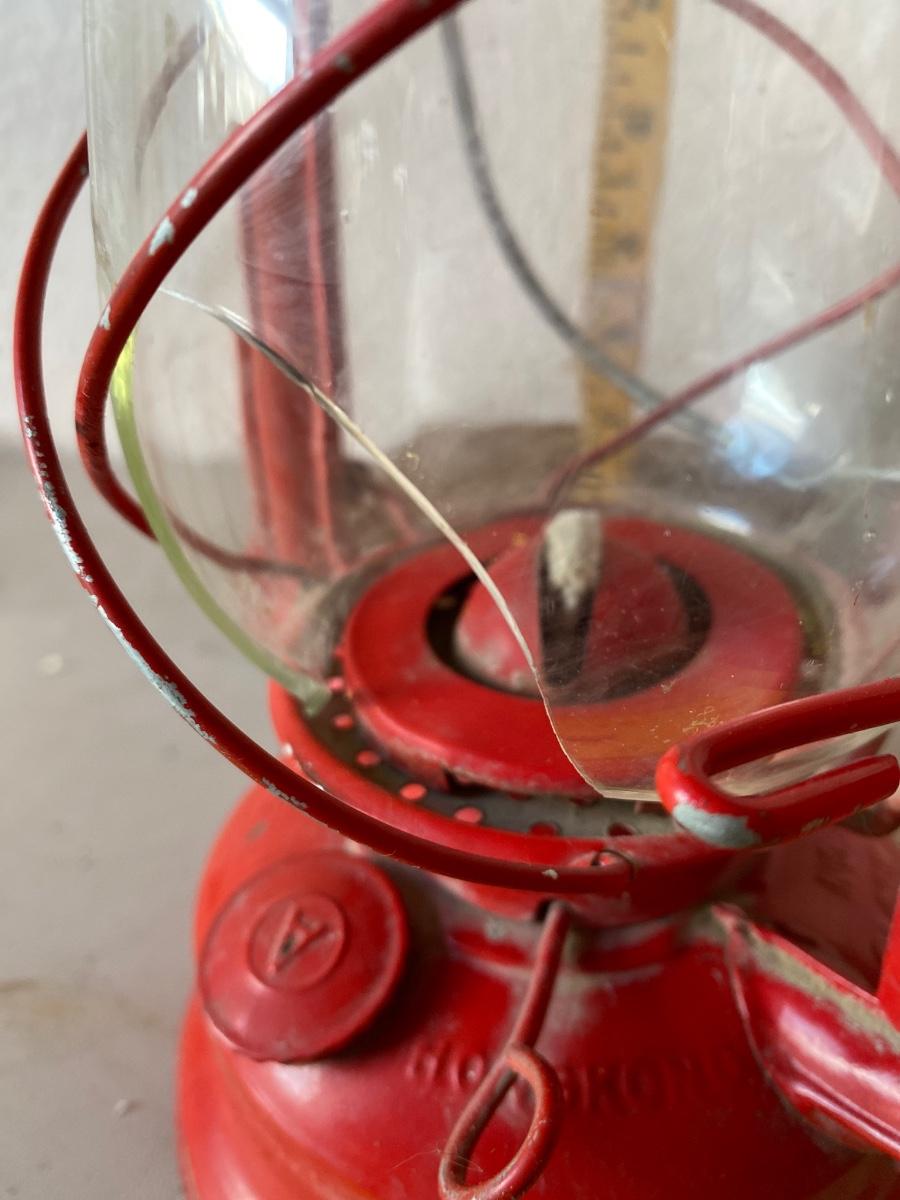 Nice metal oil, camping lamp. The globe does have a chunk broken out of it.