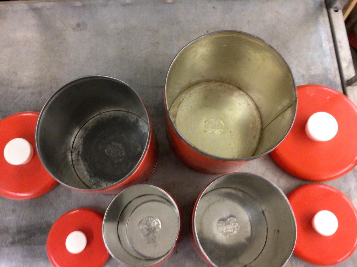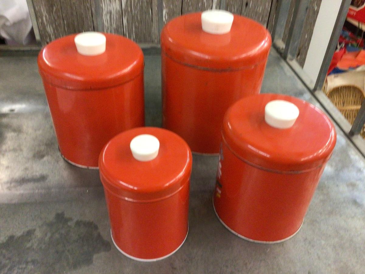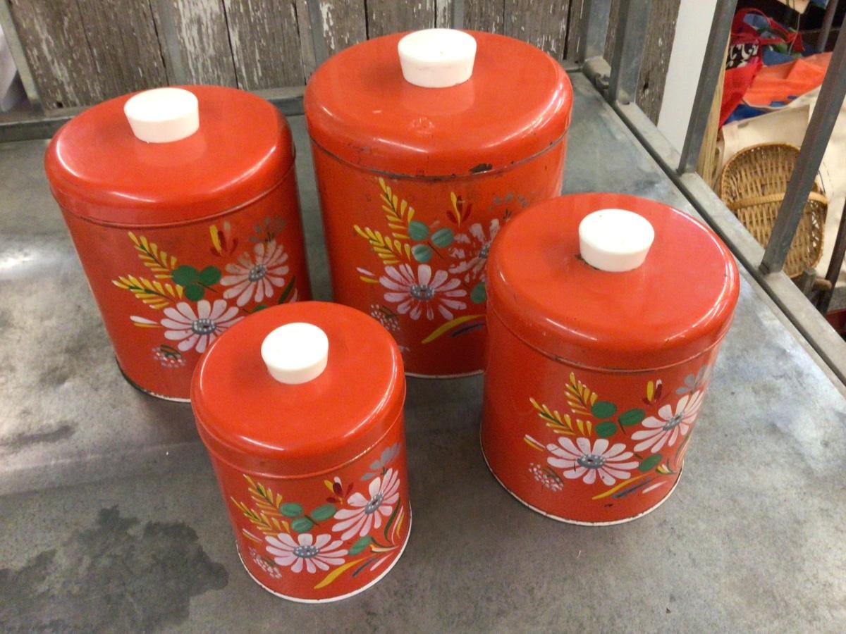 This is a great set of vintage metal canister set. Red with flowers painted on them.