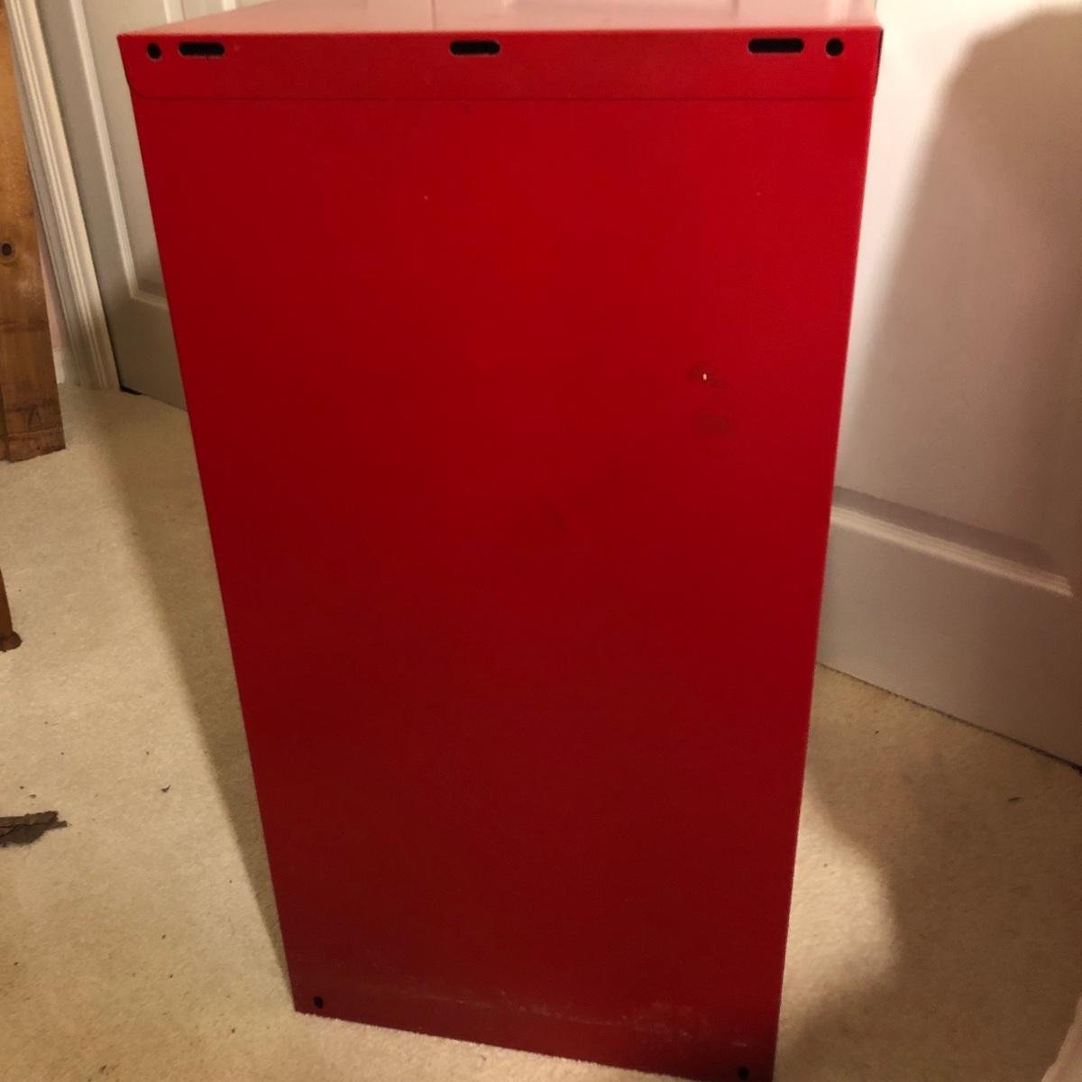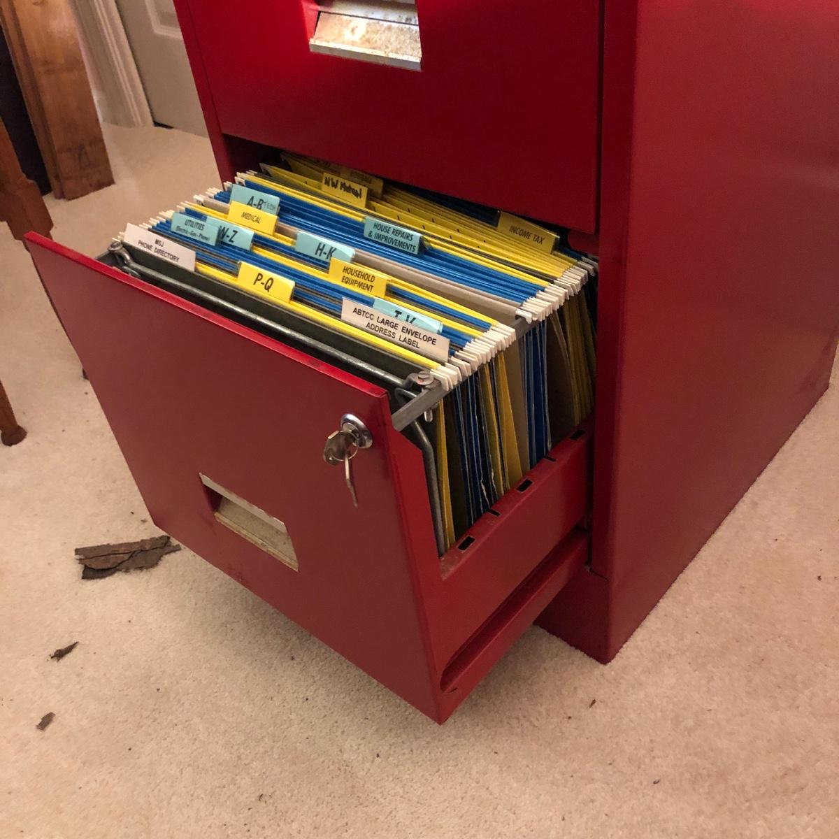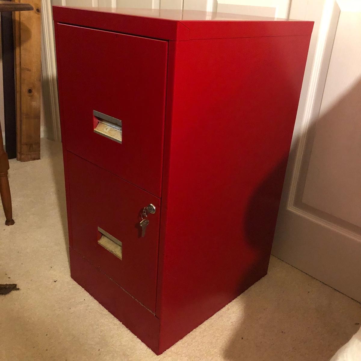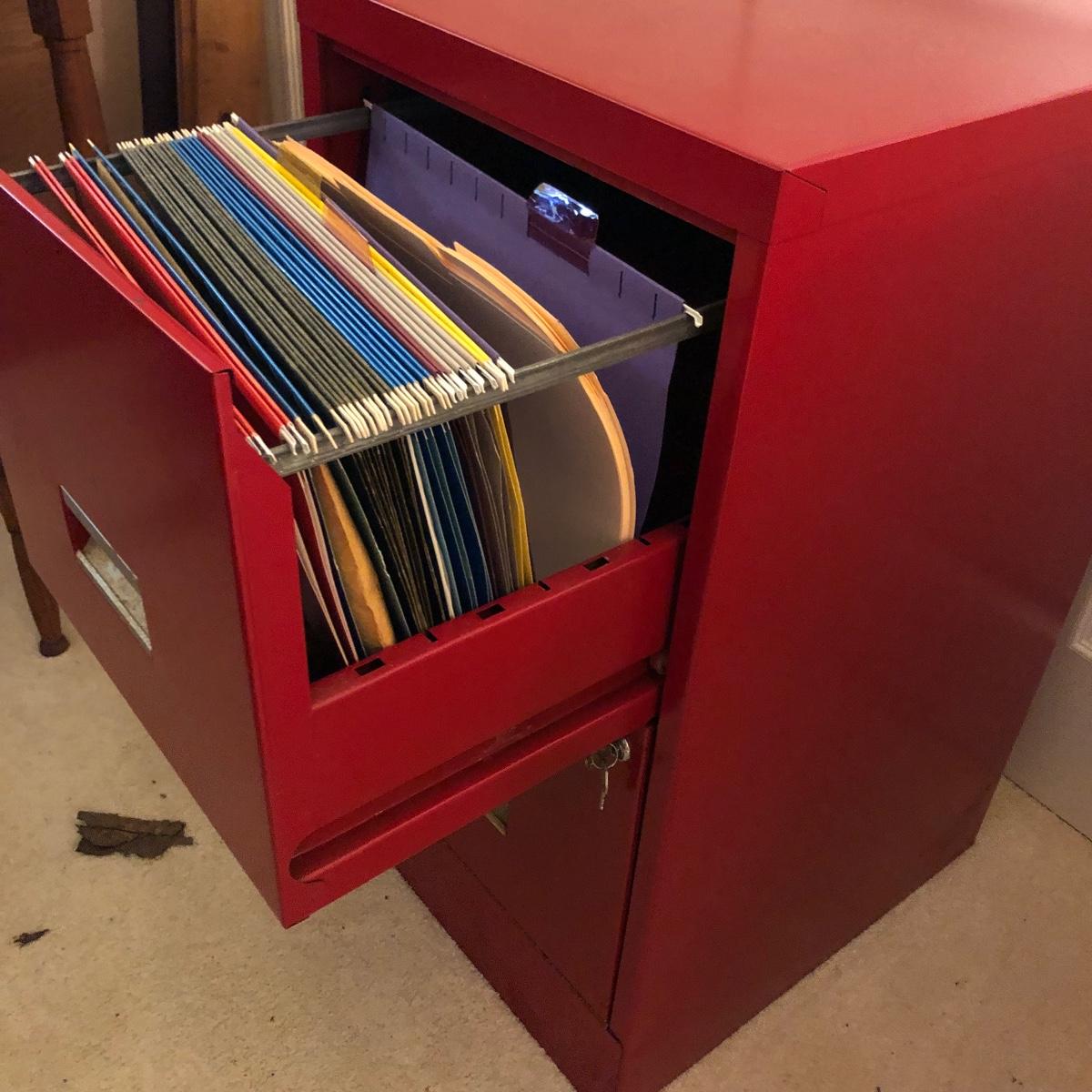 Lot includes a two drawer red metal file cabinet with keys and folders. Cabinet measures 15” x 18” x 29”.