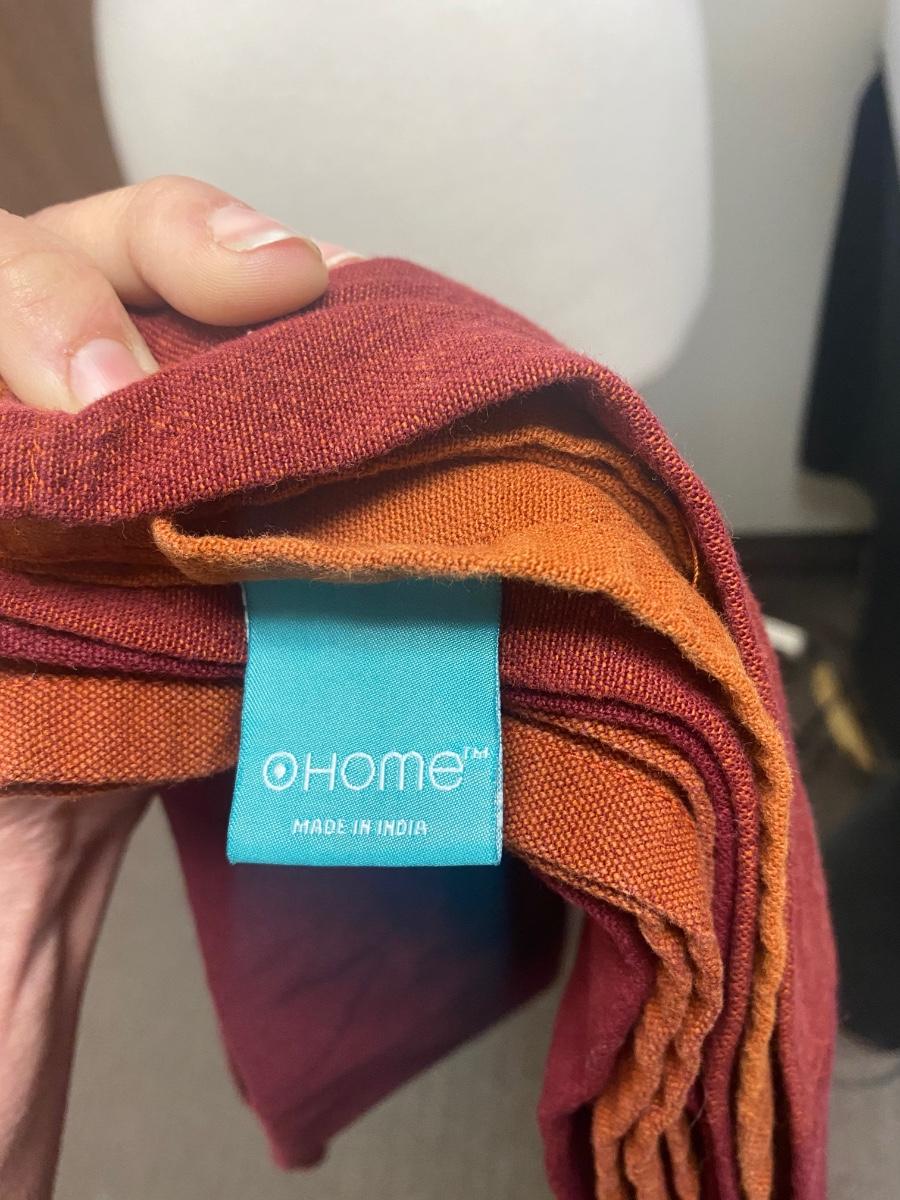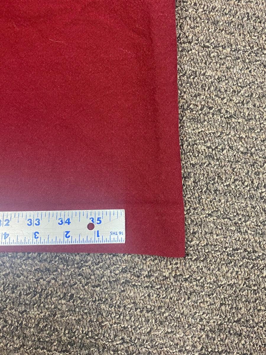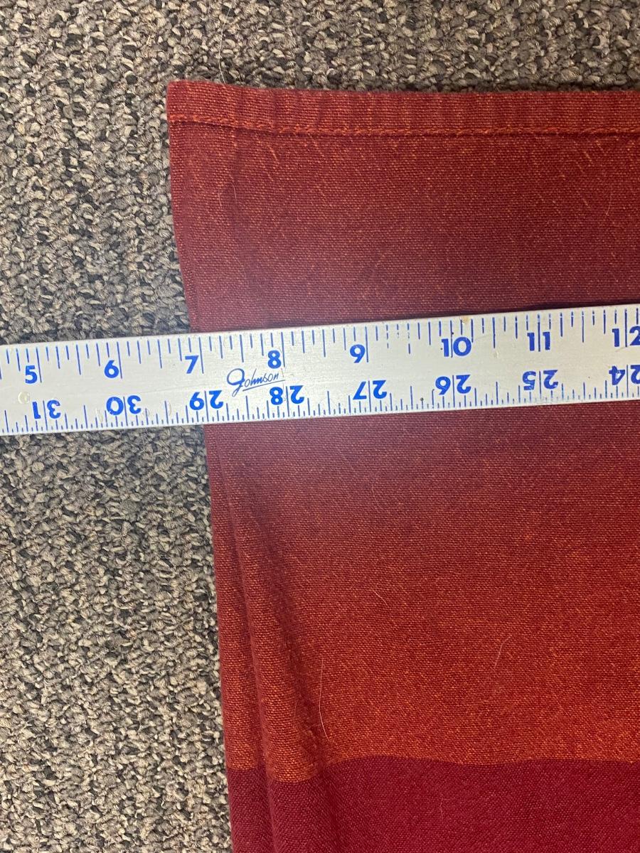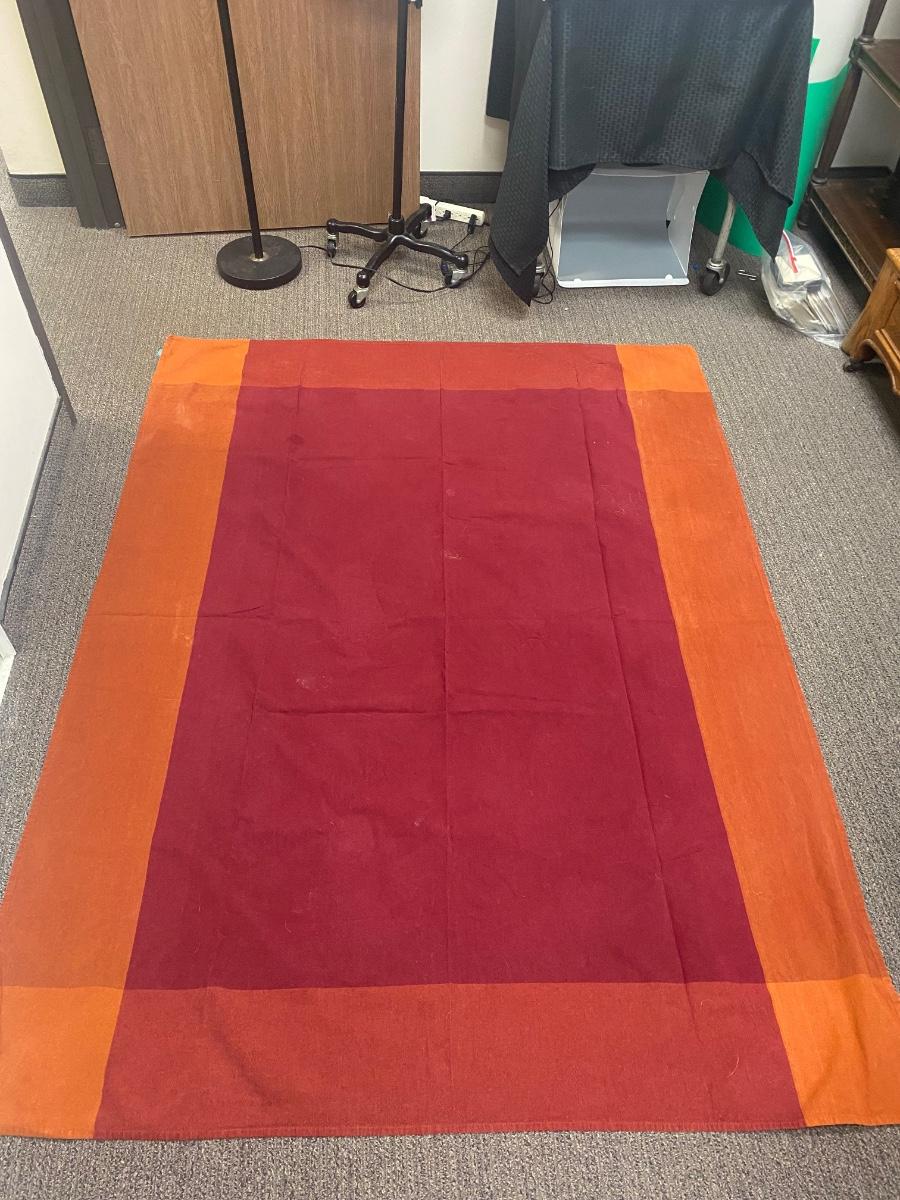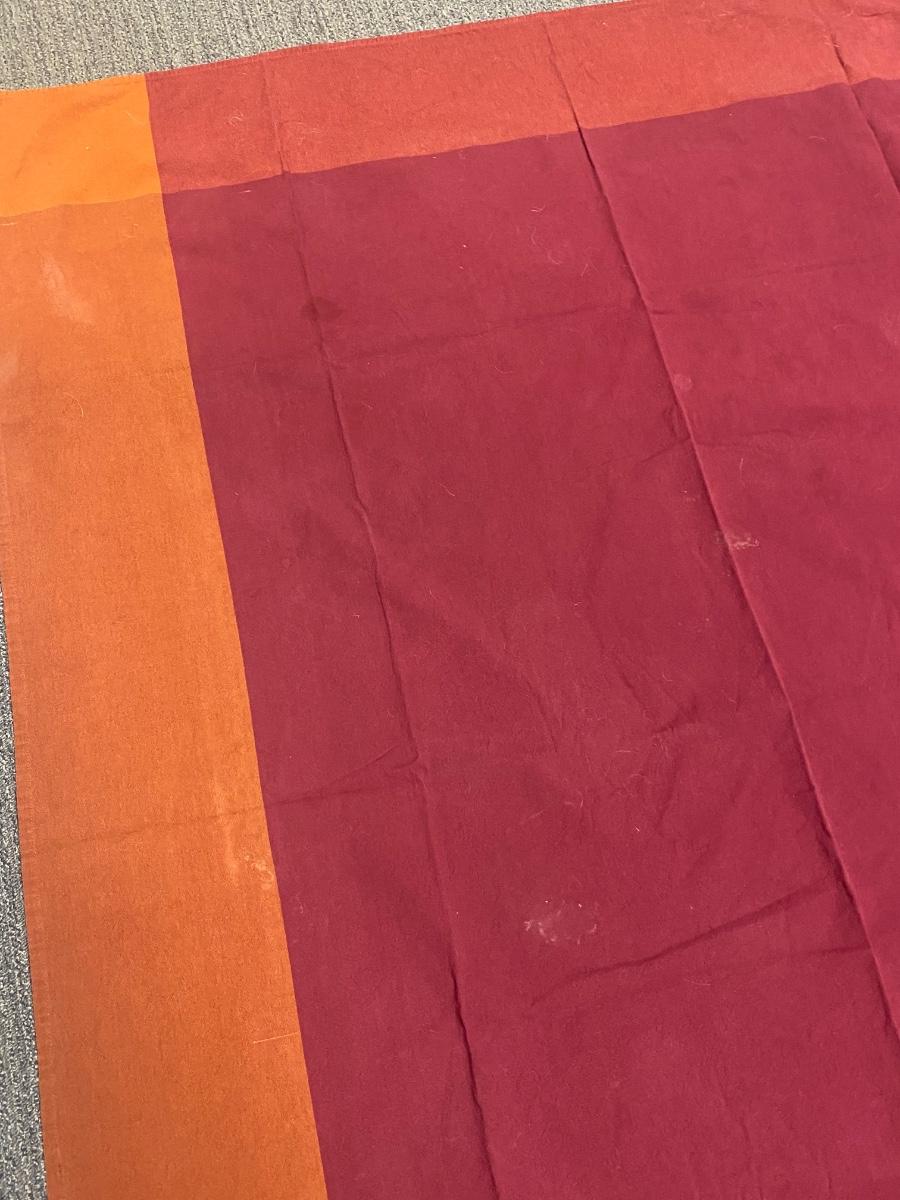 Red and orange color block tablecloth. In fair used condition, some light spots but no holes. About 72"x60".